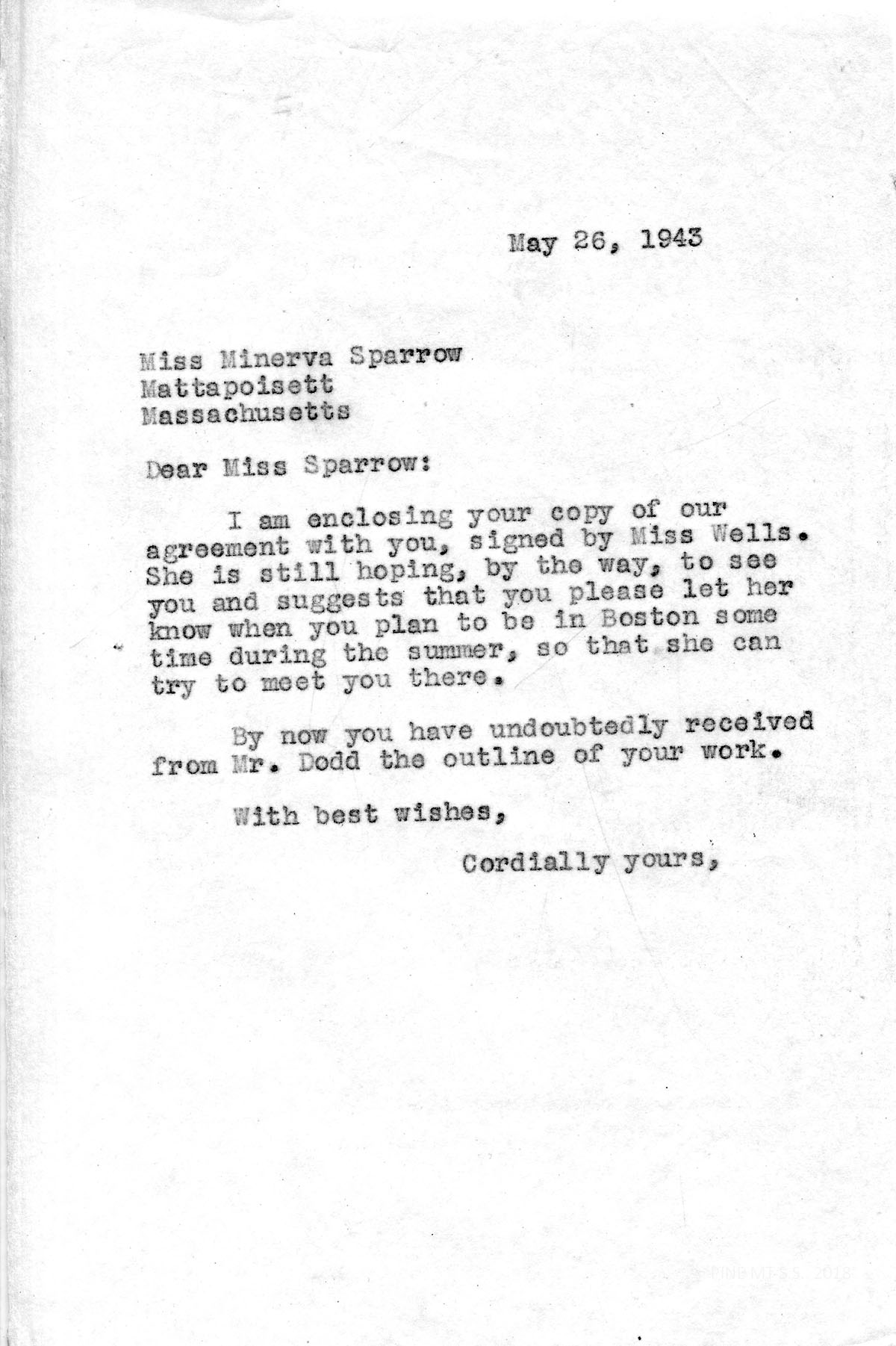 I am enclosing your copy of our agreement with you, signed by Miss Wells. She is still hoping, by the way, to see you and suggests that you please let her know when you plan to be in Boston some time during the summer, so that she can try to meet you there.