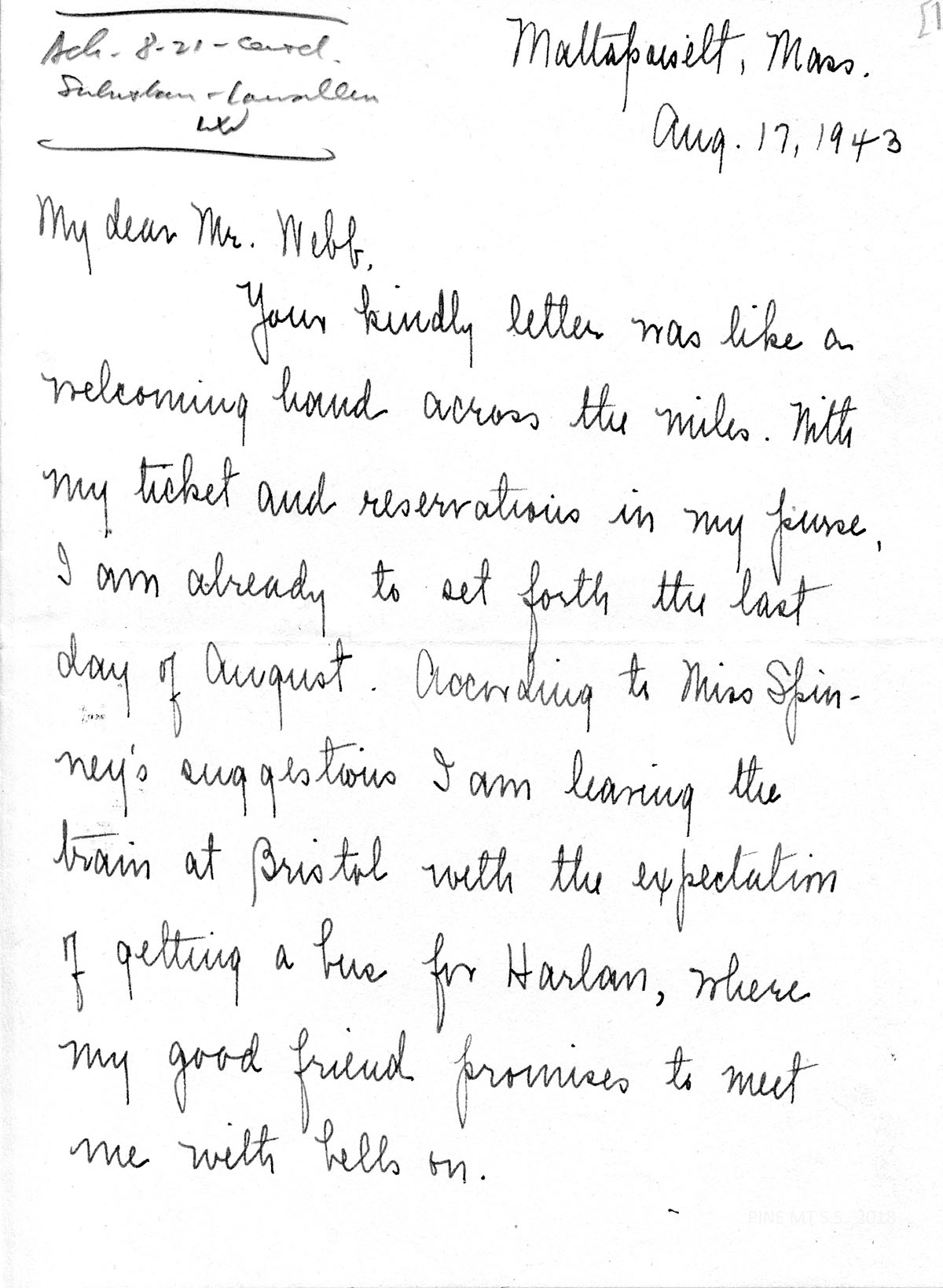 Your kindly letter was like a welcoming hand across the miles. With my ticket and reservations in my purse, I am already to set forth the last day of August. According to Miss Spinney’s suggestions I am leaving the train at Bristol with the expectation of getting a bus for Harlan, where my good friend promises to meet me with bells on.