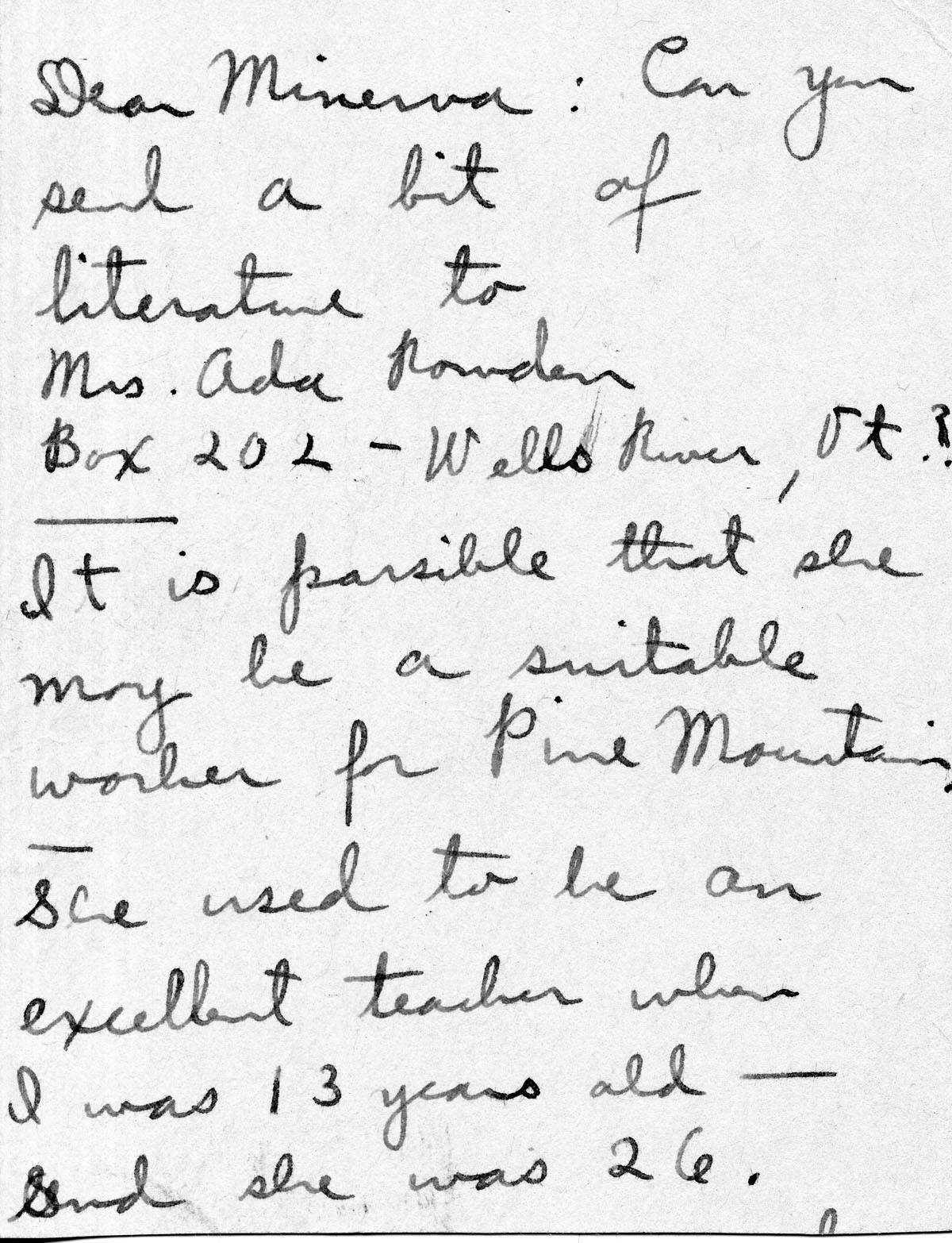 It is possible that she may be a suitable worker for Pine Mountain. She used to be an excellent teacher when I was 13 years old — and she was 26. [truncated]