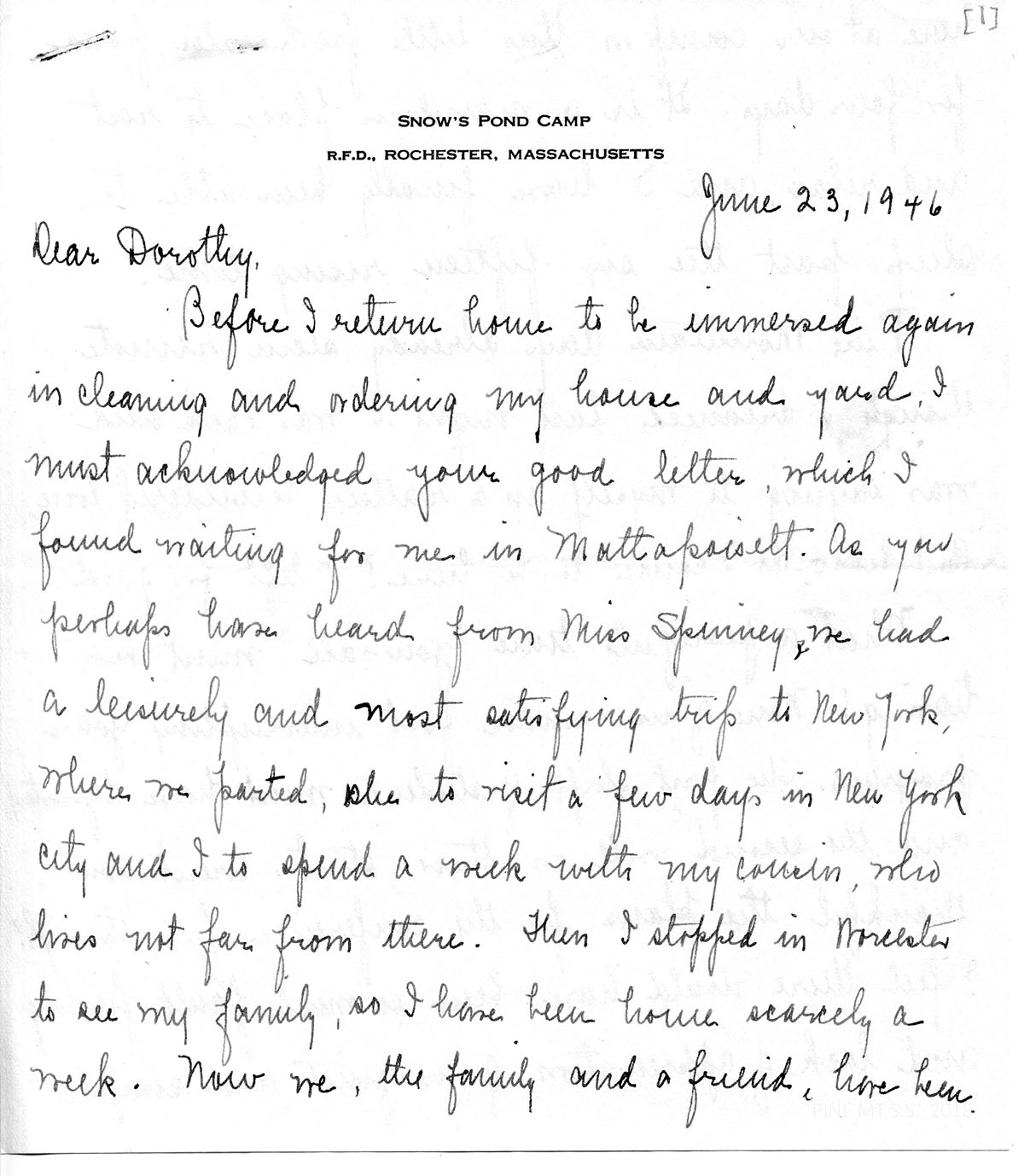 Before I return home to be immersed again in cleaning and ordering my house and yard, I must acknowledge your good letter, which I found waiting for me in Mattapoisett. As you perhaps have heard from Miss Spinney, we had a leisurely and most satisfying trip to New York, where we parted, she to visit a few days in New York City and I to spend a week with my cousin, who lives not far from there. Then I stopped in Worcester to see my family, so I have been home scarcely a week. Now we, the family and a friend, have been–