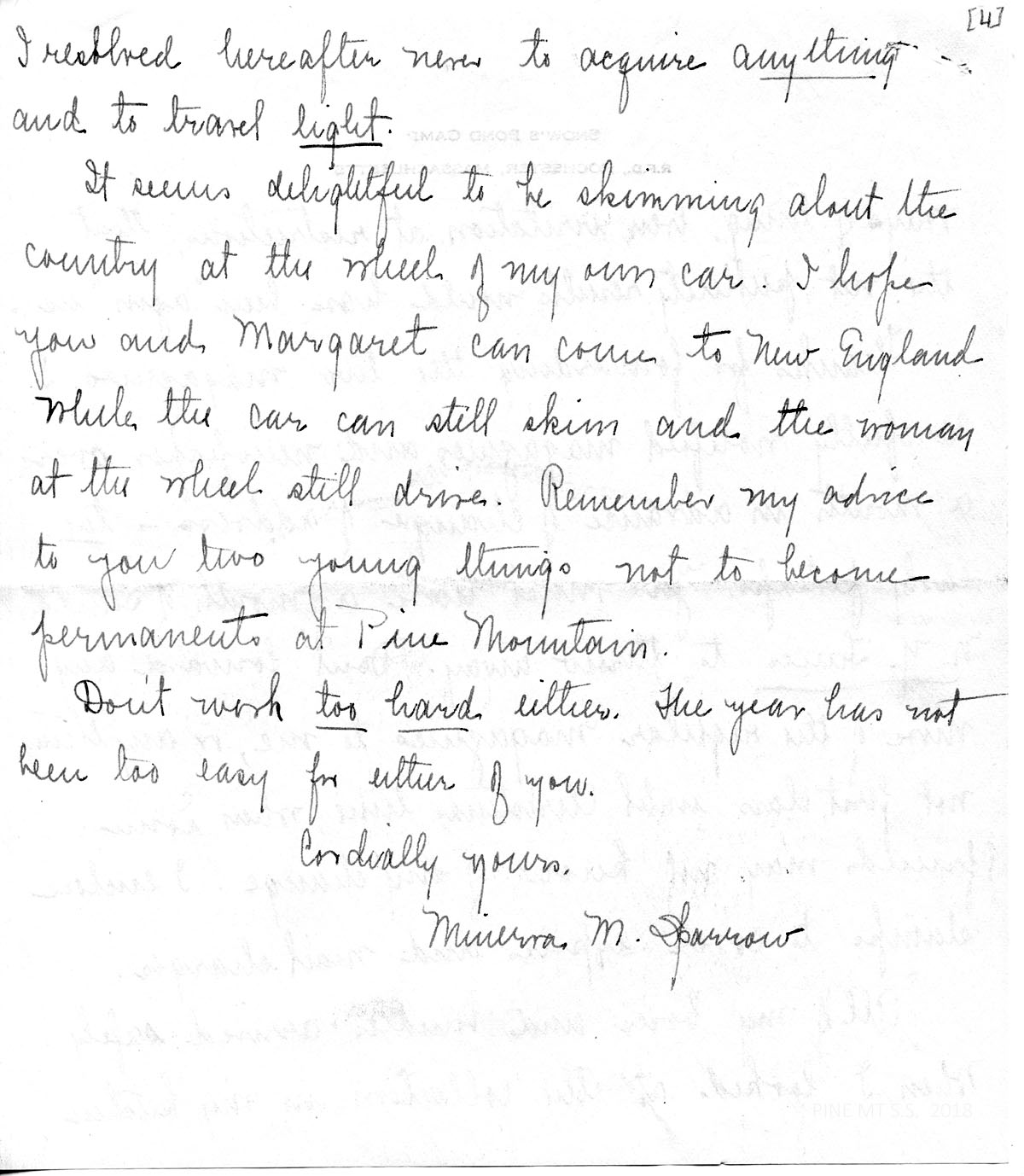 It seems delightful to be skimming about the country at the wheel of my own car. I hope you and Margaret [Nace] can come to New England while the car can still skim and the woman at the wheel still drive. Remember my advice to you two young things not to become permanents at Pine Mountain.