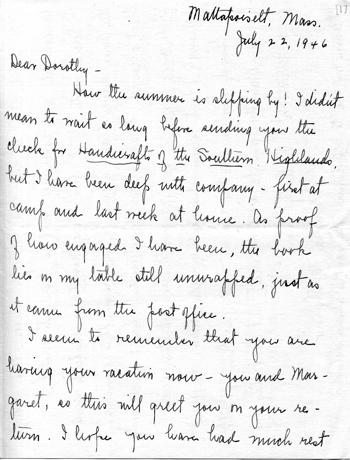 How the summer is slipping by! I didn’t mean to wait as long before sending you the check for Handicrafts of the Southern Highlands, but I have been deep with company — first at camp and last week at home. As proof of how engaged I have been, the book lies on my table still unwrapped, just as it came from the post office.