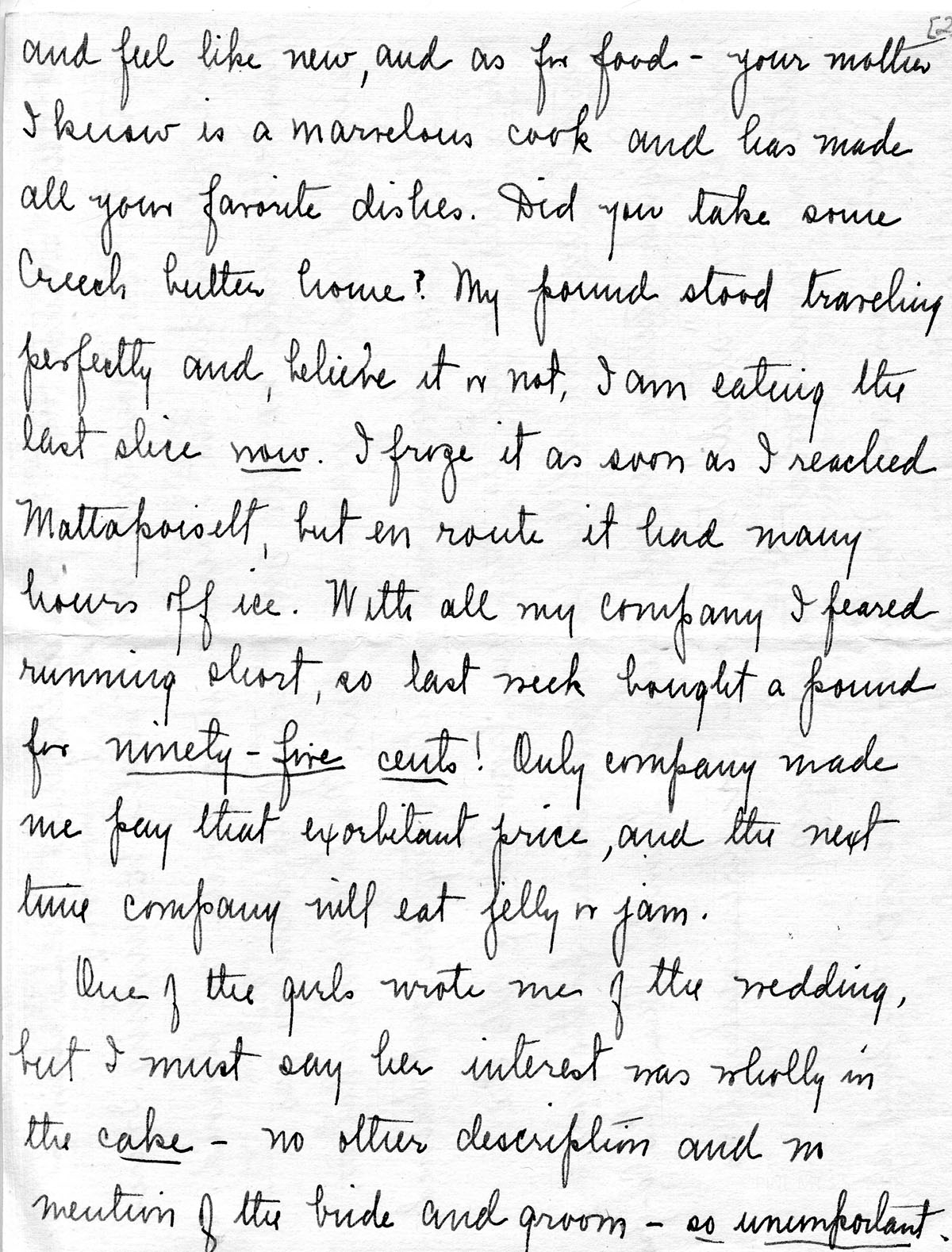 –and feel like new, and as for food — your mother I know is a marvelous cook and has made all your favorite dishes. Did you take some Creech butter home? My pound stood traveling perfectly and, believe it or not, I am eating the last slice now. I froze it as soon as I reached Mattapoisett, but en route it had many hours off ice. With all my company I feared running short, so last week bought a pound for ninety-five cents! Only company made me pay that exorbitant price, and the next time company will eat jelly or jam.