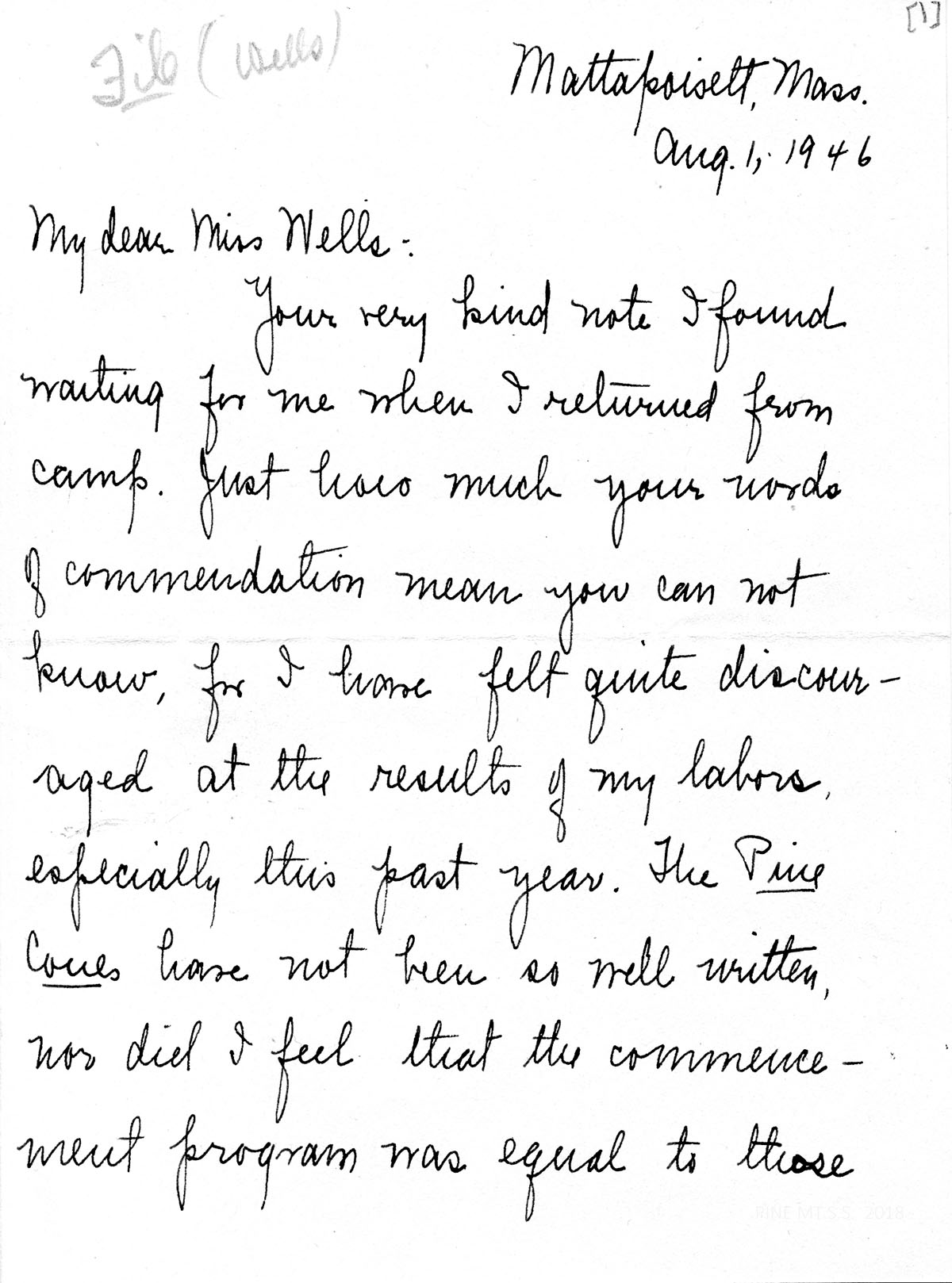 Your very kind note I found waiting for me when I returned from camp. Just how much your words of commendation mean you can not know, for I have felt quite discouraged at the results of my labors, especially this past year. The Pine Cones have not been so well written, nor did I feel that the commencement program was equal to those–