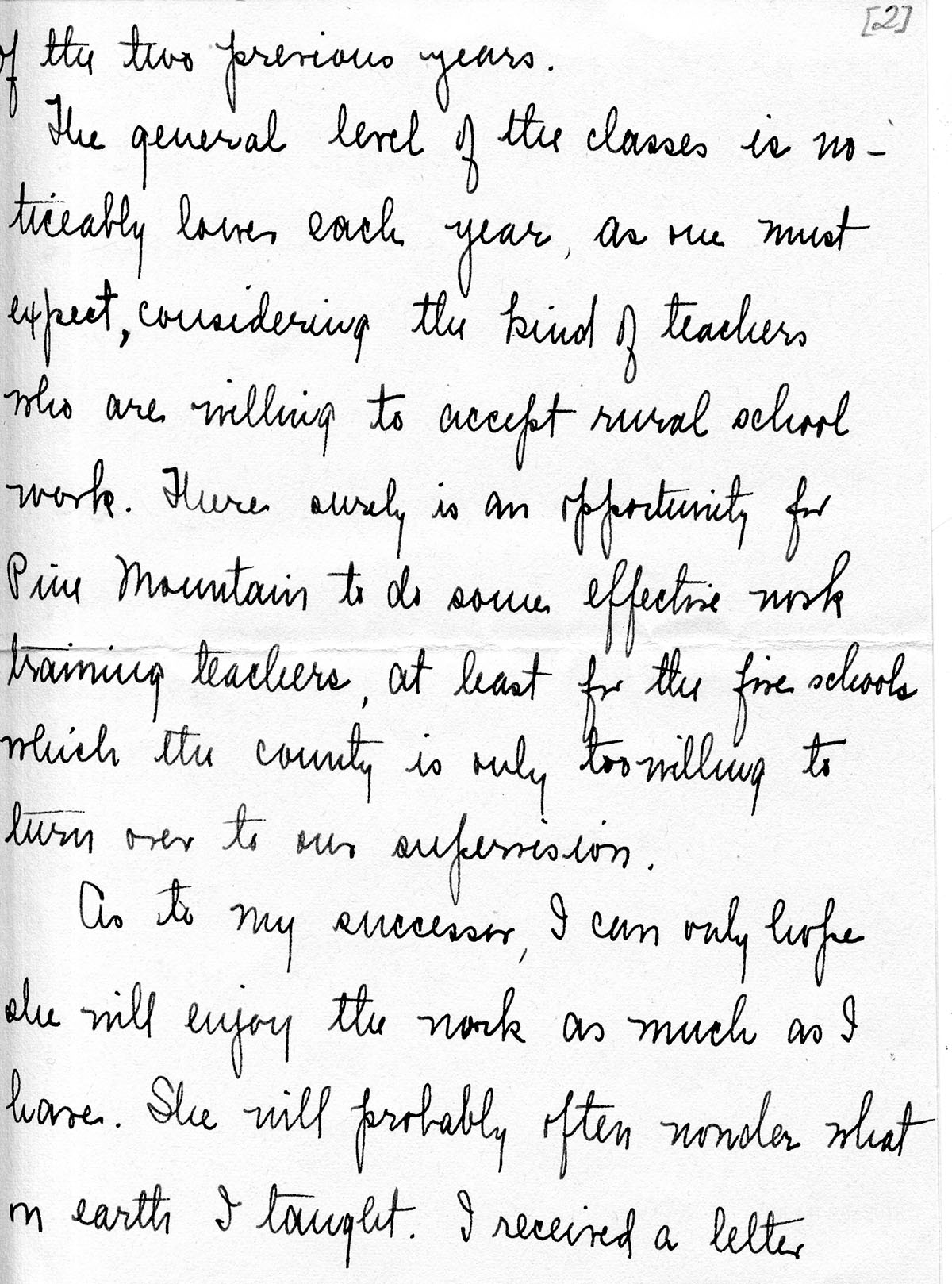 The general level of the classes is noticeably lower each year, as one must expect, considering the kind of teachers who are willing to accept rural school work. There surely is an opportunity for Pine Mountain to do some effective work training teachers, at least for the five schools which the county is only too willing to turn over to our supervision.