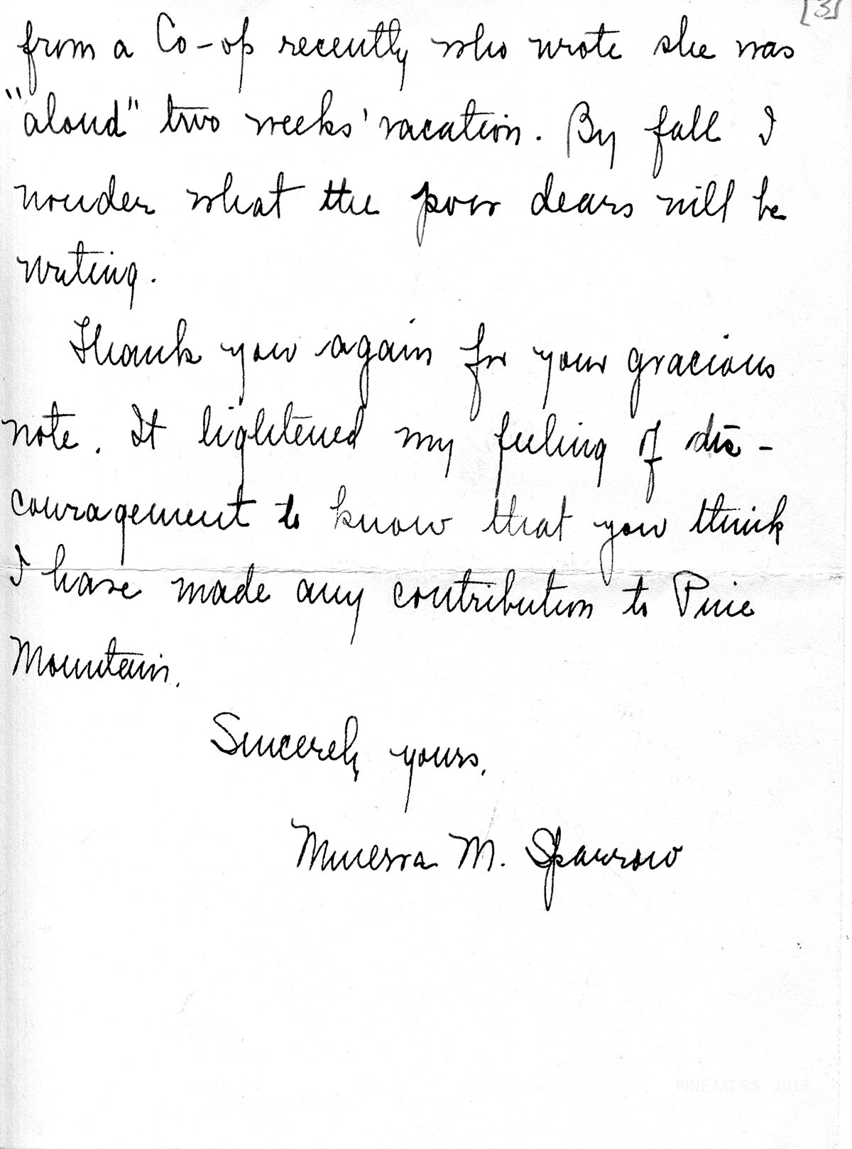 Thank you again for your gracious note. It lightened my feeling of discouragement to know that you think I have made any contribution to Pine Mountain.