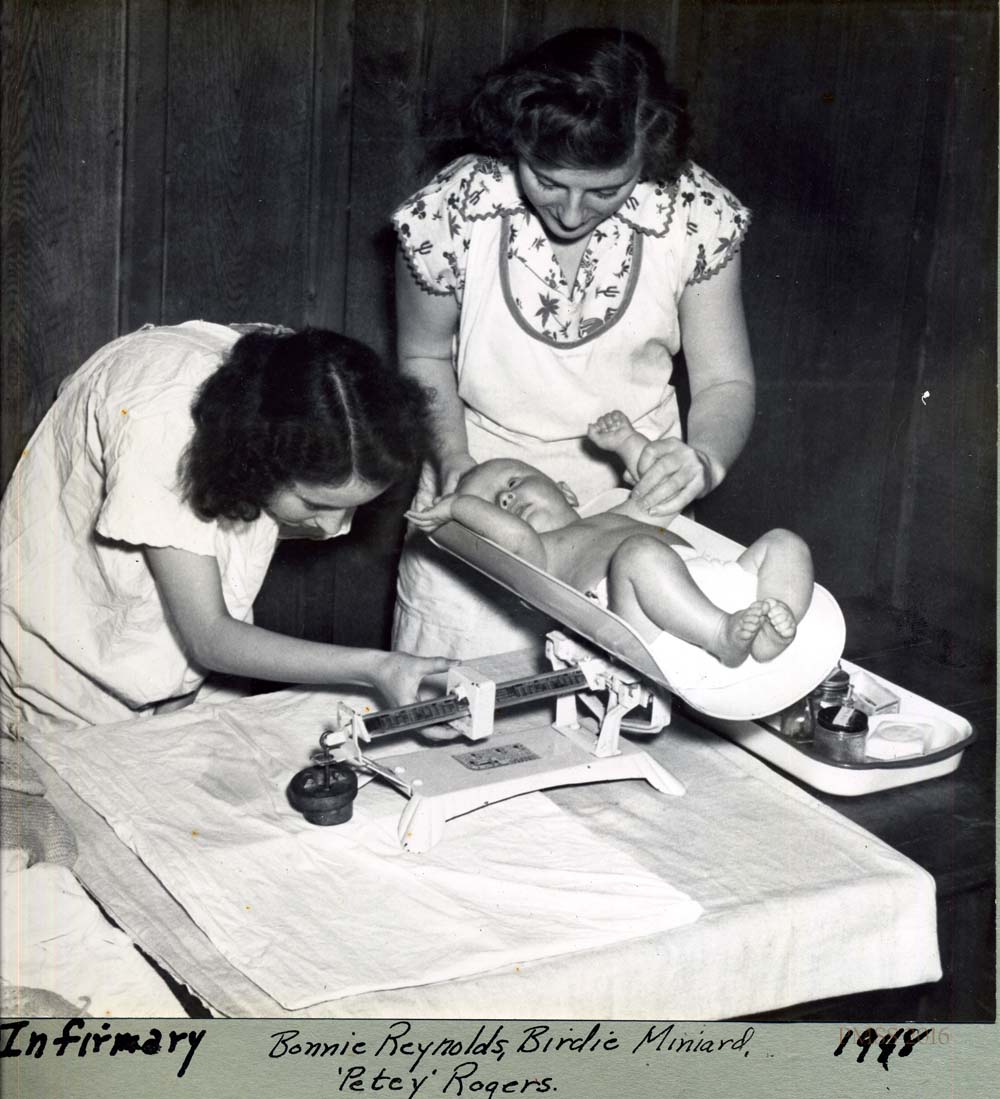 - Infirmary Staff: (left to rt) Dr. Little, Grace M. Rood, Birdie Miniard, Nurse, with newborn infants, 1947. [X_100_workers_2673_mod.jpg]