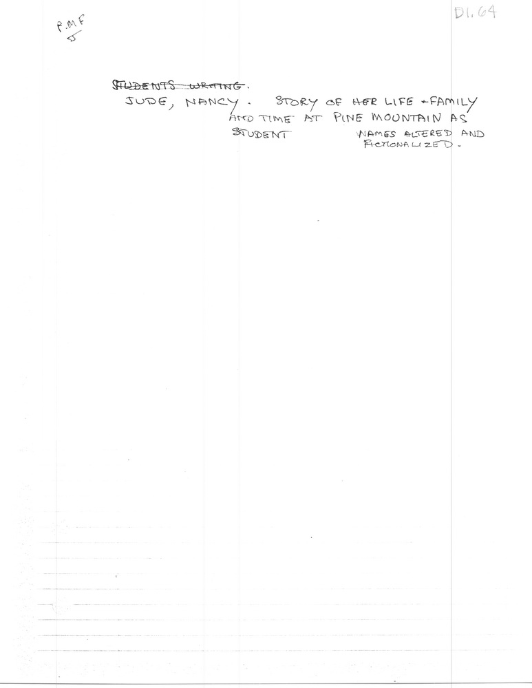 Core documents, correspondence, writings, and administrative papers of Nancy Jude ; clippings, photographs, books by or about Nancy Jude ; Her autobiography was probably written when Nancy Jude was about nineteen years old. She reflects on her life to that point, particularly focusing on how she came to Pine Mountain to go to school and her experiences at Big Laurel in the Extension Center as a student worker. |