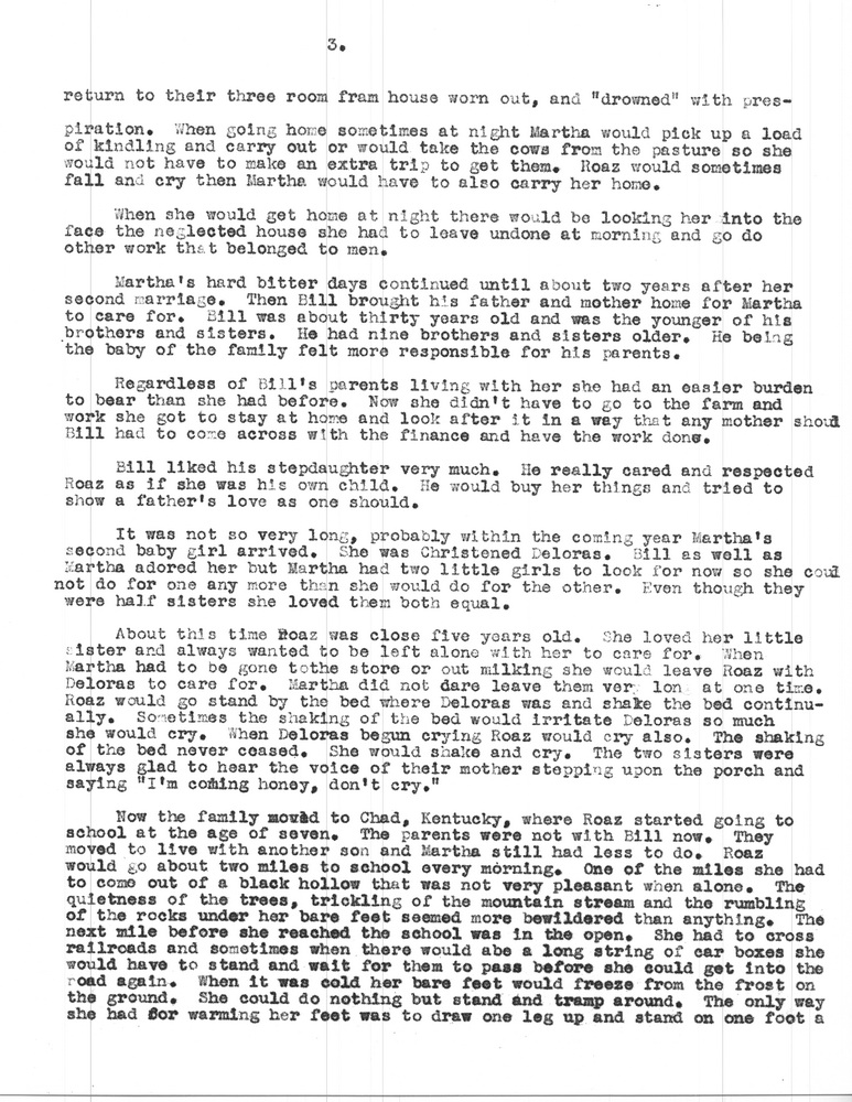 Now the family moved to Chad, Kentucky, where Roaz started going to school at the age of seven. The parents were not with Bill now. They moved to live with another son and Martha still had less to do. Roaz would go about two miles to school every morning. One of the miles she had to come out of a black hollow that was not very pleasant when alone. The quietness of the trees, trickling of the mountain stream and the rumbling of the rocks under her bare feet seemed more bewildered than anything. The next mile before she reached the school was in the open. She had to cross railroads and sometimes when there would a be a long string of car boxes she would have to stand and wait for them to pass before she could get into the road again. When it was cold her bare feet would freeze from the frost on the ground. She could do nothing but stand and tramp around. The only way she had for warming her feet was to draw one leg up and stand on one foot a…