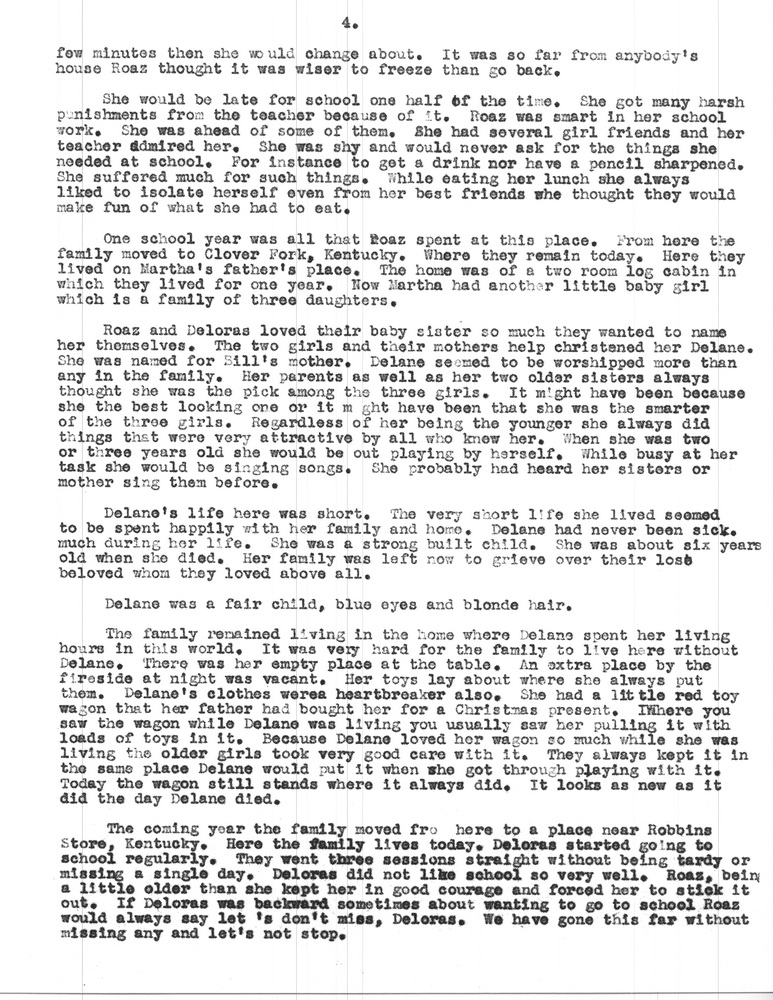 The coming year the family moved from here to a place near Robbins Store, Kentucky. Here the famlly lives today. Deloras started going to school regularly. They went three sessions straight without being tardy or missing a single day. Deloras did not like school so very well. Roaz, being a little older than she, kept her in good courage and forced her to stick it out. If Deloras was backward sometimes about wanting to go to school Roaz would always say, “Let’s don’t miss, Deloras. We have gone this far without missing any and let’s not stop.”