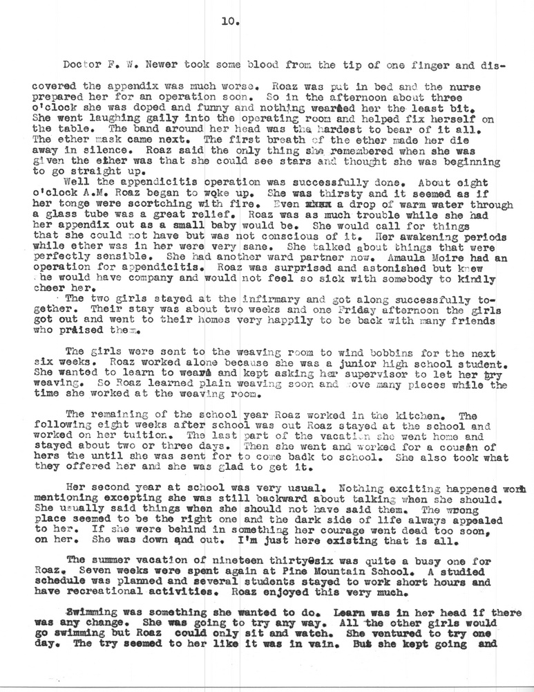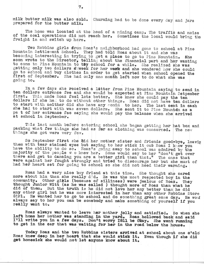 Two Robbins girls from Roaz’s neighborhood had gone to school at Pine Mountain Settlement School. They had told Roaz about it and she was becoming interesting (sic) in trying to get a place to go to Pine Mountain. She soon wrote to the Director, telling about the financial part and her wanting to come to Pine Mountain to try school for a while. She realized she was getting only two dollars a week for her work and she wondered how she could go to school and buy clothes in order to get started when school opened the first of September. She had only one month left now to do what she was going to [do].