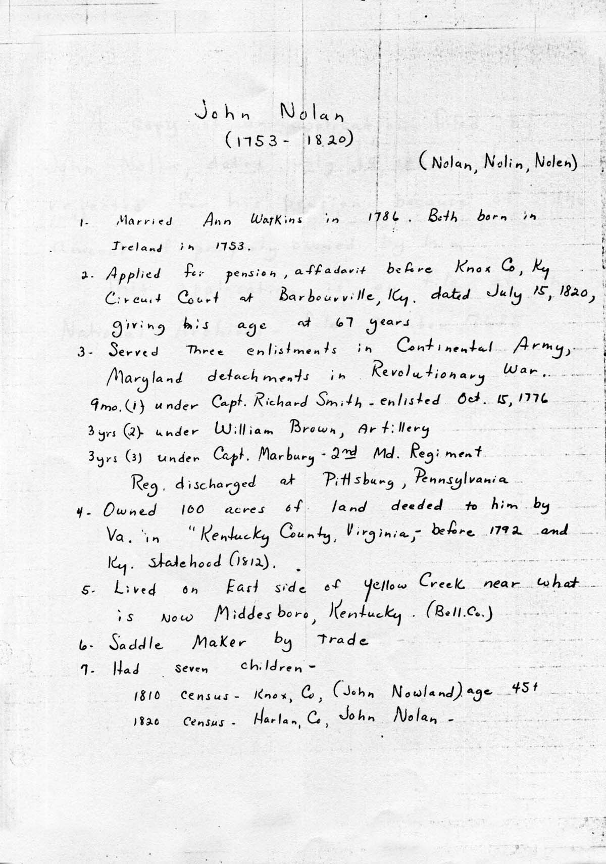 05, page 1. Handwritten narrative describing the descendants of John Nolan (1753-1820), who fought in the Revolutionary War. [incomplete]