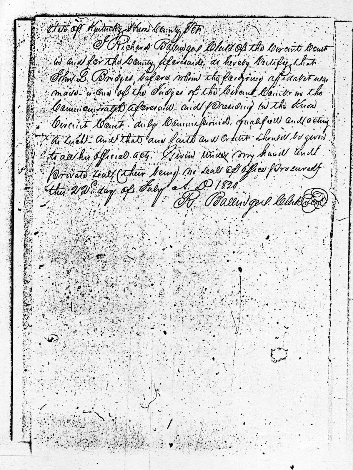 09, page 3. Continuation of 008: Clerk of the Circuit Court Richard Ballinger (?) certifies that John L. Bridges is one of the Judges of the Circuit Court in the Commonwealth and presiding in the Knox Circuit Court, July 22, 1820.
