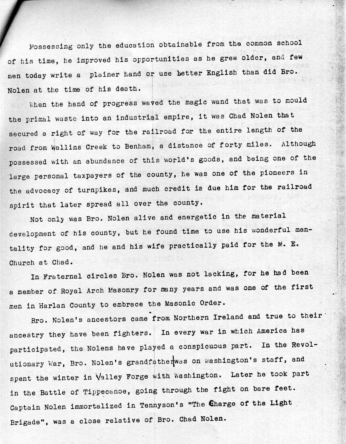 13, page 1. Typewritten narrative titled “Oldest Mason in Harlan County,” Chadwell F.C. Nolen [sic], (1845-1923); describes his family, life, military service, contributions to his community and his history with the Masonic Fraternity.