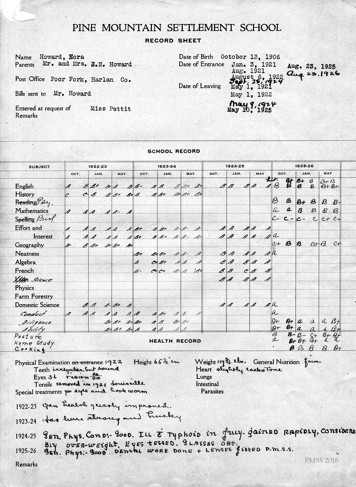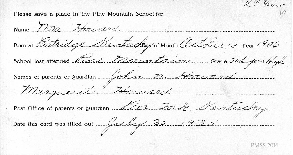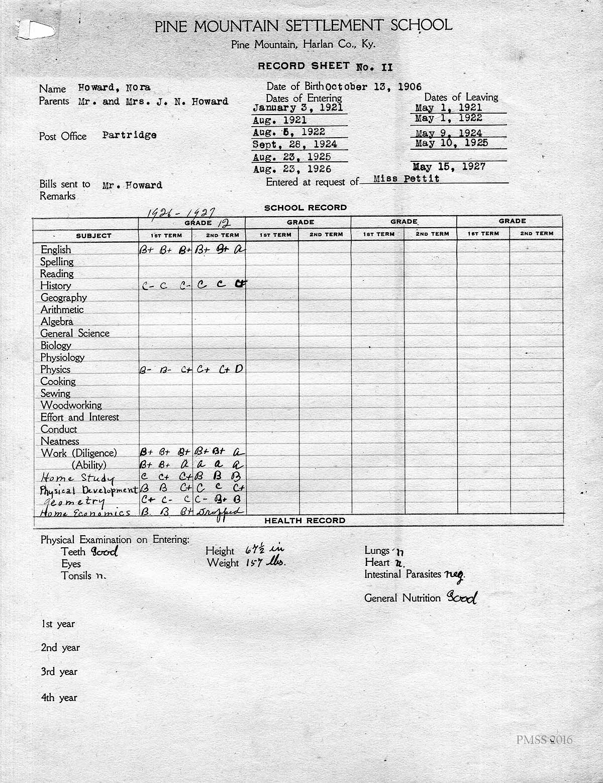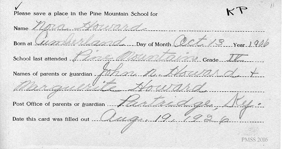“Howard, Nora.” Student Records. Series 09: BIOGRAPHY & Series 19: STUDENTS. Pine Mountain Settlement School Institutional Papers. Pine Mountain Settlement School, Pine Mountain, KY. Archival material.