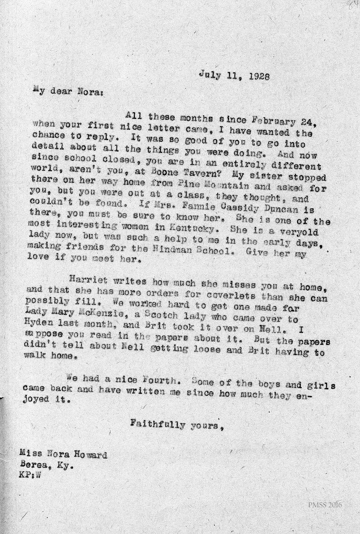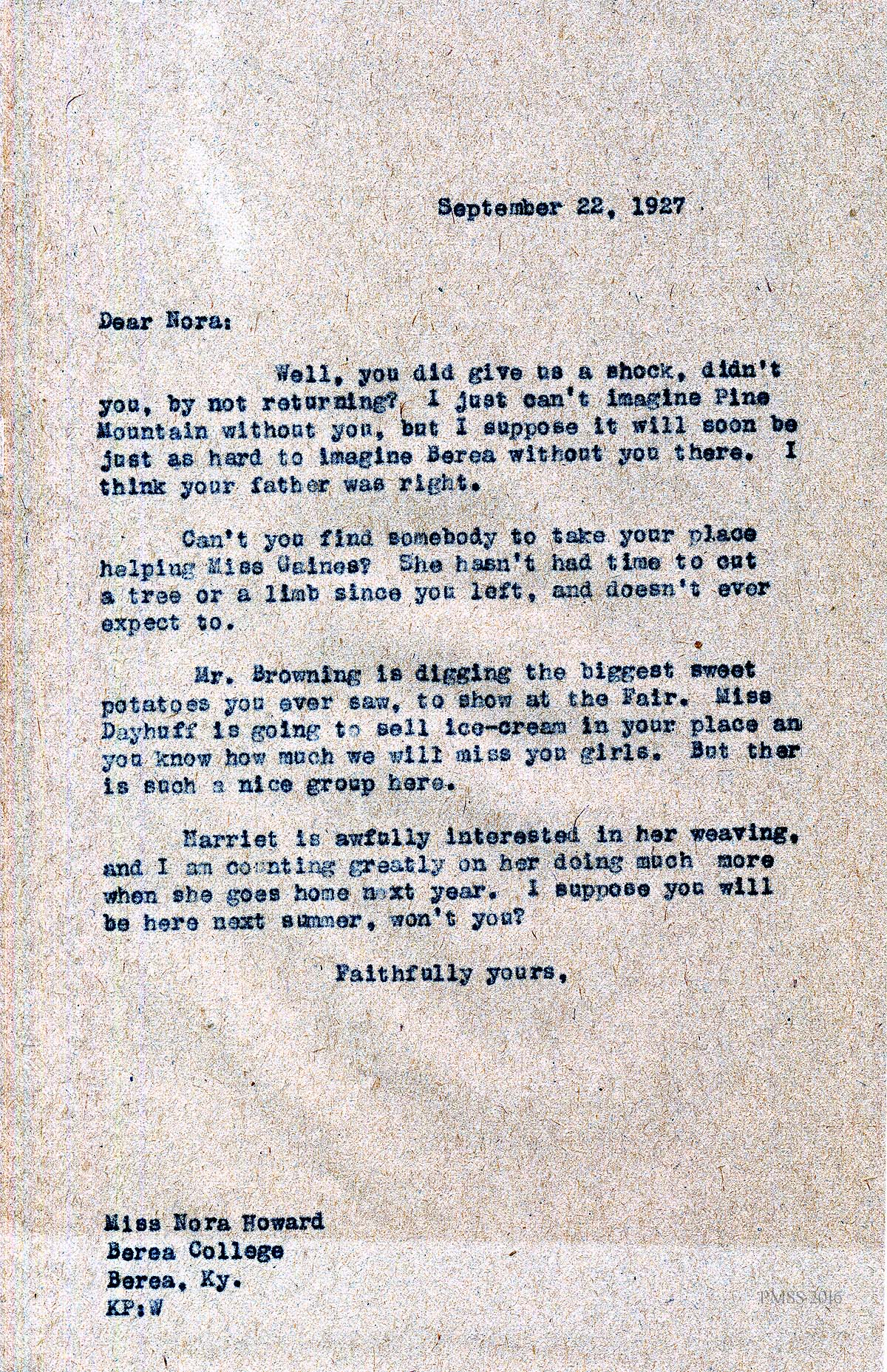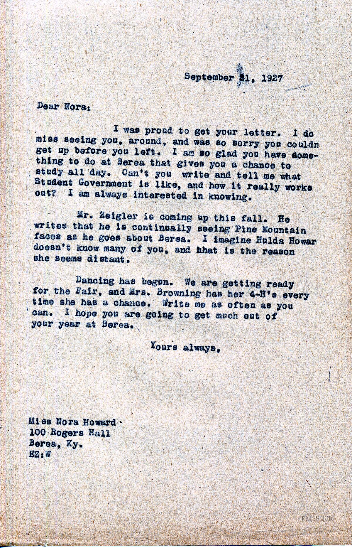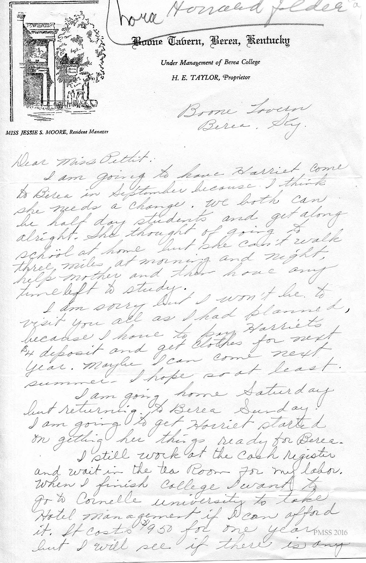 Nora first attended Pine Mountain Settlement School in 1921 as a fifth-grader [age 15] and apparently completed grade school in 1923 at age 17. She then attended part of high school, leaving the School for Berea (KY) College in the Fall of 1927. By September 1927, Nora was writing from Berea College where she was working at Boone Tavern and going to school [?]. She was then 21 years old. Harriet remained at Pine Mountain, but by 1928 her sister Nora was working to enroll her at Berea.