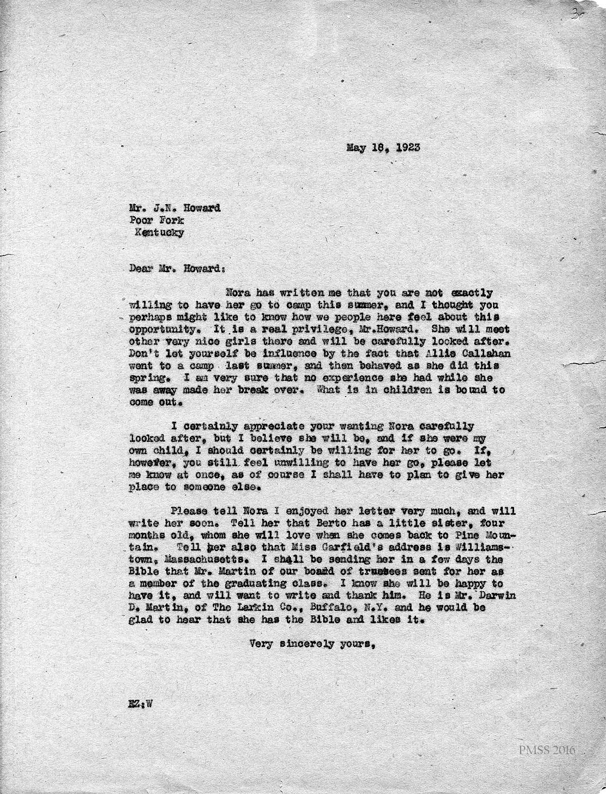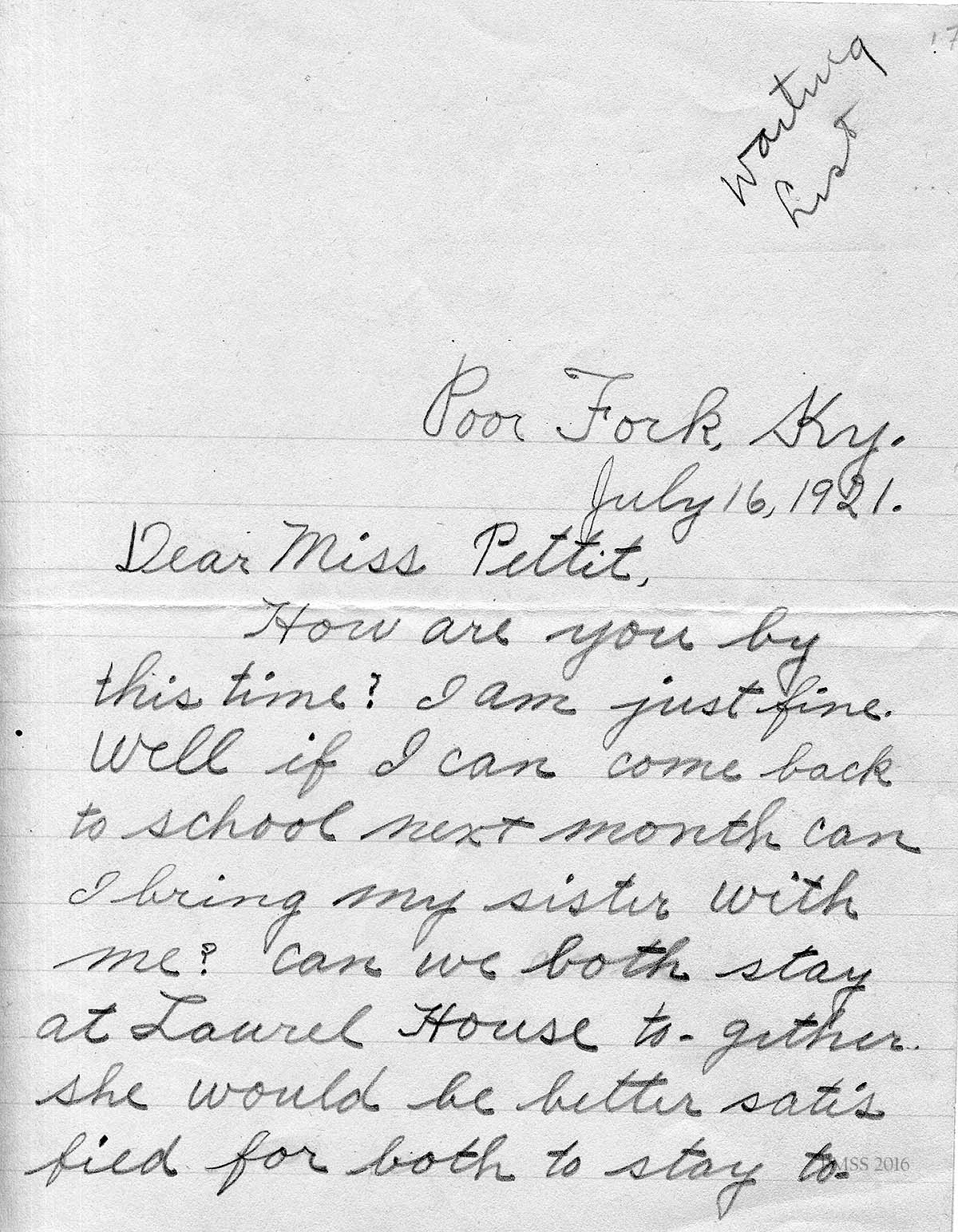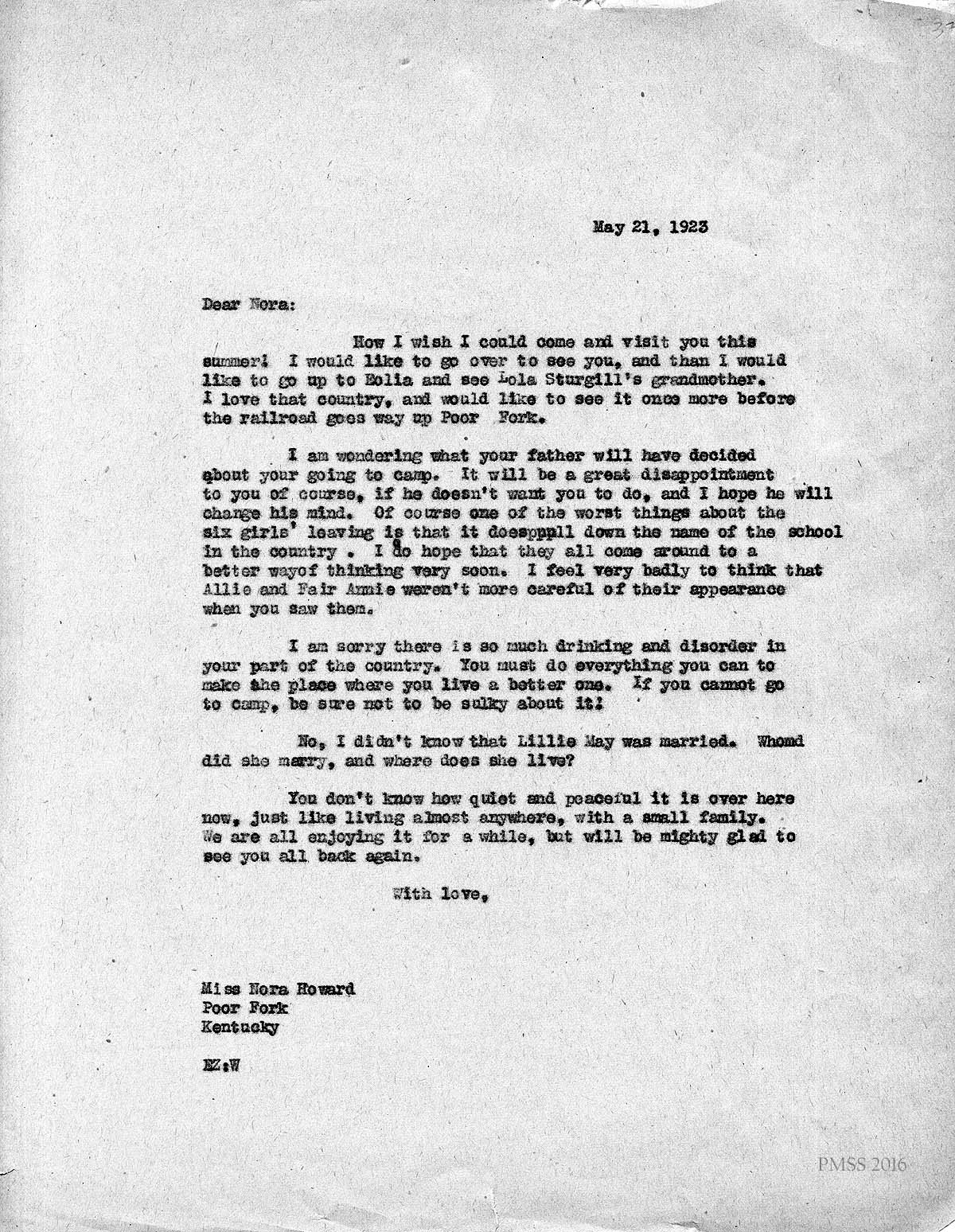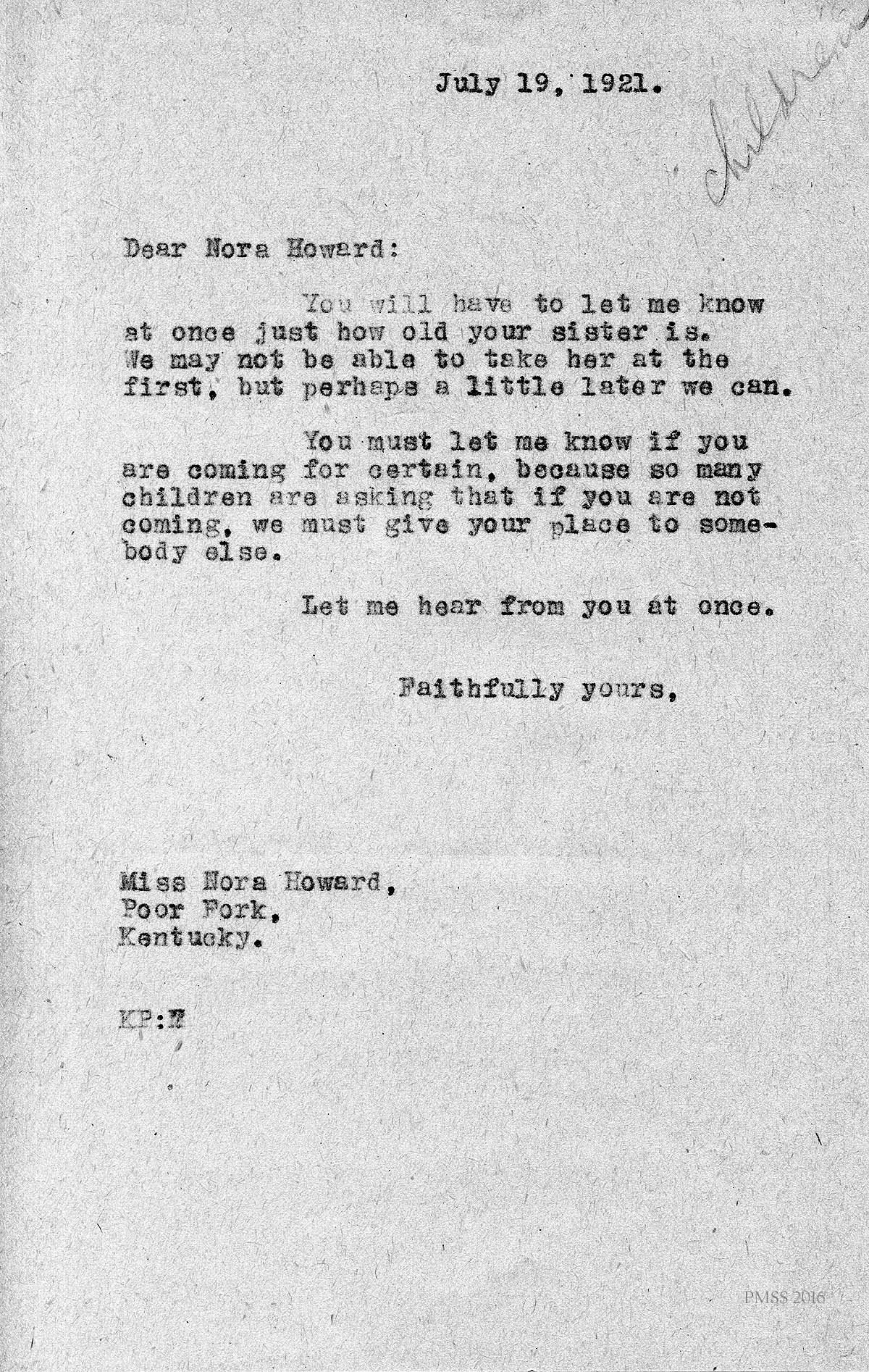 Although Nora was born in Partridge, Kentucky, (October 13, 1907), another record also shows her birthplace as Cumberland, Kentucky. She was admitted to Pine Mountain in 1921 when she was in the 4th grade. She was first placed on a waiting list but was then accepted. Also in 1921, Nora wrote to Katherine Pettit and appealed to Pine Mountain to allow her younger sister, Harriet, to also attend the School. Katherine Pettit noted that her sister was too young (under 14) to attend at the time. Hattie was finally admitted to join her sister in the Fall of 1922.