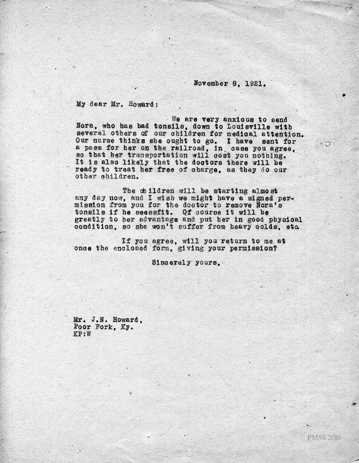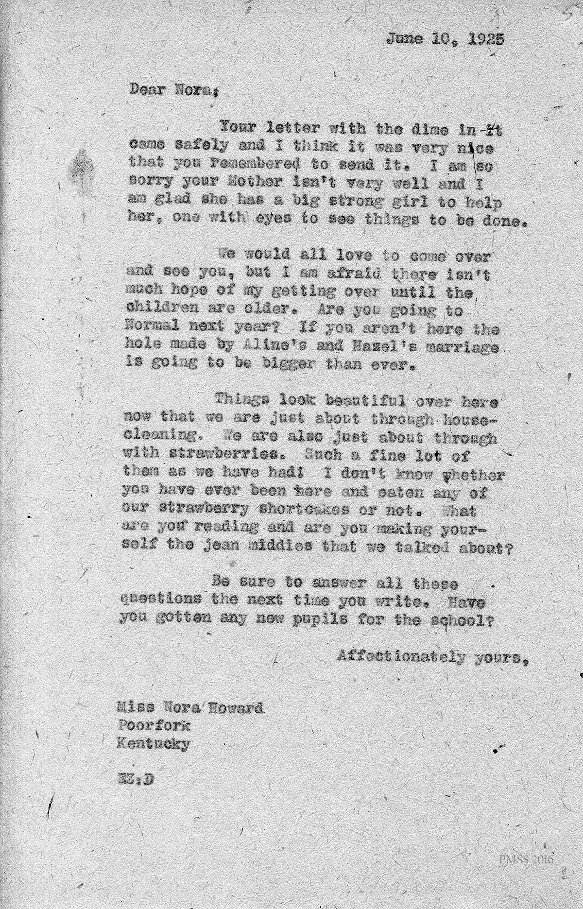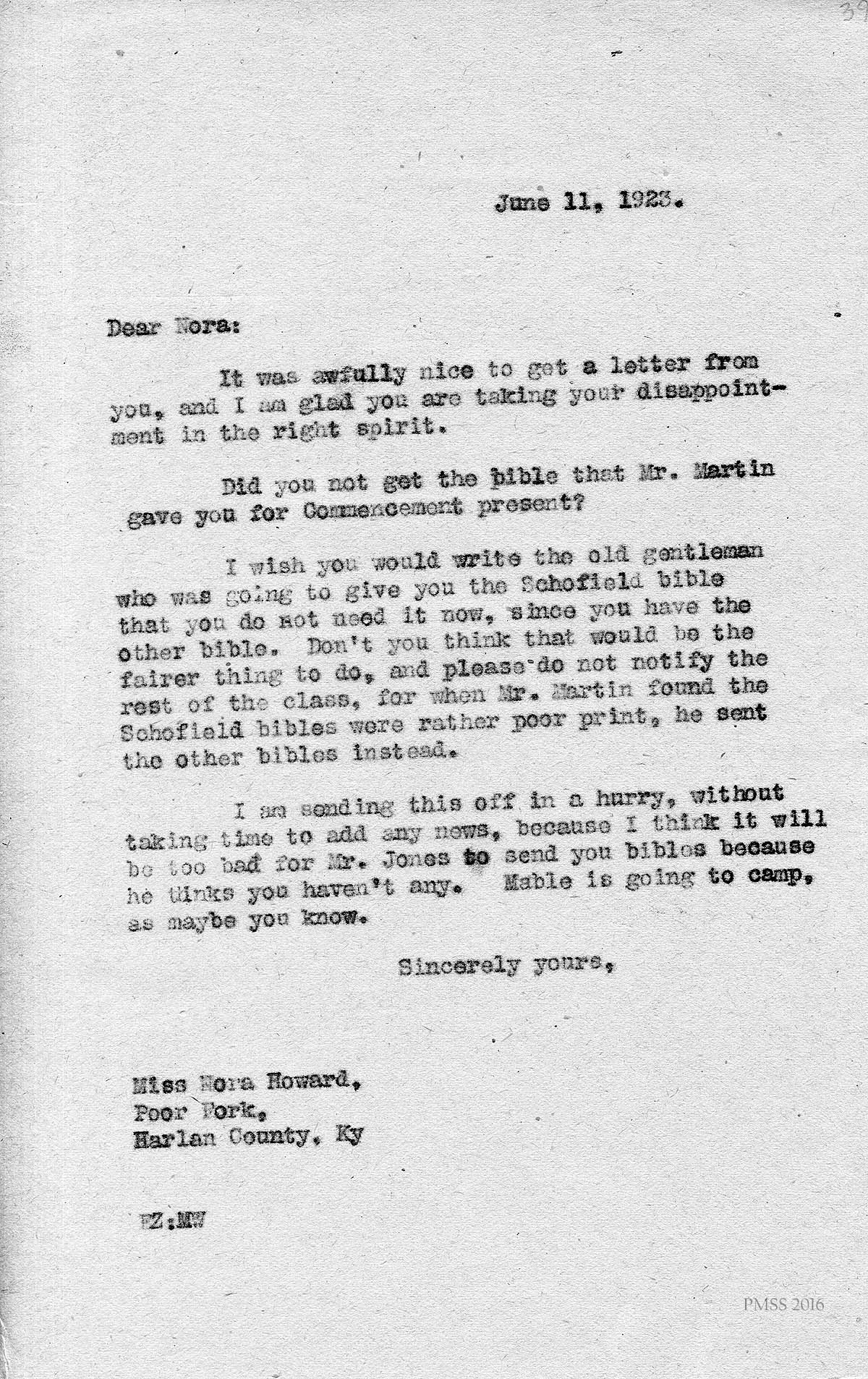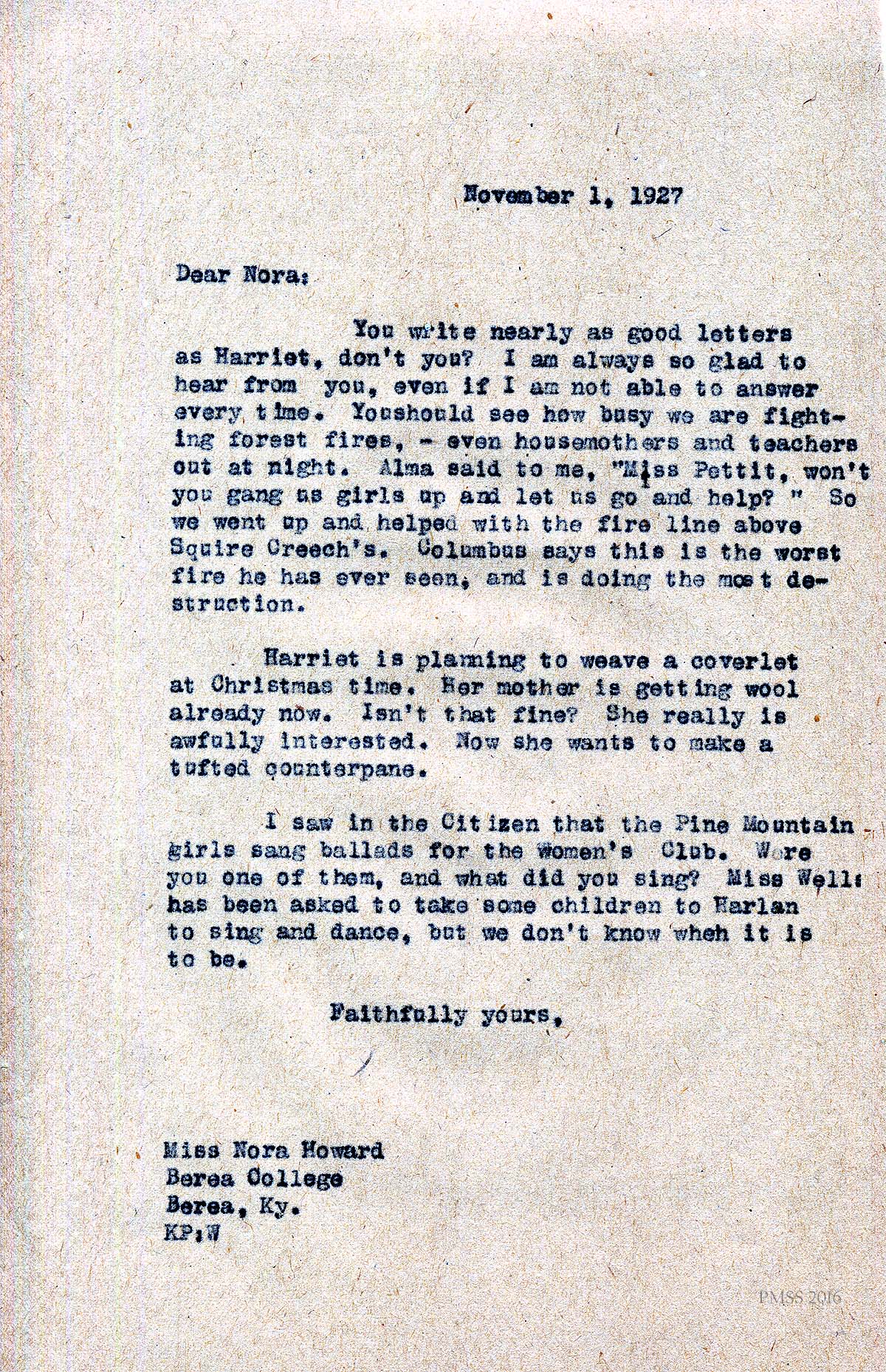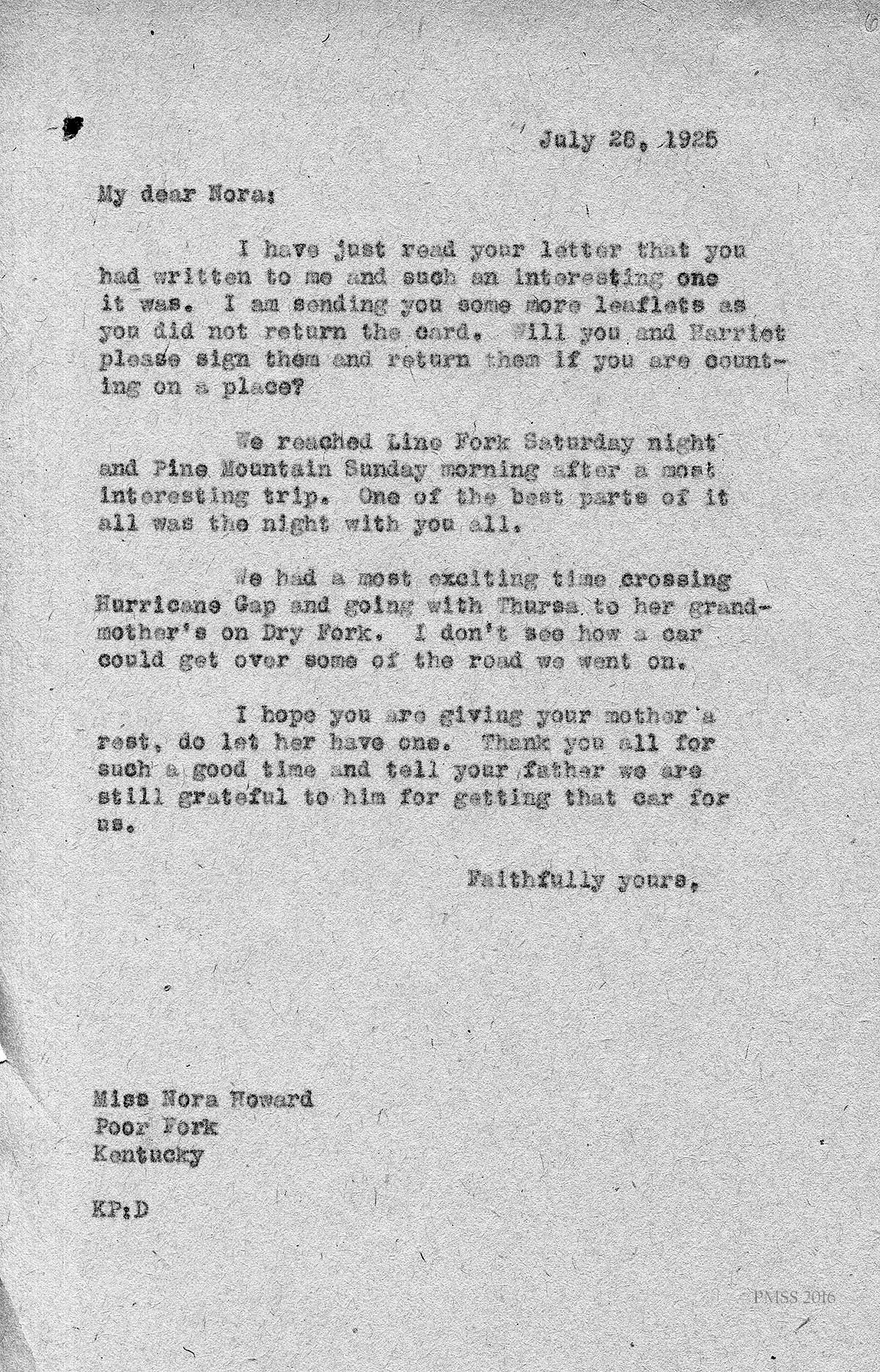 Although Nora was born in Partridge, Kentucky, (October 13, 1907), another record also shows her birthplace as Cumberland, Kentucky. She was admitted to Pine Mountain in 1921 when she was in the 4th grade. She was first placed on a waiting list but was then accepted. Also in 1921, Nora wrote to Katherine Pettit and appealed to Pine Mountain to allow her younger sister, Harriet, to also attend the School. Katherine Pettit noted that her sister was too young (under 14) to attend at the time. Hattie was finally admitted to join her sister in the Fall of 1922.