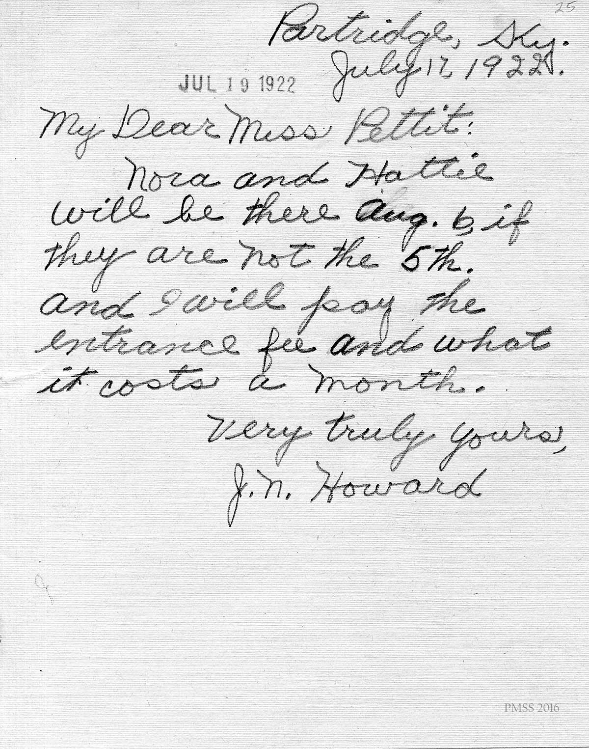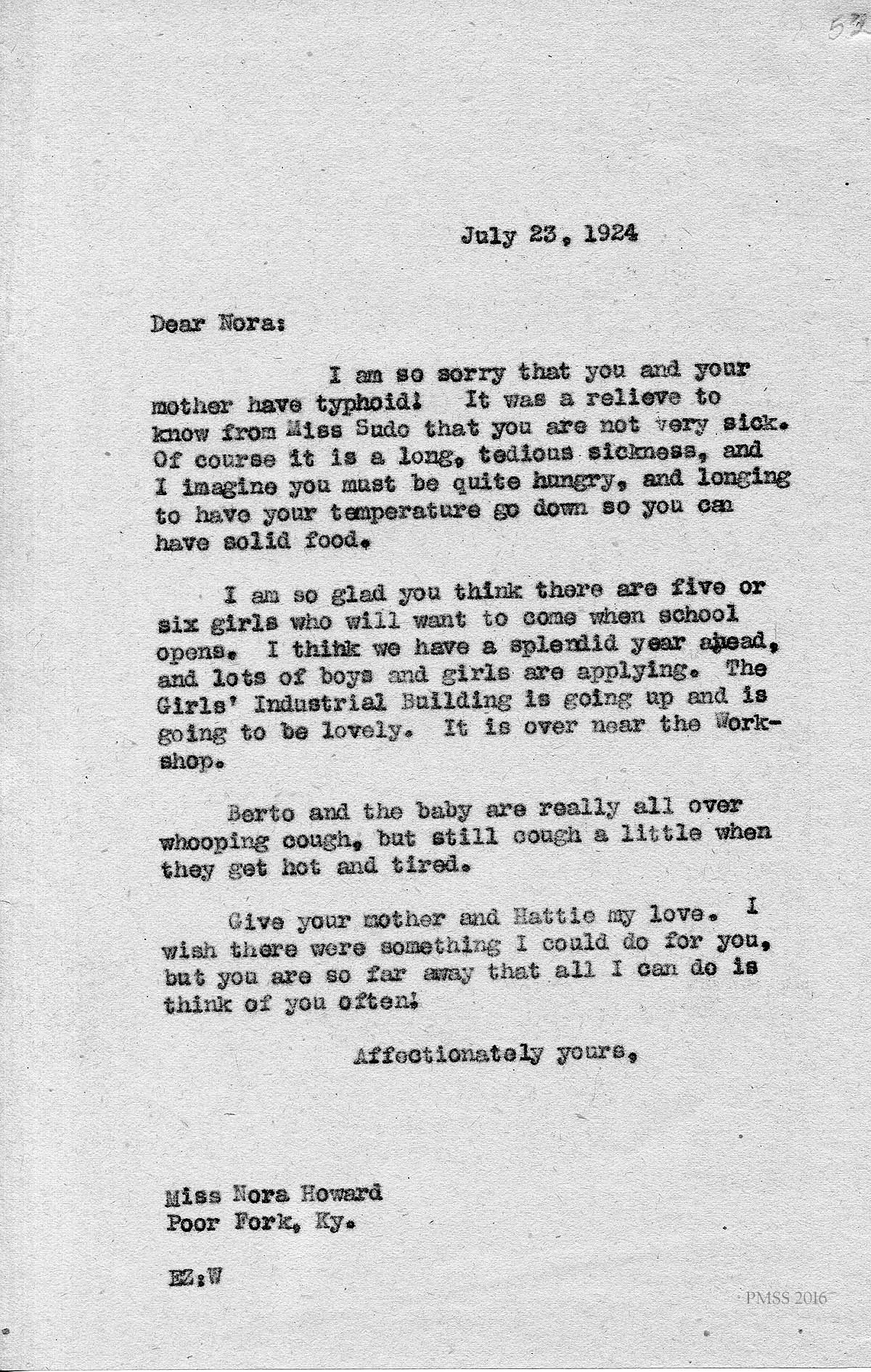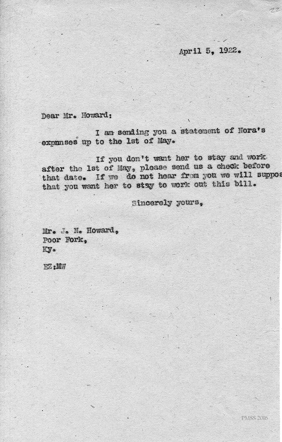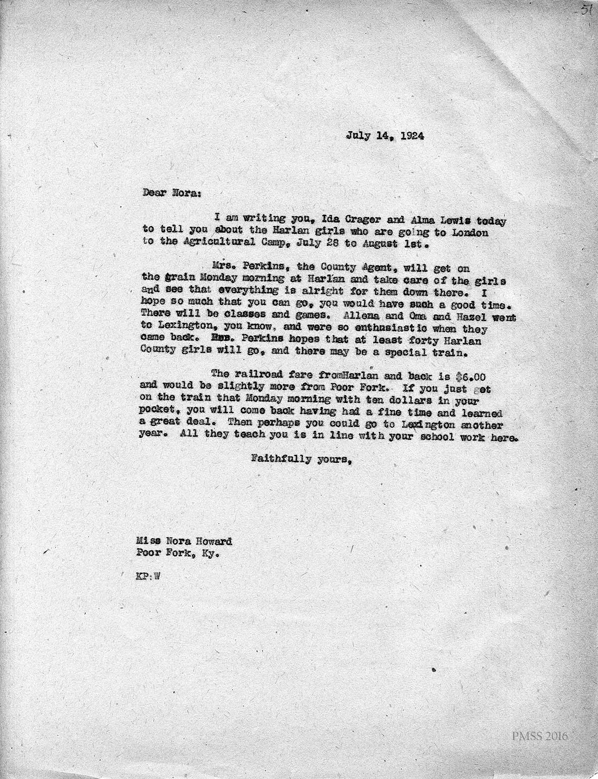 Although Nora was born in Partridge, Kentucky, (October 13, 1907), another record also shows her birthplace as Cumberland, Kentucky. She was admitted to Pine Mountain in 1921 when she was in the 4th grade. She was first placed on a waiting list but was then accepted. Also in 1921, Nora wrote to Katherine Pettit and appealed to Pine Mountain to allow her younger sister, Harriet, to also attend the School. Katherine Pettit noted that her sister was too young (under 14) to attend at the time. Hattie was finally admitted to join her sister in the Fall of 1922.