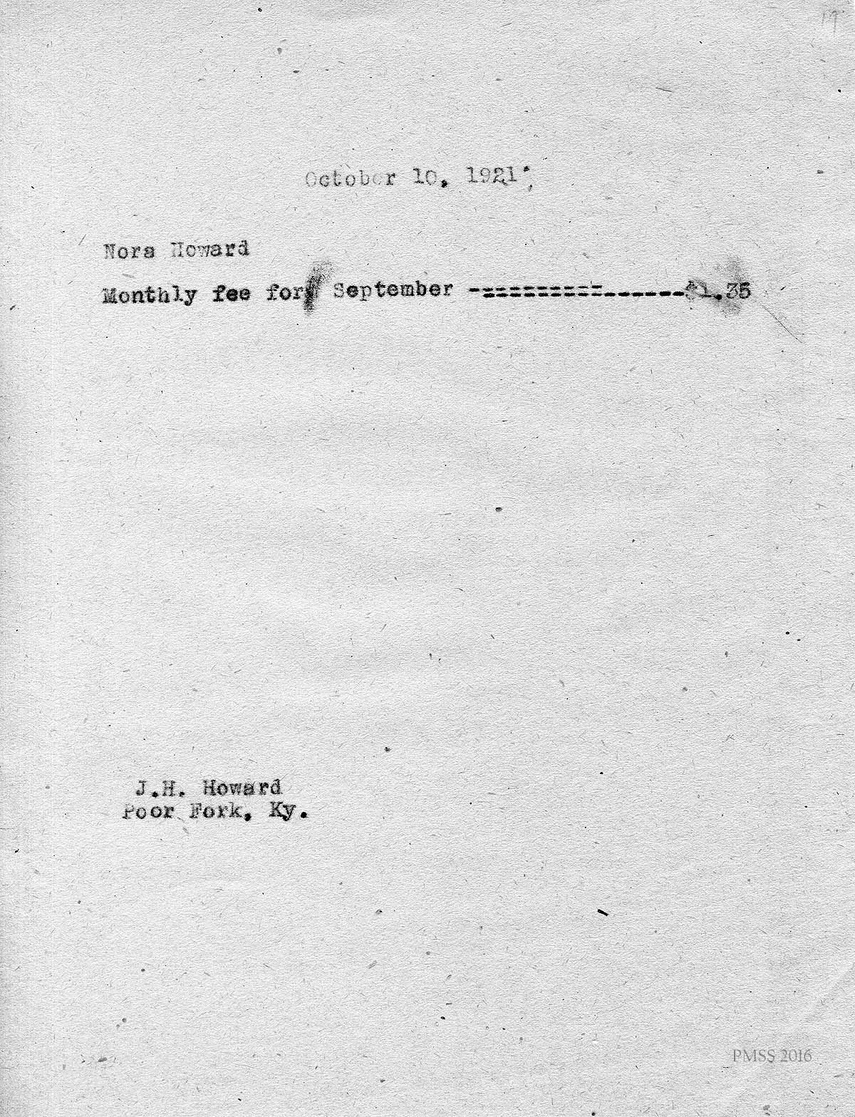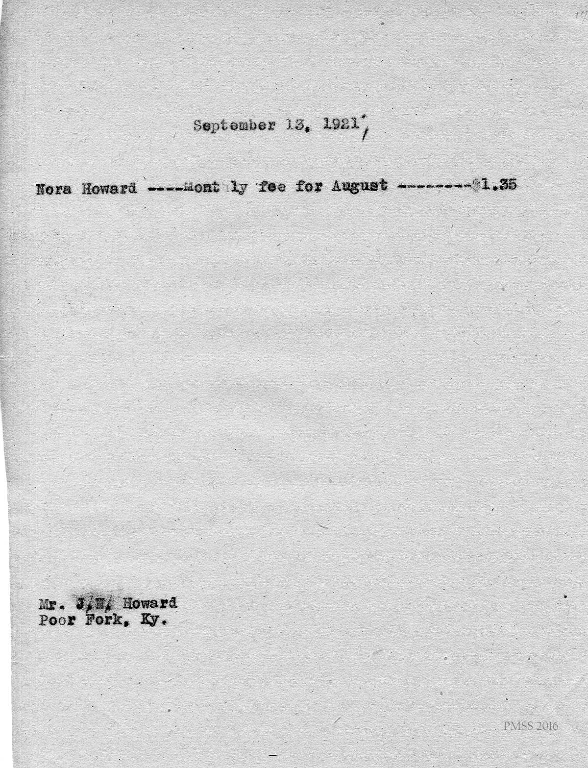 Nora Howard was a student at Pine Mountain Settlement School during the Boarding School years from January 3, 1921, until May 27, 1927. Both Nora and her sister, Harriet (“Hattie”) Howard, who later attended Pine Mountain, were born in Partridge, Kentucky, where their father, John N. Howard, worked as a farmer and a miner. Margaret Jane Jenkins Howard, the mother of Nora and Hattie, lived for a time at Wallins Creek, Kentucky, and in 1925 her address was Poor Fork, Kentucky. Later, the family moved to Laurel County, Kentucky, where John Howard farmed.