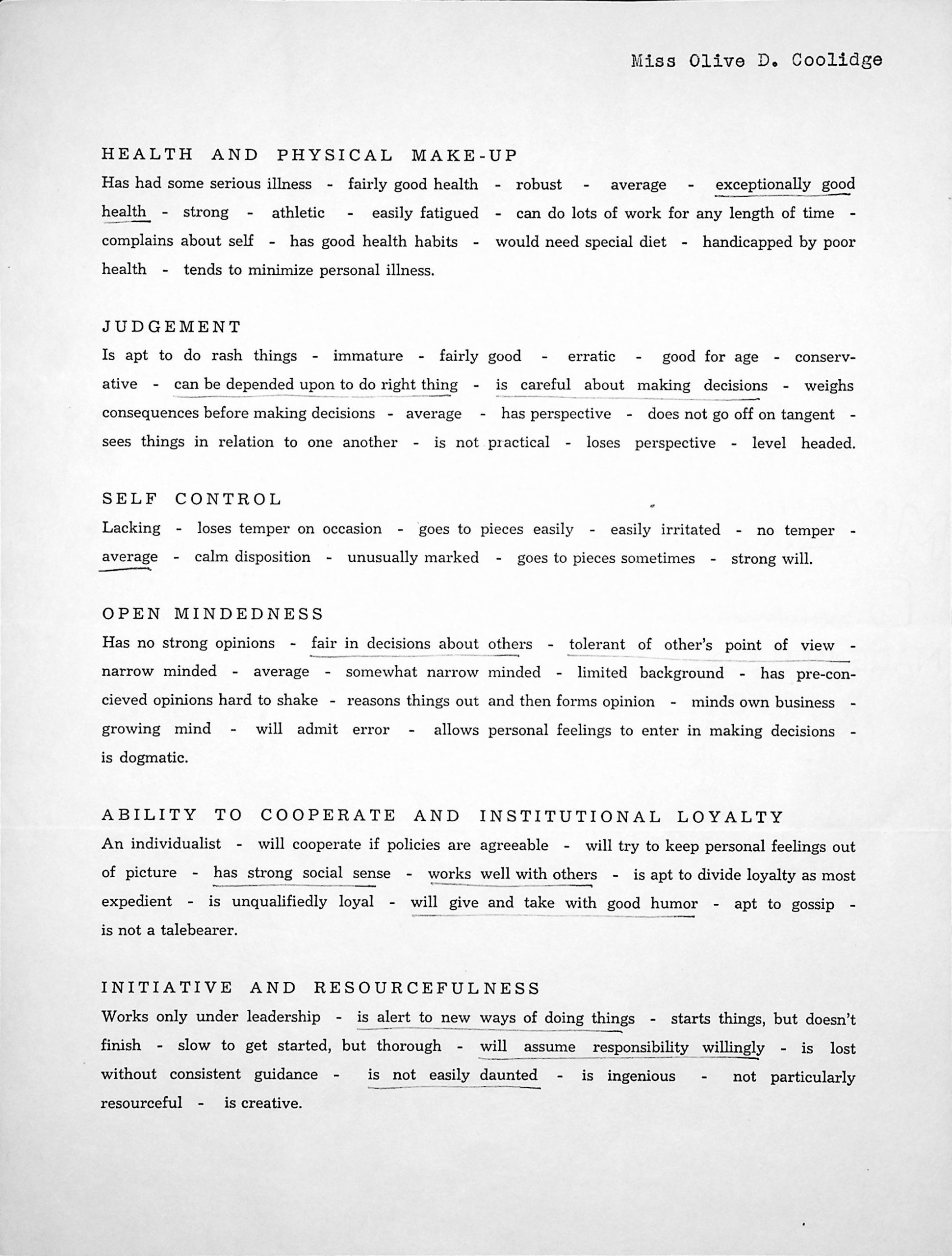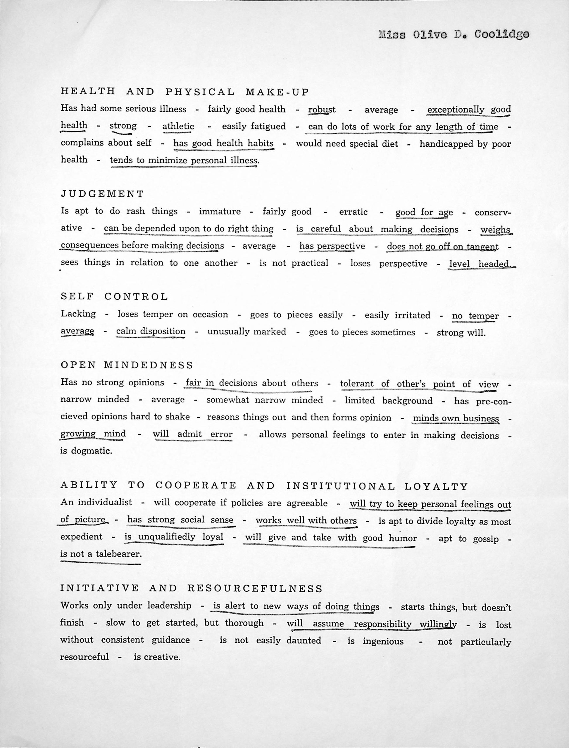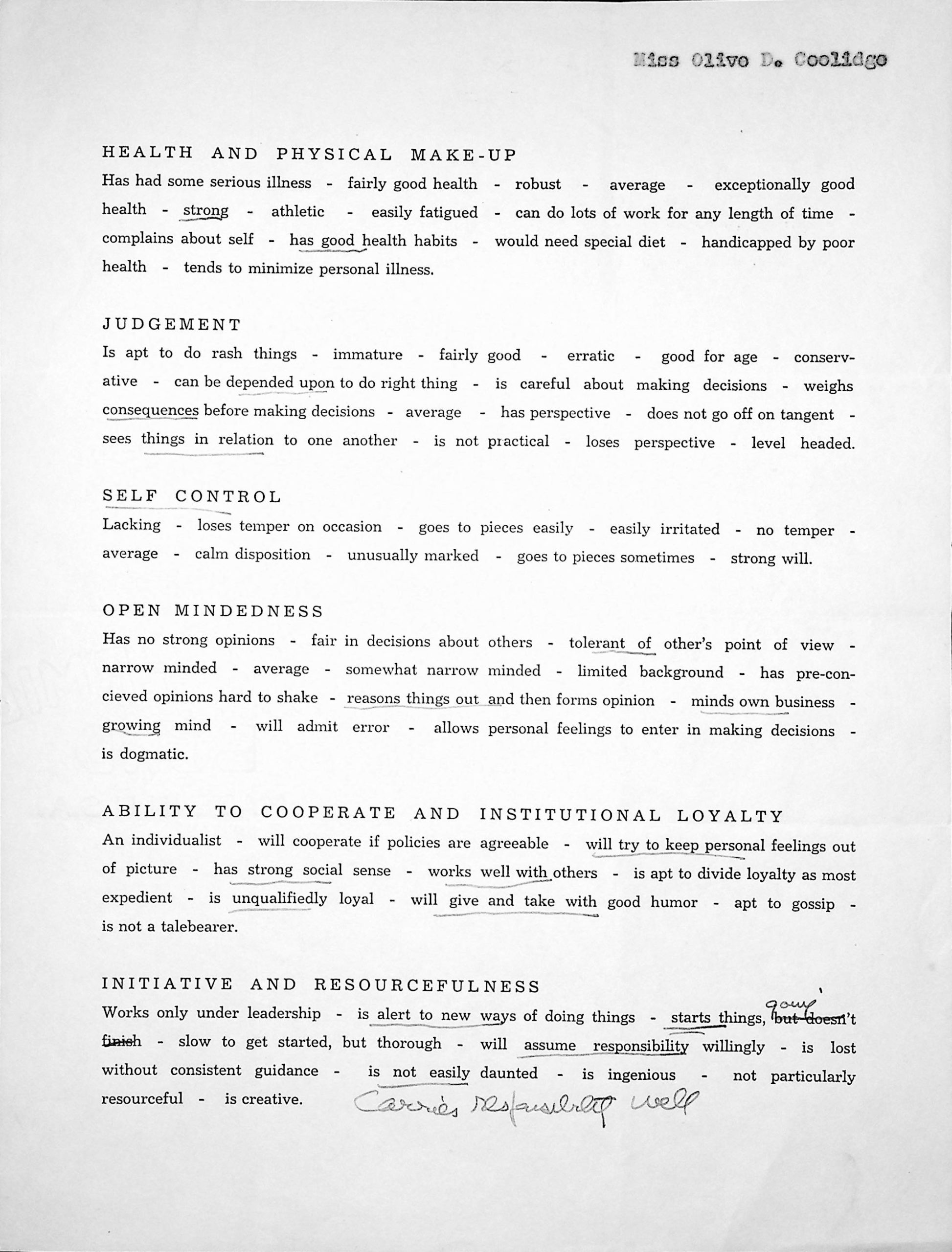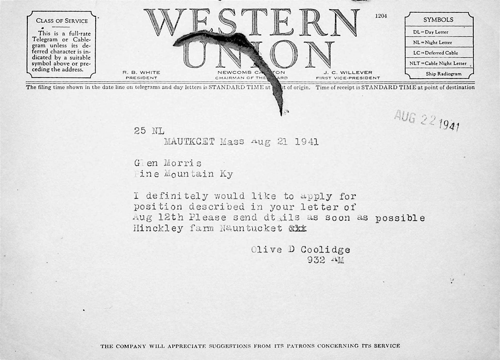 TAGS: Olive Coolidge staff, Olive Coolidge correspondence 1941-1942, application to work at PMSS, Olive Dame Campbell, recommendation forms, Glyn Morris, nursing assistant, Infirmary, Hill House, Western Union telegrams, Grace M. Rood, John C. Campbell Folk School, Folk schools