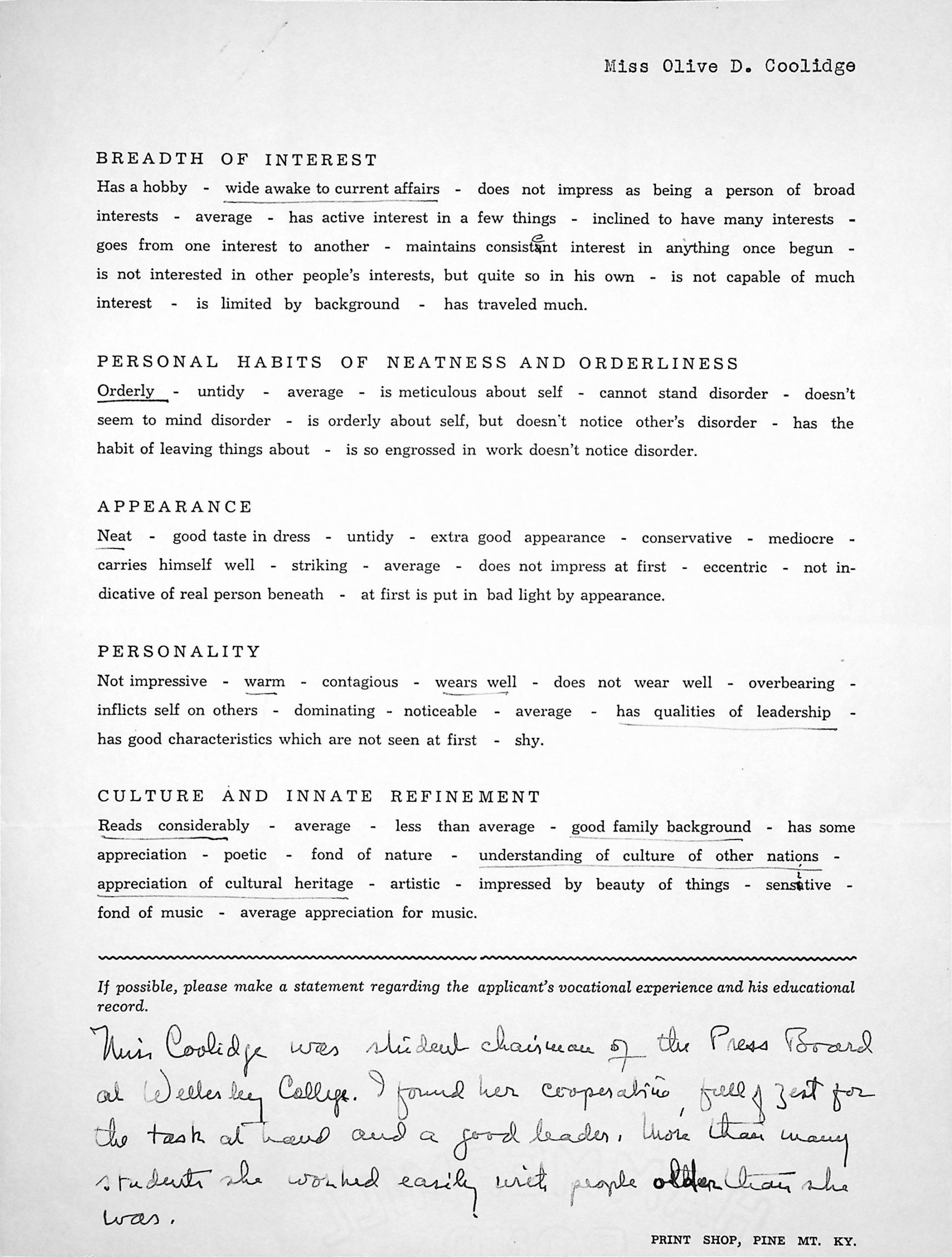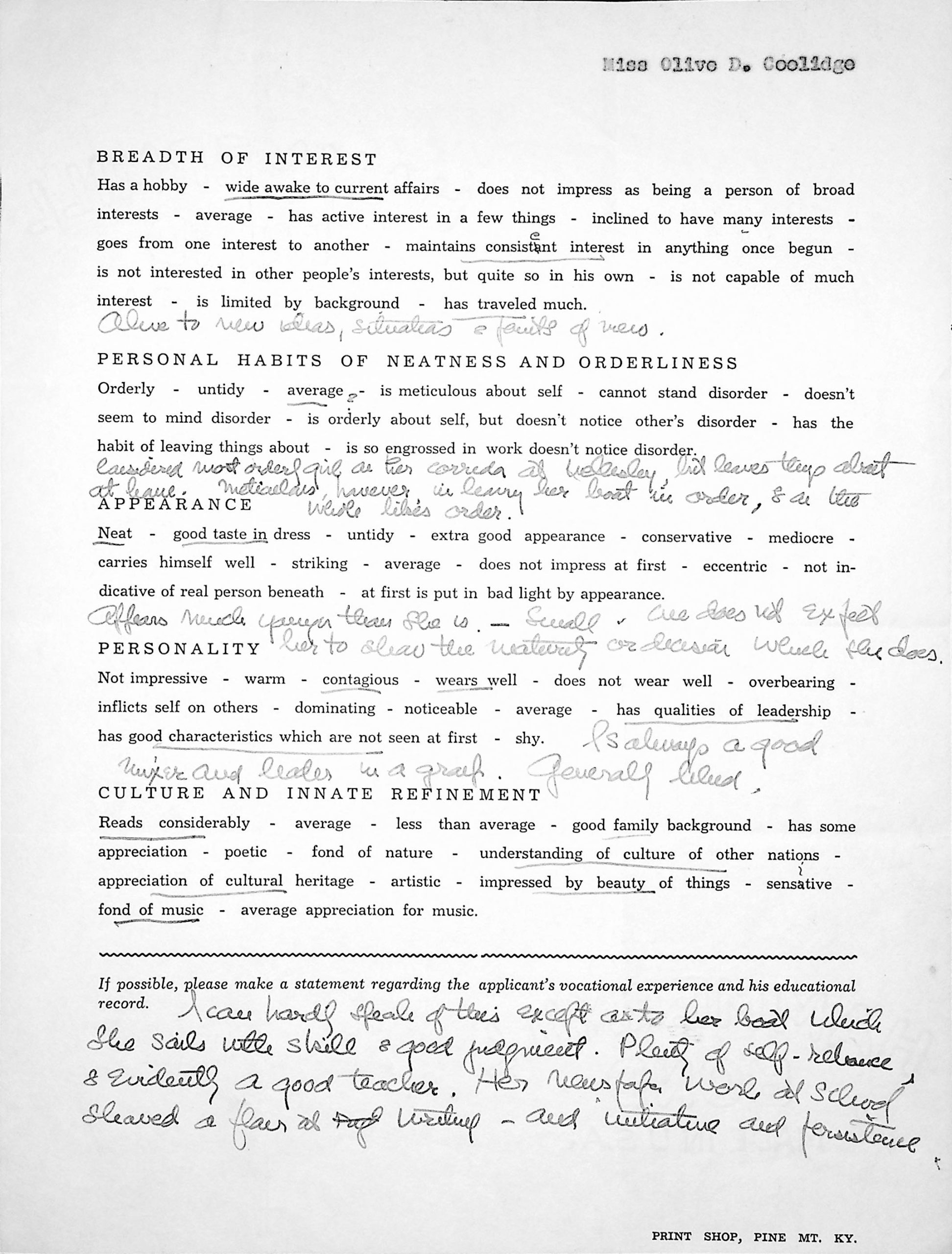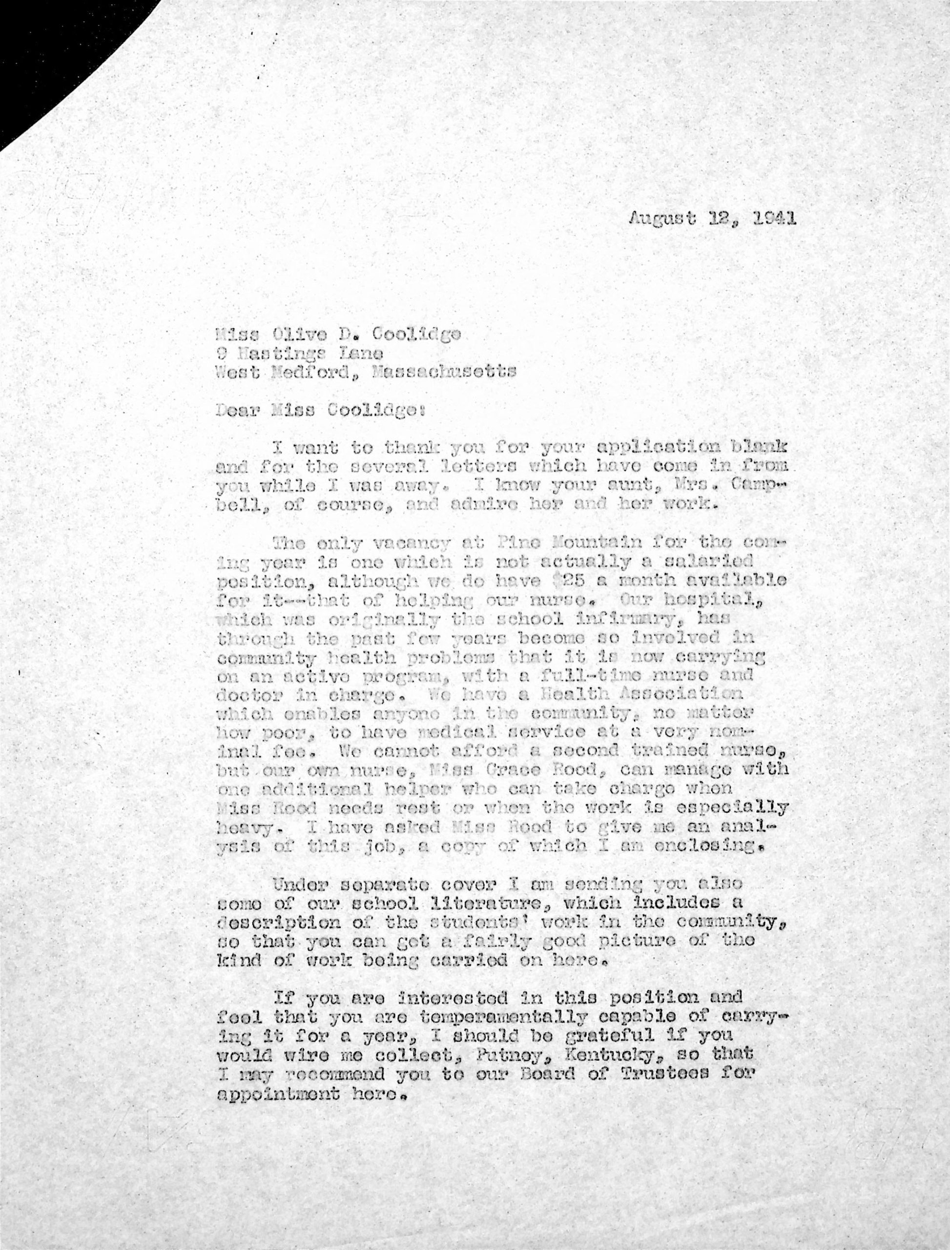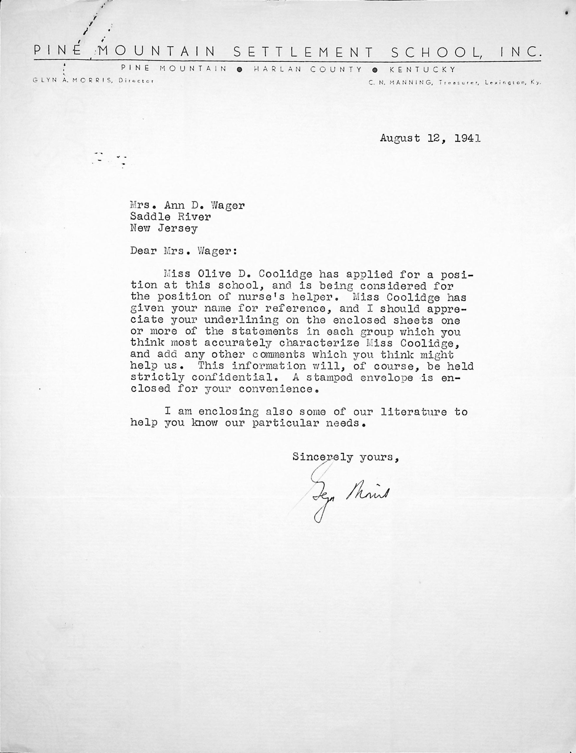 The correspondence listed below is related to Olive Coolidge’s application to be hired as a nurse’s assistant in the Infirmary at the Pine Mountain Settlement School. See the biography for OLIVE COOLIDGE for more information. The documents are part of the Pine Mountain Settlement School original holdings.