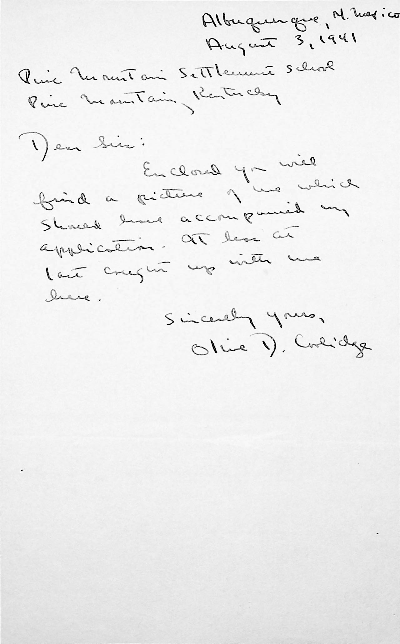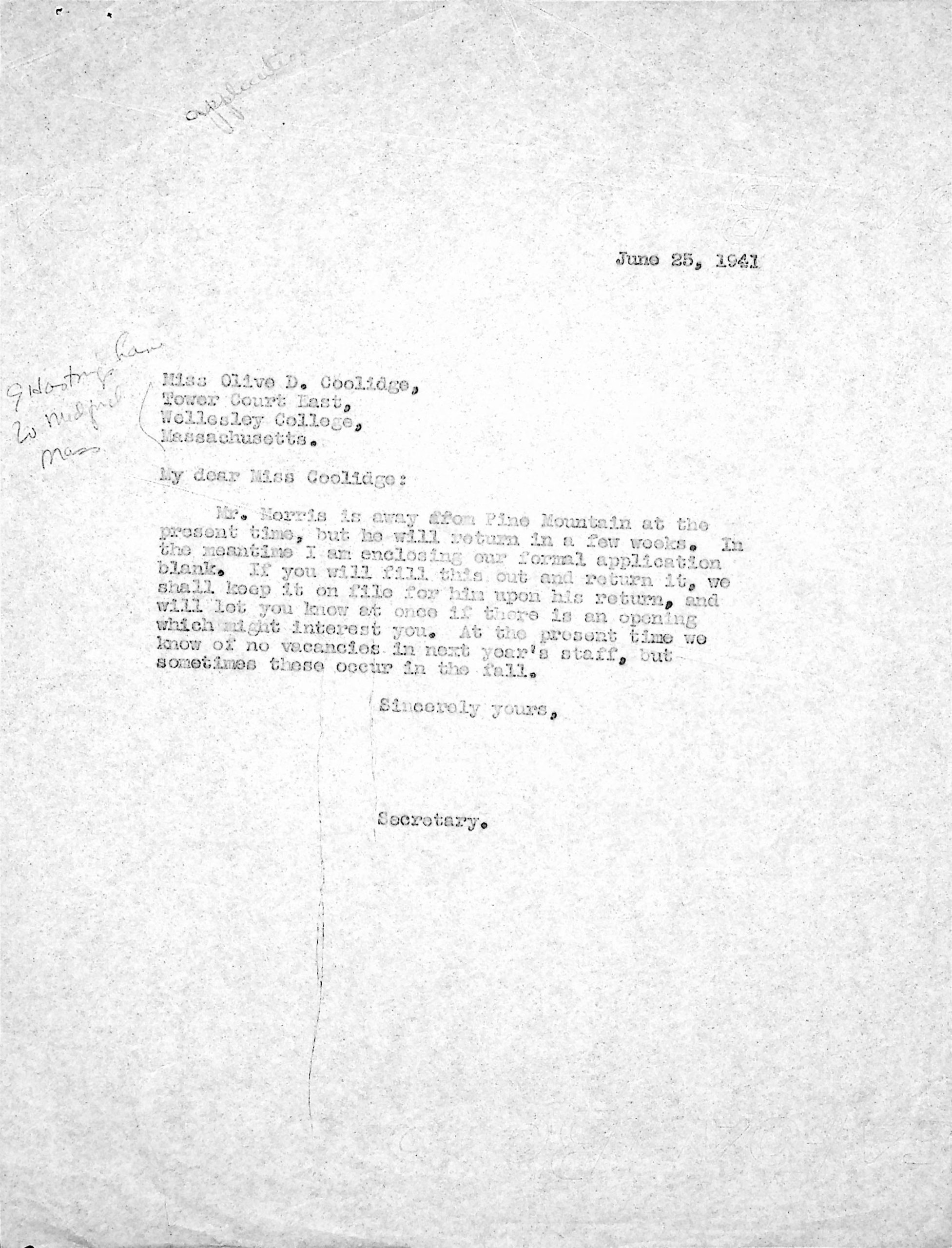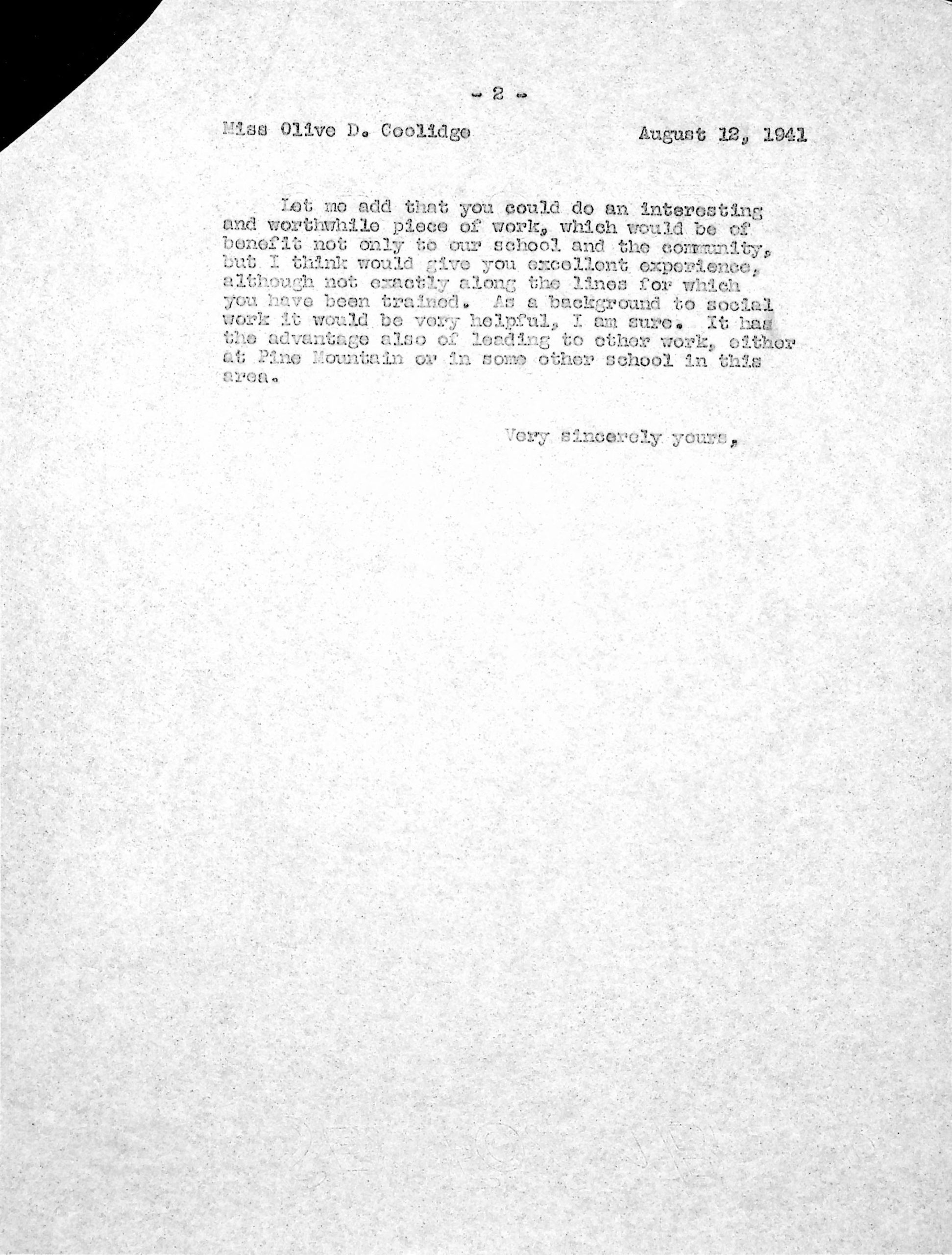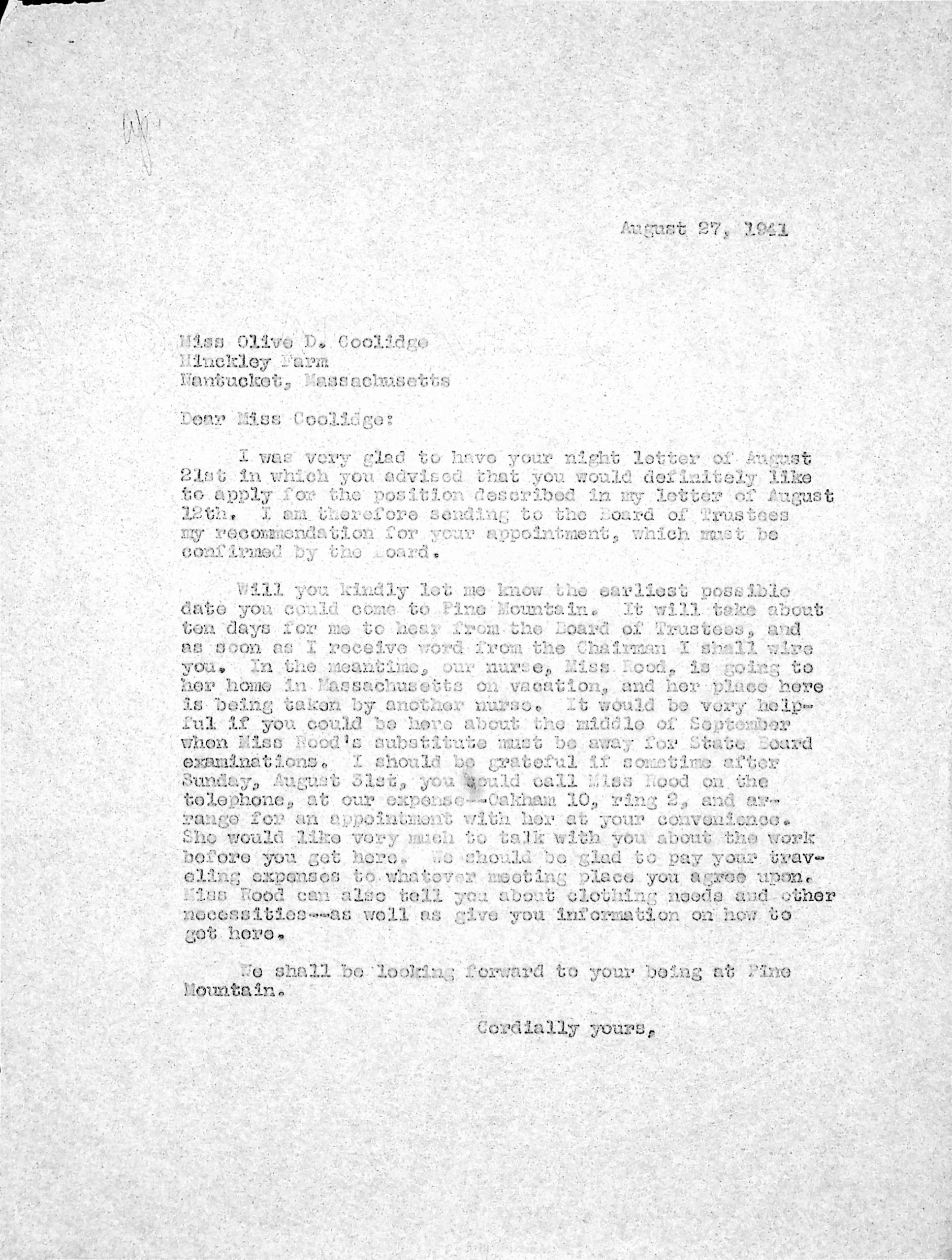 OLIVE COOLIDGE Correspondence 1941 August Pine Mountain Employment Invitation