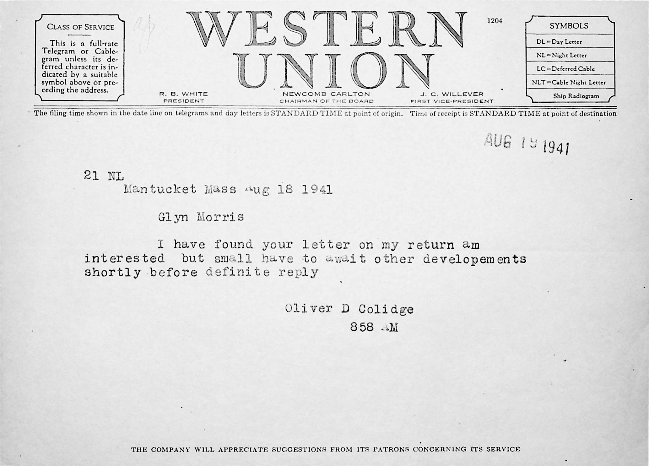 166 [image00166.jpg] Typewritten Western Union telegram to Morris from Coolidge in Nantucket, MA, August 18, 1941. Coolidge is interested in the position but has to “await other developments shortly before definite reply.