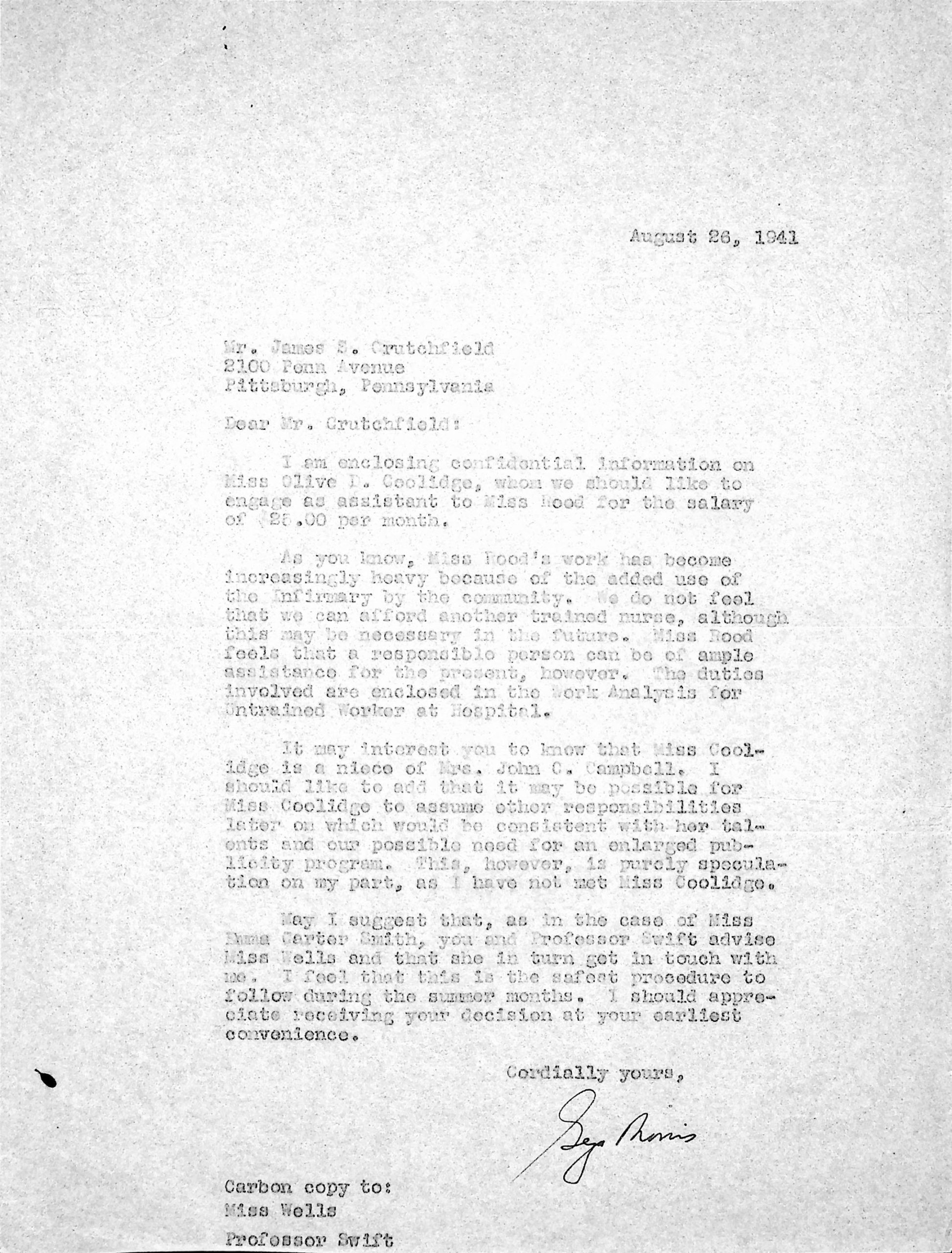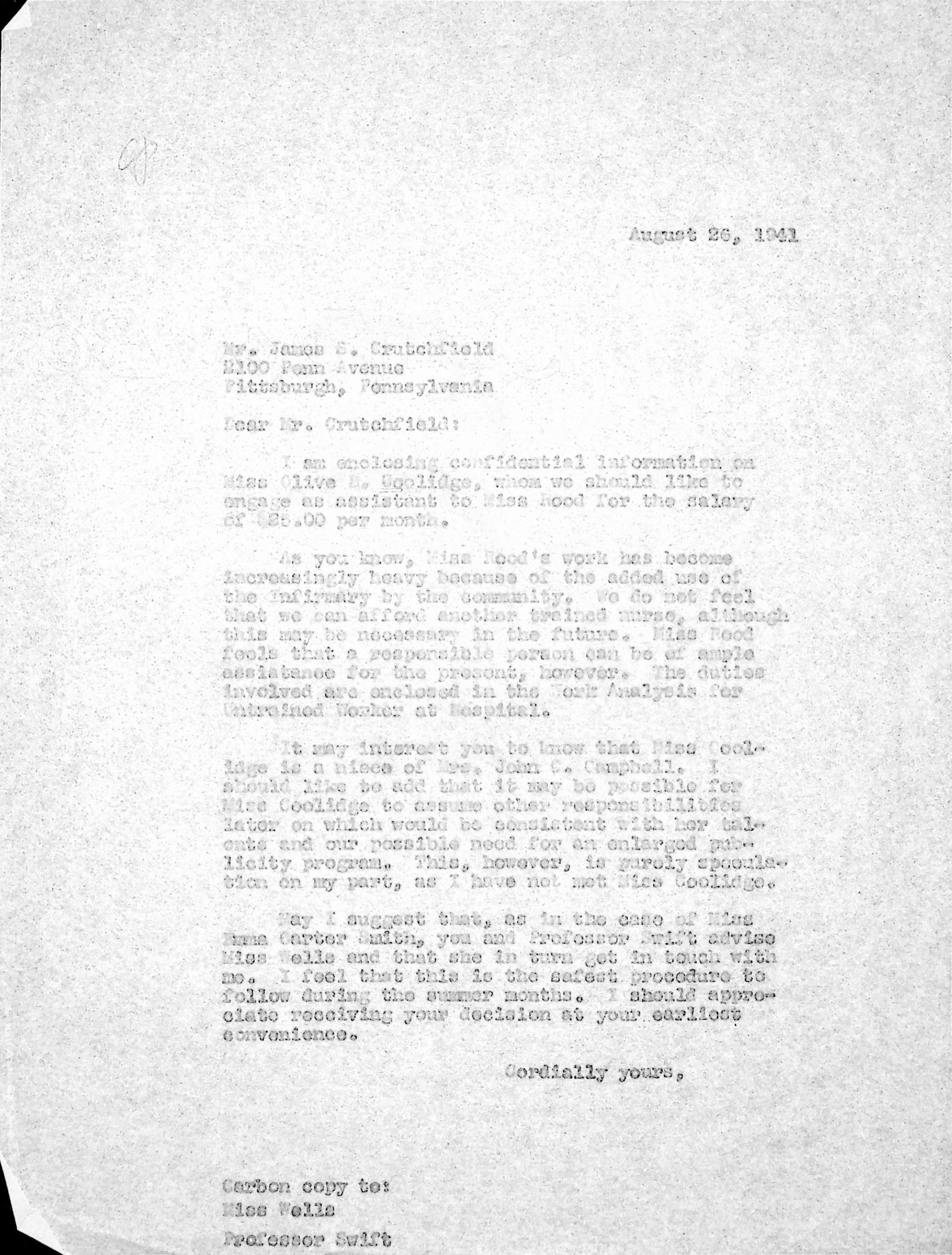 169 [image00169.jpg] To Mr. James S. Crutchfield in Pittsburgh, PA, [unsigned], likely Morris, August 26, 1941. Carbon copies to Miss [Evelyn K.] Wells and Professor Swift. Encloses “confidential information on Miss Olive D. Coolidge, whom we should like to engage as an assistant to Miss Rood for the salary of $25.00 per month.” The letter suggests that Crutchfield and Swift advise Miss Wells and that she inform Morris. The letter also describes the need for an office assistant:
