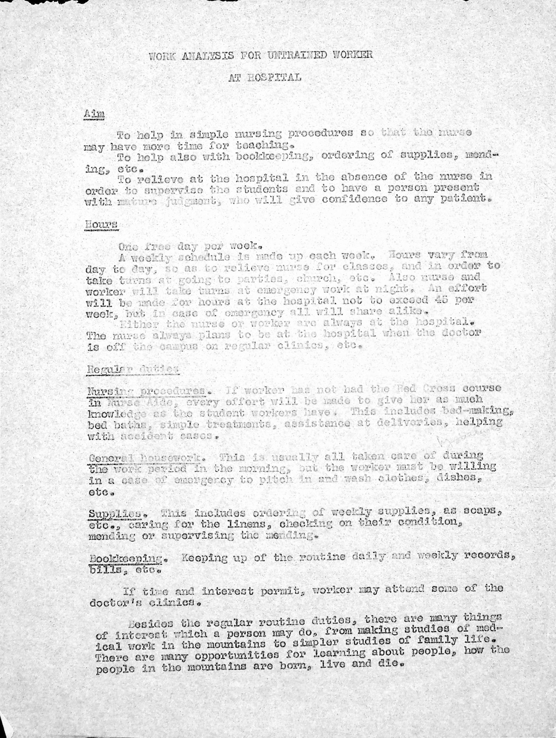 … Miss Rood’s work has become increasingly heavy because of the added use of the Infirmary by the community. We do not feel that we can afford another trained nurse, although this may be necessary in the future. Miss Rood feels that a responsible person can be of ample assistance for the present, however. The duties involved are enclosed in the Work Analysis for Untrained Workers at Hospital.