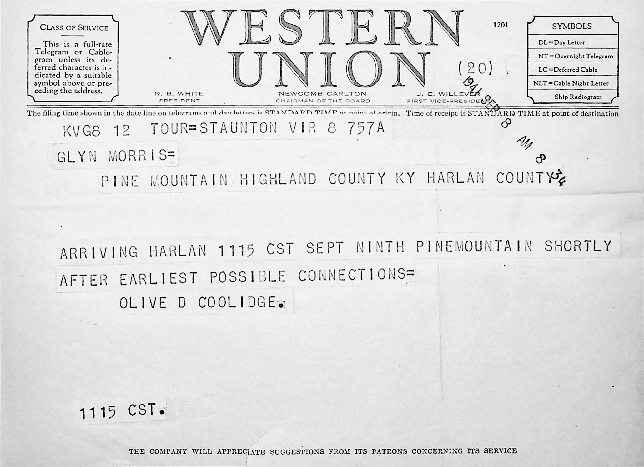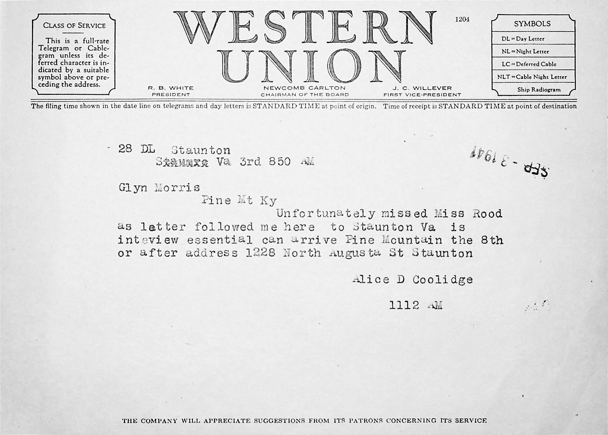 176 [image00176.jpg] Telegram to Morris from Coolidge in Staunton, VA, September 3, 1941. She missed the interview with Miss Rood; asks if an interview is essential; states when she can arrive at Pine Mountain.