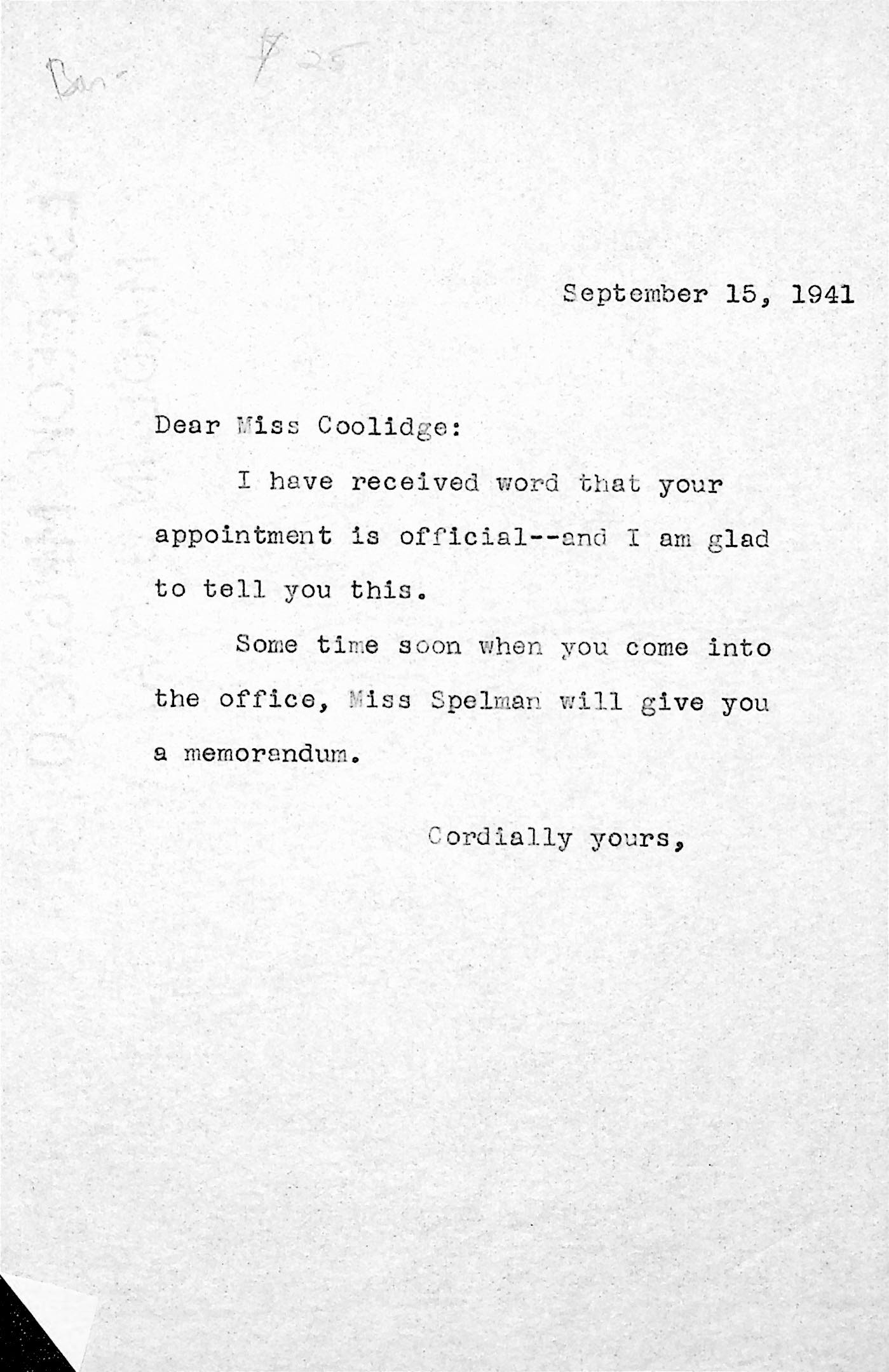 182 [image00182.jpg] Note from [unsigned, likely Morris] to Coolidge, September 15, 1941, stating that her appointment is official; will receive memo from Miss  [Barbara] Spelman.