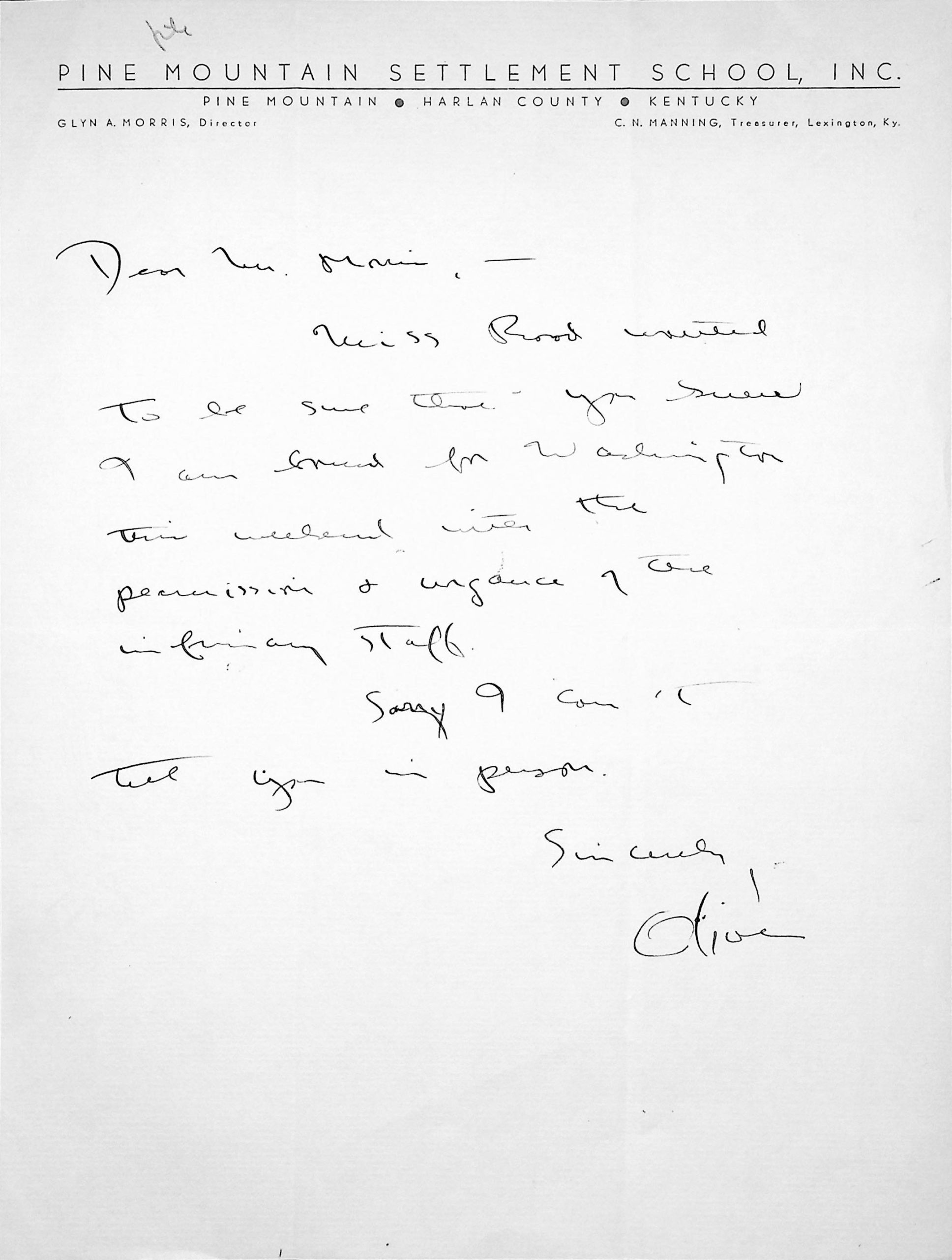 All letters from Pine Mountain Settlement School staff to Miss Coolidge and others were typewritten carbon copies, often unsigned, and meant for the office files. The recipients received the signed original letters.