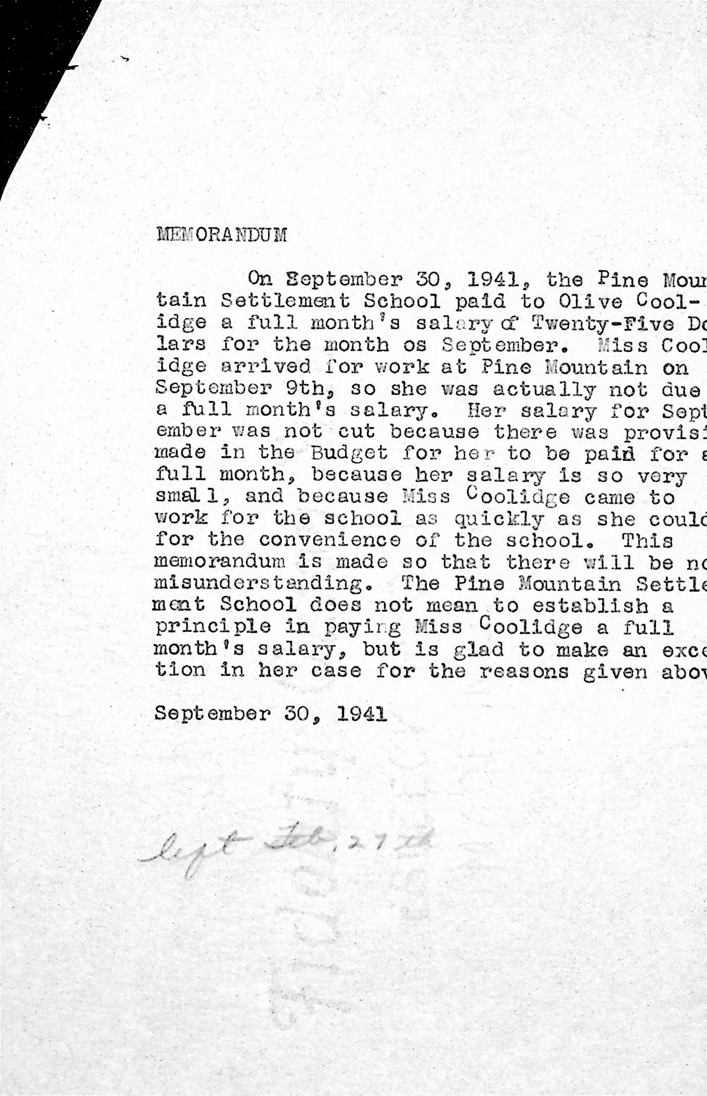 184 [image00184.jpg] MEMORANDUM, September 30, 1941, recording that PMSS paid Coolidge $25 for September and explaining the reason she was paid in full even though she arrived September 9.