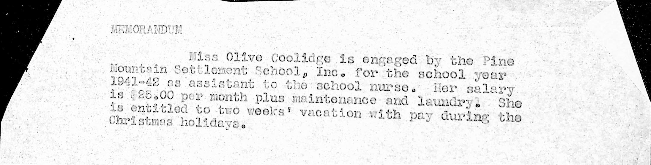 Miss Olive Coolidge is engaged by the Pine Mountain Settlement School, Inc. for the school year 1941-42 as assistant to the school nurse. Her salary is $25.00 per month plus maintenance and laundry. She is entitled to two weeks’ vacation with pay during the Christmas holidays.