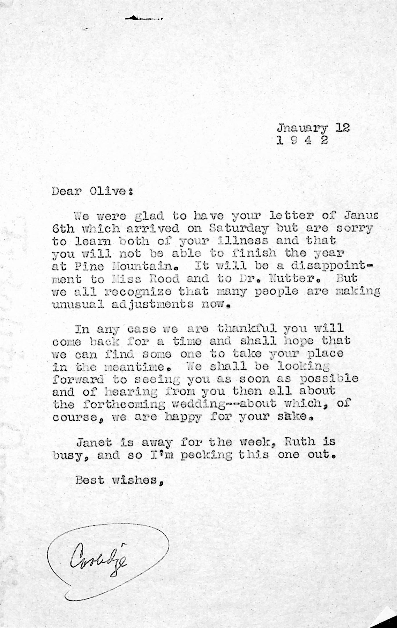 191 [image00191.jpg] To “Olive” from [unsigned, likely Glyn Morris], January 12, 1942. Regrets learning of Coolidge’s illness and that she will not be finishing the year at PMSS, “but we all recognize that many people are making unusual adjustments now. In any case we are thankful you will come back for a time….”