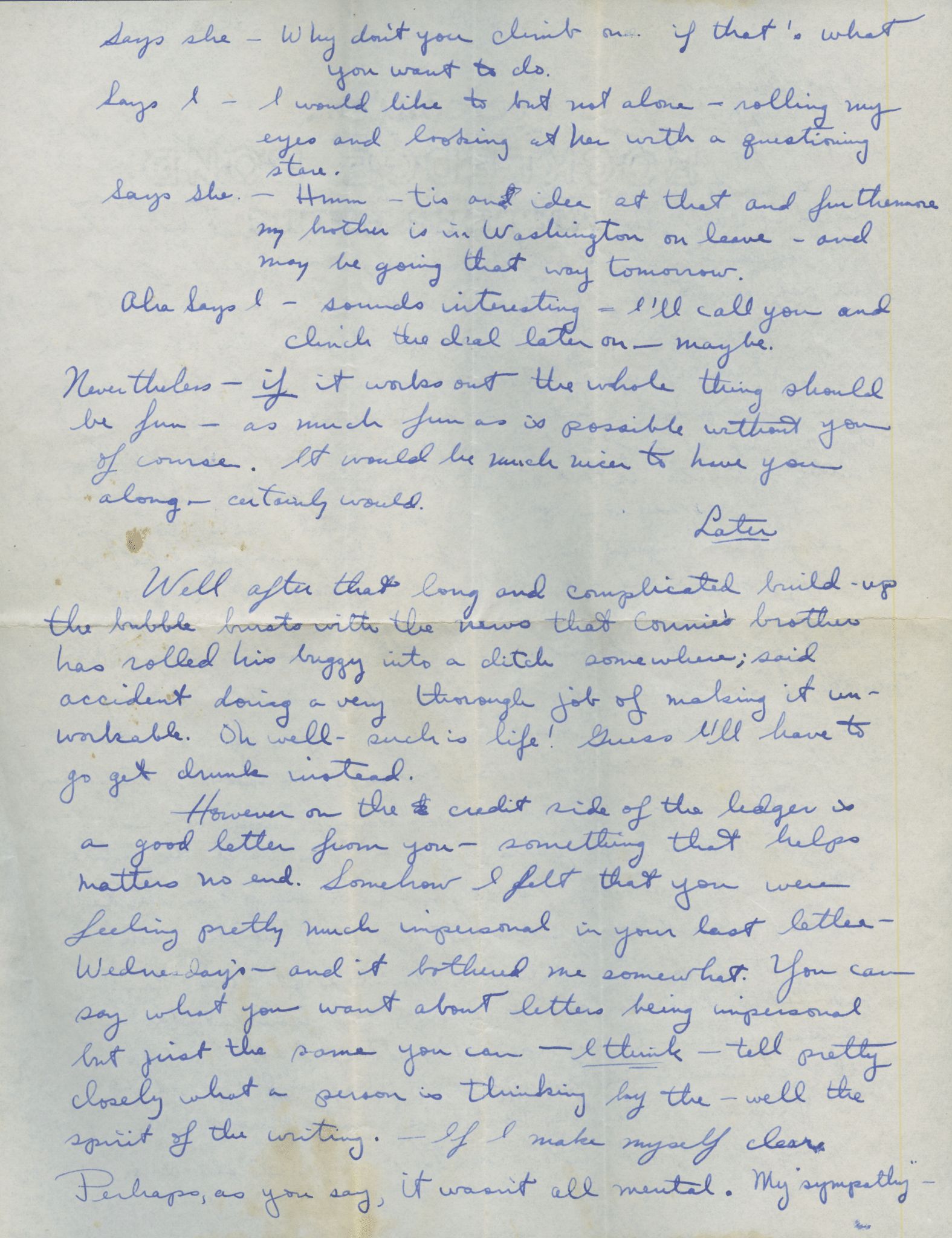 However on the credit side of the ledger is a good letter from you –something that helps matters no end. Somehow I felt that you were feeling pretty much impersonal in your last letter – Wednesday’s – and it bothered me somewhat. You can say what you want about letters being impersonal but just the same you can – I think – tell pretty closely what a person is thinking by the – well, the spirit of the writing. – If I make myself clear. Perhaps , as you say, it wasn’t all mental. My “sympathy” – late – but I suppose better late than never.