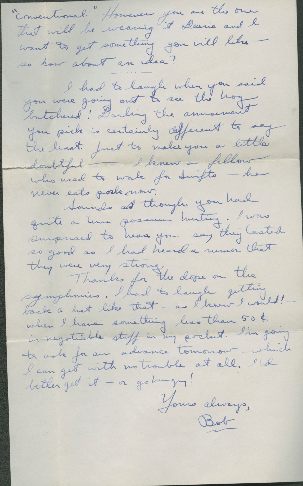 Woe is me! I fear the old nag that runs the pony express out of the hill billy country has given up and collapsed. Probably had a heart attack walking over the mountain – or put her foot in a rabbit hole and broke her laig (note laig) – not leg in that country. But I’ll be kindhearted and give you the benefit of the doubt by assuming you are finding enough to keep you busy for slightly more than 24 hours a day. If I were to be just [a] wee bit malicious I might suggest that perhaps the scarcity of letters from me last week had something to do with it. Shucks Dearie, you wouldn’t put me in the dog-house for forgetting to mail a letter would you? Or would you –well I don’t know that I would blame you if you did.