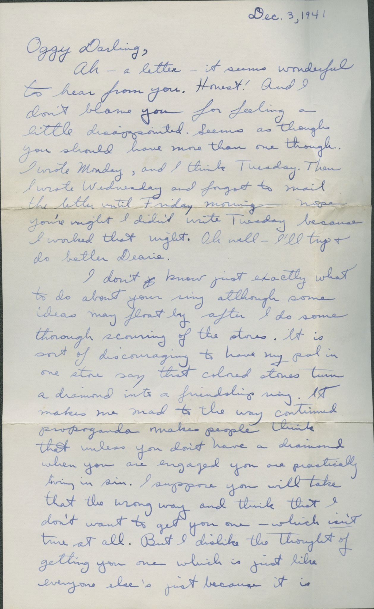 I don’t know just exactly what to do about your ring although some ideas may float by after I do some thorough scouring of the stores. It is sort of discouraging to have my pal in one store say that colored stones turn a diamond into a friendship ring. It makes me mad [at] the way continued propaganda makes people think that unless you don’t have a diamond when you are engaged you are practically living in sin. I suppose you will take that the wrong way and think that I don’t want to get you one – which isn’t true at all. But I dislike the thought of getting you one which is just like everyone else’s just because it is “conventional.” However you are the one that will be wearing it Dearie and I want to get something you will like – so how about an idea?