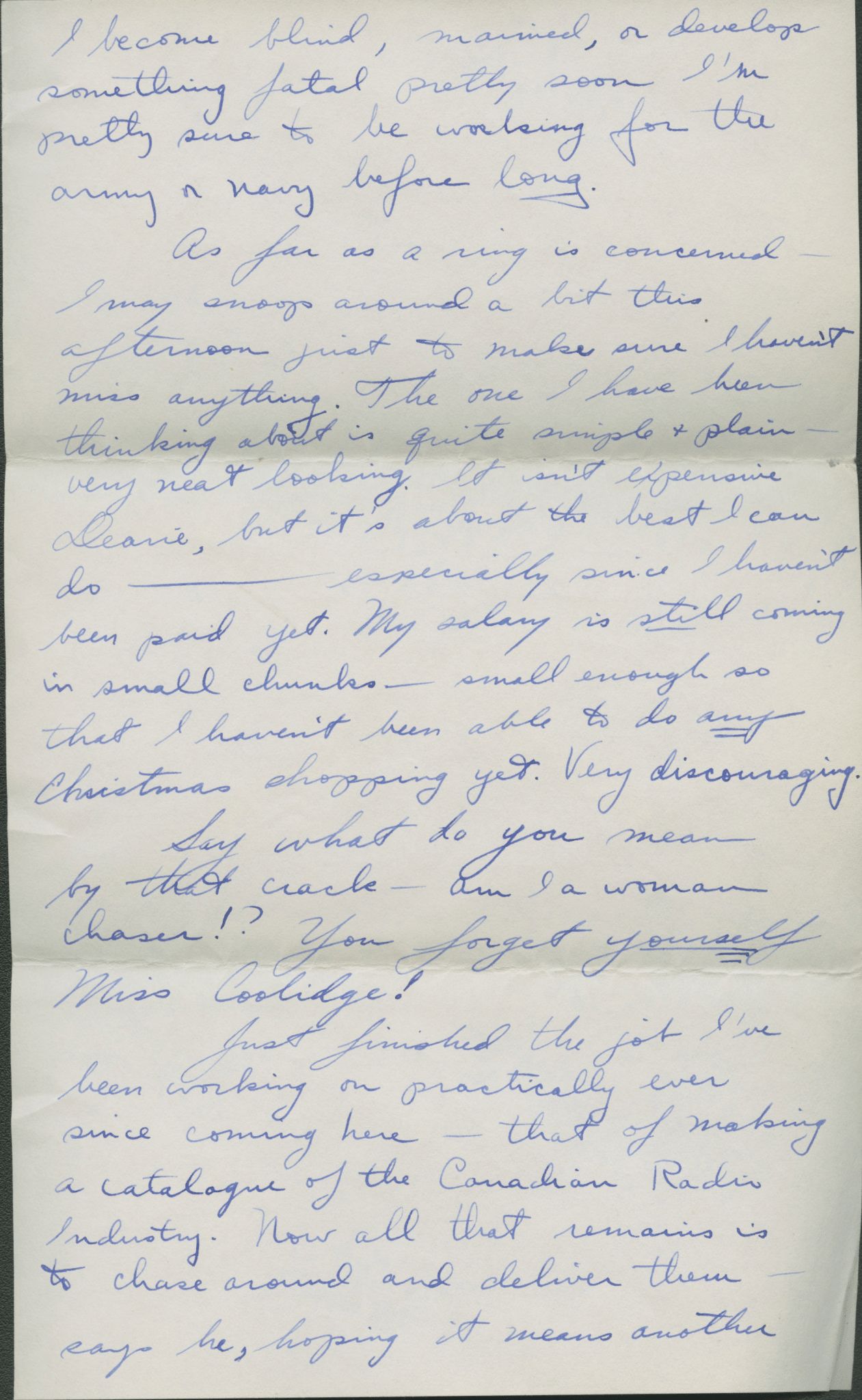 The idea about changing names from Miss to Mrs. Is still a good idea though – says he in the usual forceful fashion. It really is though Dearie – my, my – Christmas is going to be time for celebration all right – and just think Darling – we’ll have a Fireplace. And Darling – about living together for the rest of our life – it’s a date.