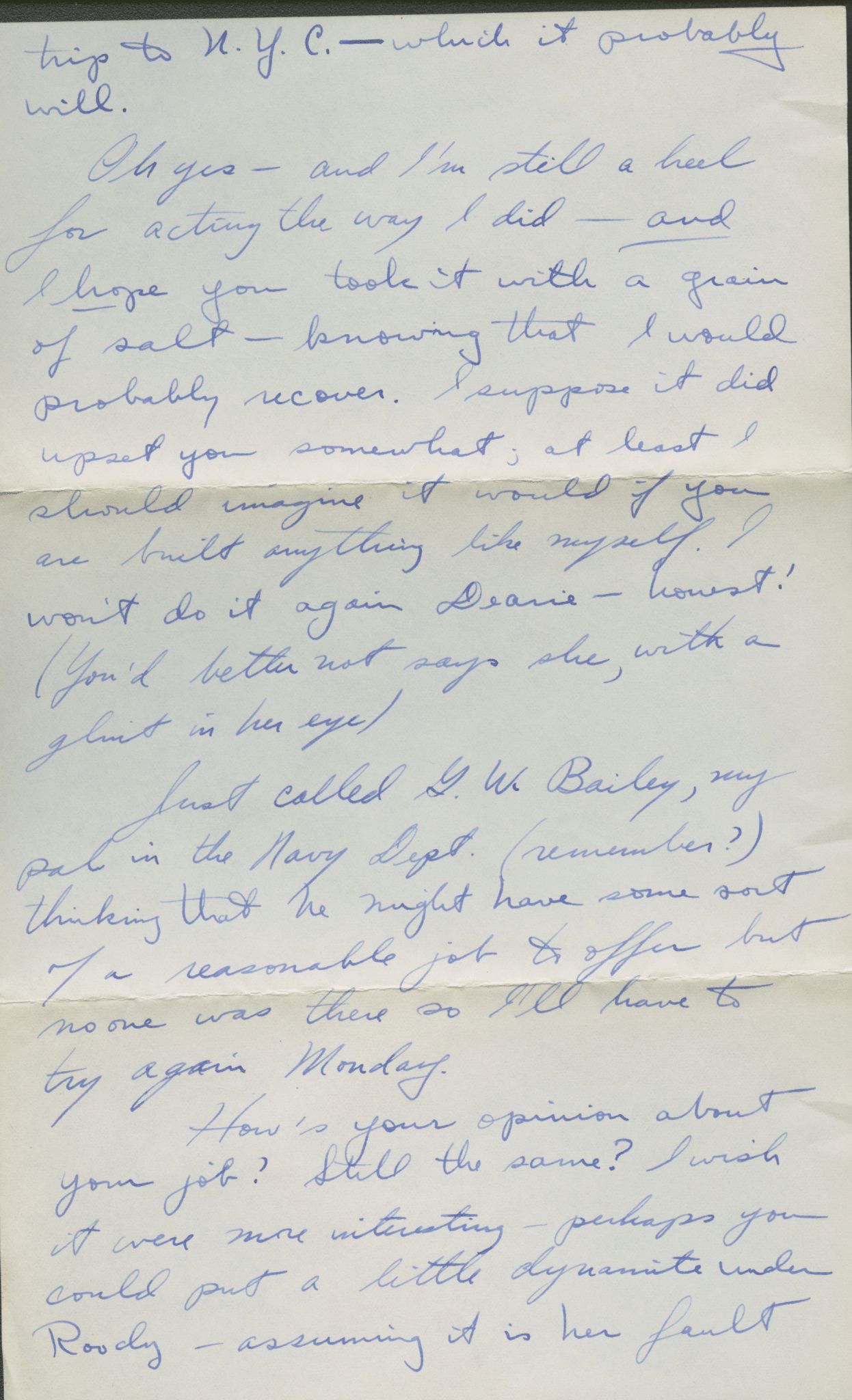 Say Dearie, I got a letter from Dot today which mentioned a letter you sent to Blanche. Apparently you said something about “getting along better this time in Washington.” Is it something she twisted around, sarcasm or what? If you just mentioned it out of a clear sky you should be spanked. That is not the kind of a thing to say to Blanche. She is probably –although it’s by rumor only that I’m saying this – not too much in love with “us” according to your own statement and you shouldn’t give her more stuff to talk about like that.