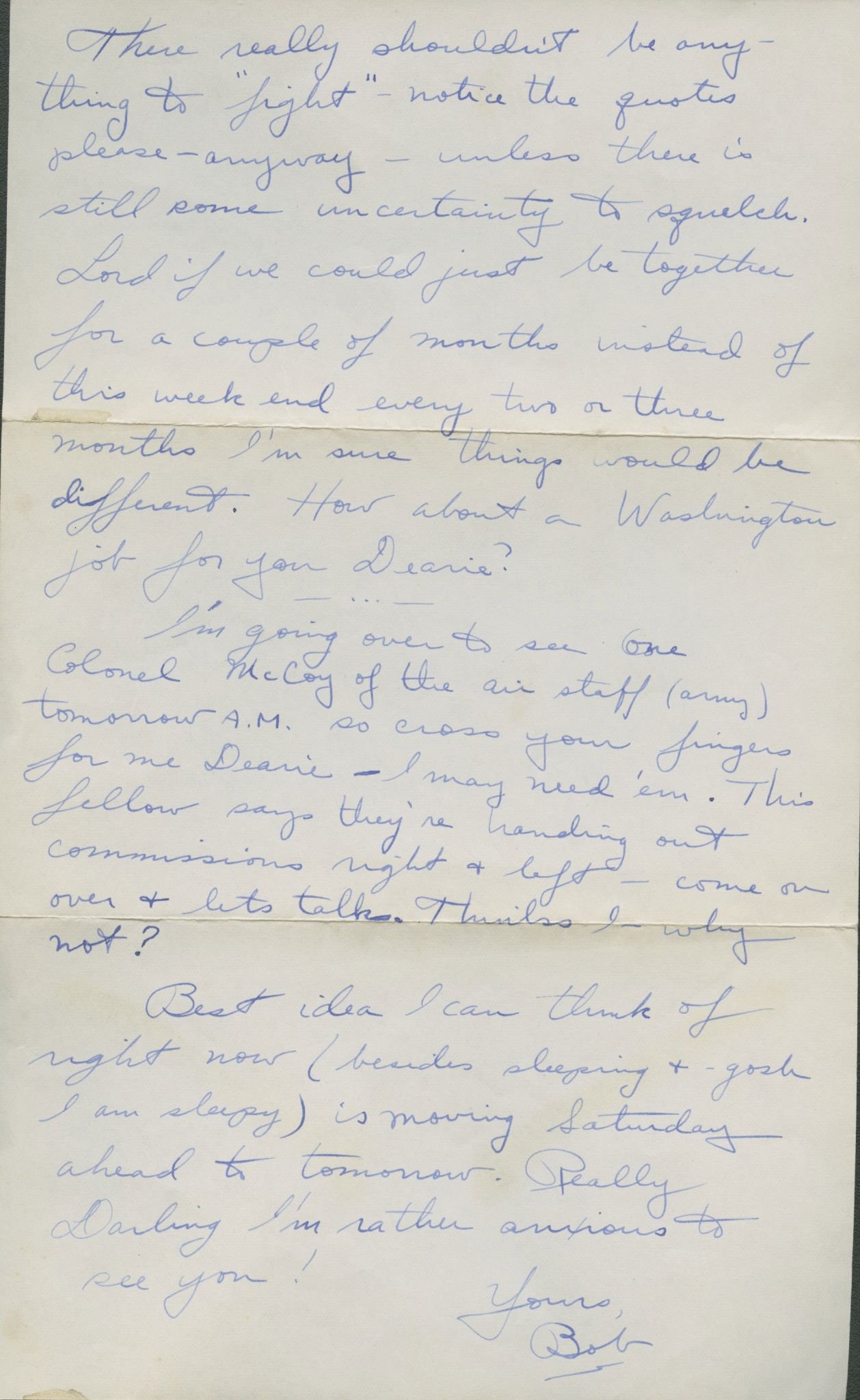 And don’t think I have forgotten about the telegram. Believe me – it was a great consolation to come staggering in in the middle of the night, and find something from you. The only thing I would have liked better would have been to find you here (how’s that). Mmmm. Yes. Gee Dearie here it is only Monday, and already I wish we were together again! I can hear those wedding bells very plainly! Right?