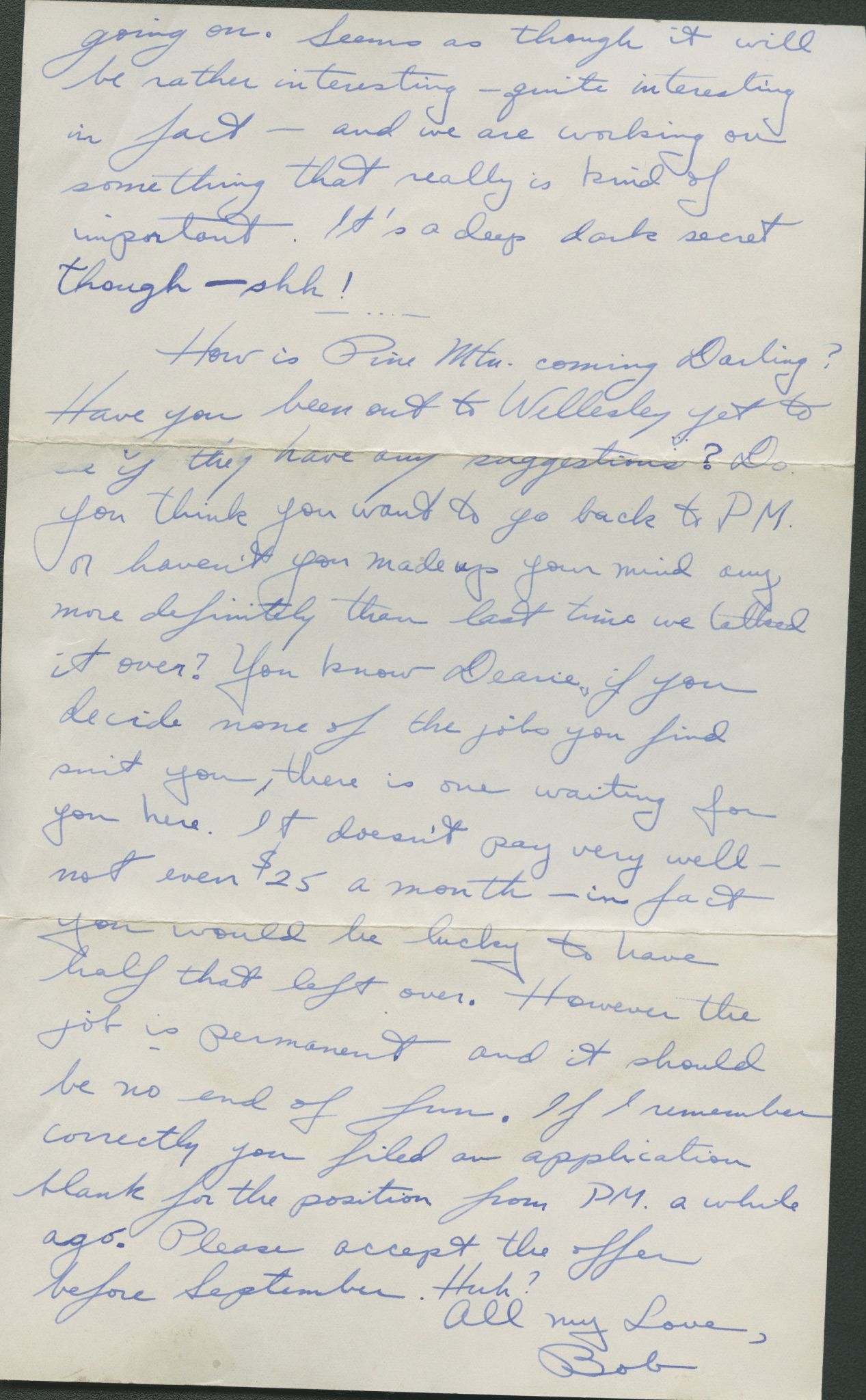 How is Pine Mtn. coming Darling? Have you been out to Wellesley yet to see if they have any suggestions? Do you think you want to go back to P.M. or haven’t you made up your mind any more definitely than last time we talked it over? You know Dearie, if you decide none of the jobs you find suit you, there is one waiting for you here. It doesn’t pay very well – not even $25 a month – in fact you would be lucky to have half that left over. However the job is permanent and it should be no end of fun. If I remember correctly you filed an application blank for the position from PM a while ago. Please accept the offer before September. Huh?