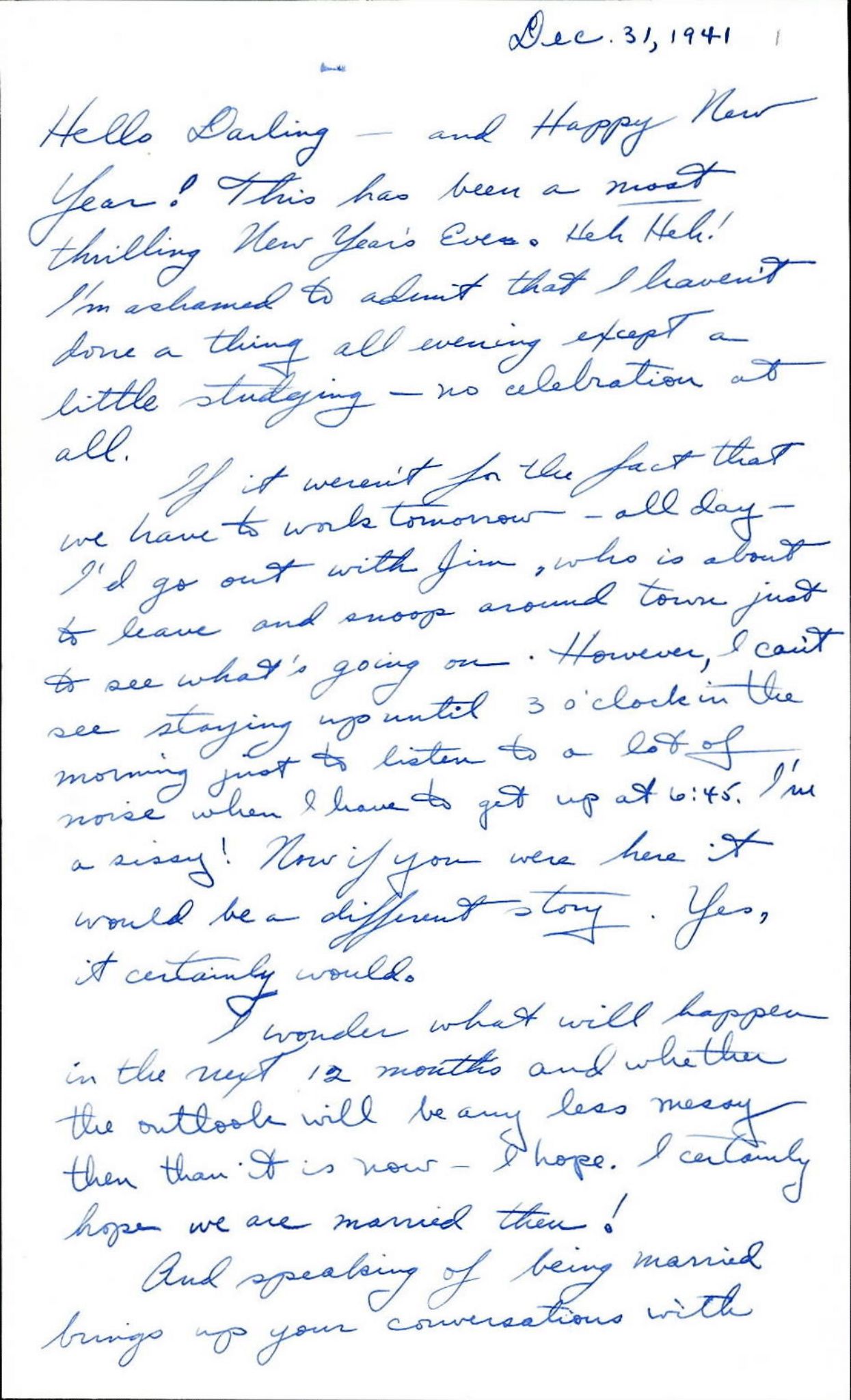 Hello Darling – and Happy New Year! This has been a most thrilling New Year’s Eve. Heh Heh! I’m ashamed to admit that I haven’t done a thing all evening except a little studying – no celebration at all.