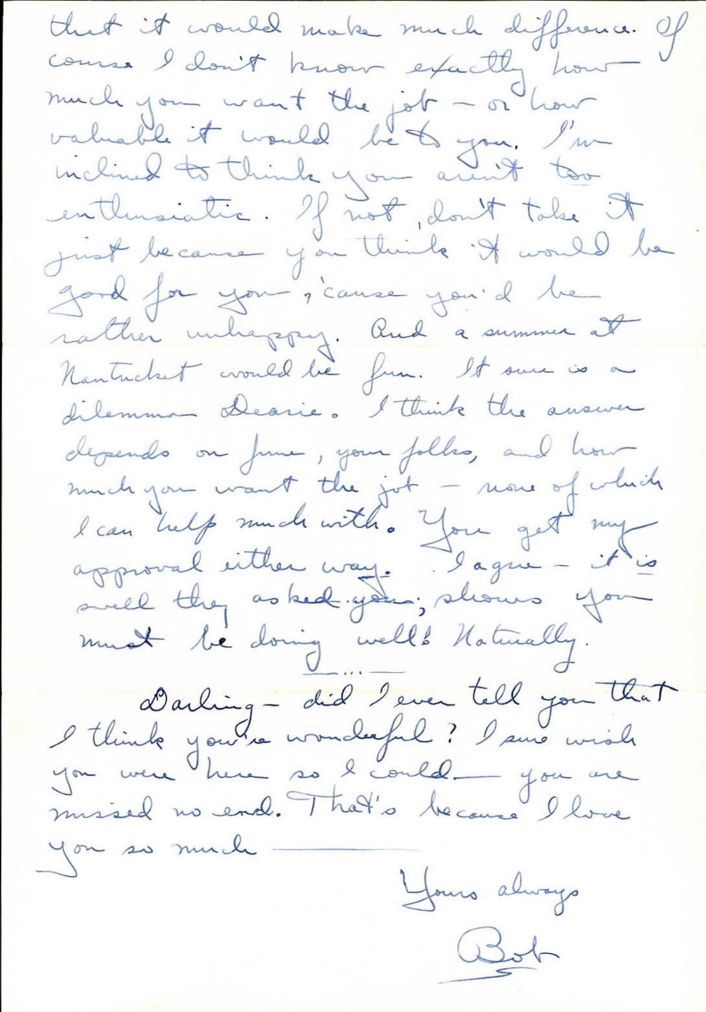 Lord, Darling, I don’t know what to say about the job. Such a problem. About the only thing I can say is to do whatever you want. As far as apartments are concerned I doubt that it would make much difference. Of course, I don’t know exactly how much you want the job – or how valuable it would be to you. I’m inclined to think you aren’t too enthusiastic. If not, don’t take it just because you think it would be good for you, ’cause you’d be rather unhappy. And a summer at Nantucket would be fun. It sure is a dilemma, Dearie. I think the answer depends on June, your folks, and how much you want the job – none of which I can help much with. You get my approval either way. I agree – it is swell they asked you; shows you must be doing well! Naturally.