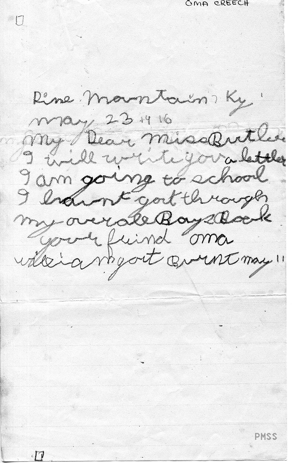 Pine Mountain, KY. May 23, 1916. My Dear Miss Butler, I will write you a letter. I am going to school. I haven’t got through my overall(?) Bays(?) Book. Your friend, Oma. William got burnt May 11.