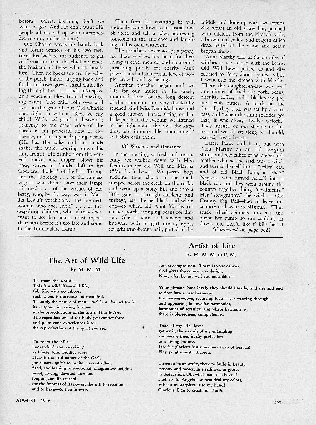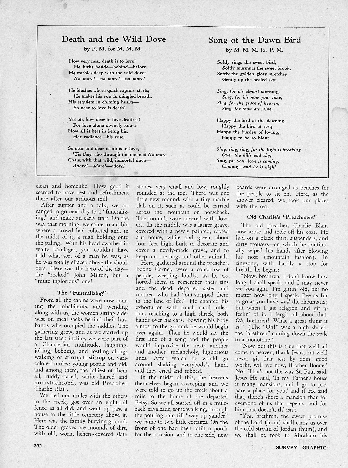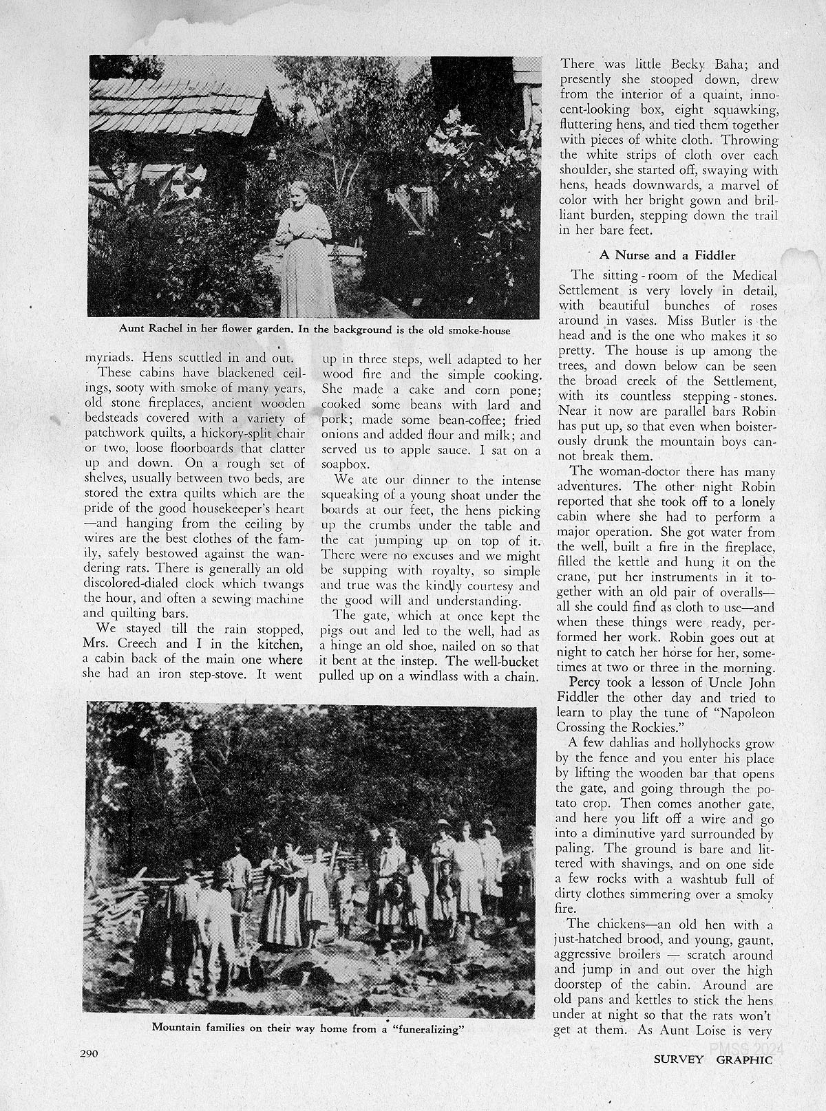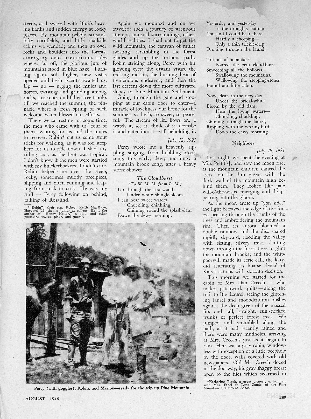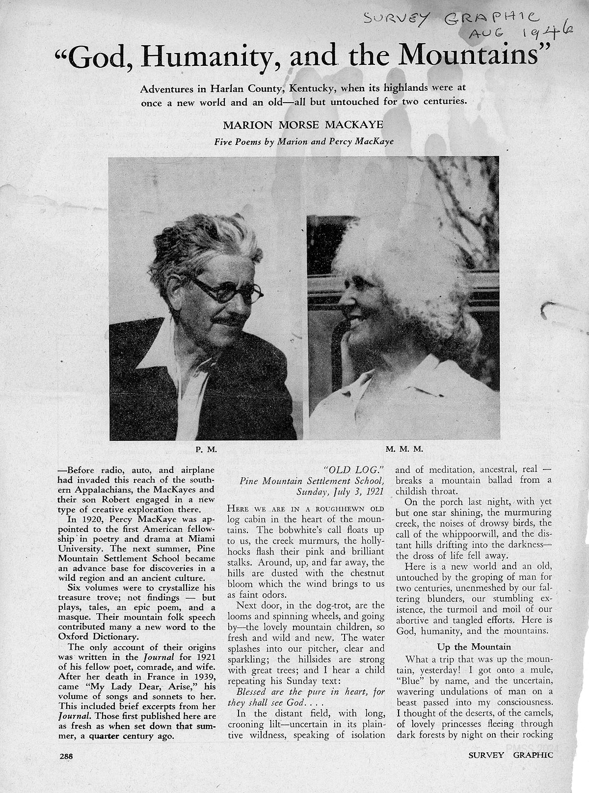 The August 26, 1949 Survey Graphic article in the archive at PMSS, recounts the Summer of 1921 when the MacKaye family stayed at Pine Mountain Settlement School and traveled in the area gathering local lore. The stories of the family visit were recorded in their journals of 1921. This published article of Percy MacKaye in 1946, pulls stories taken from the couple’s journals seven years after the death of his wife, Marion. The reflections are vivid, touching, and were, no doubt, healing, for Percy and their son, Robin, who accompanied his parents during this magical summer.