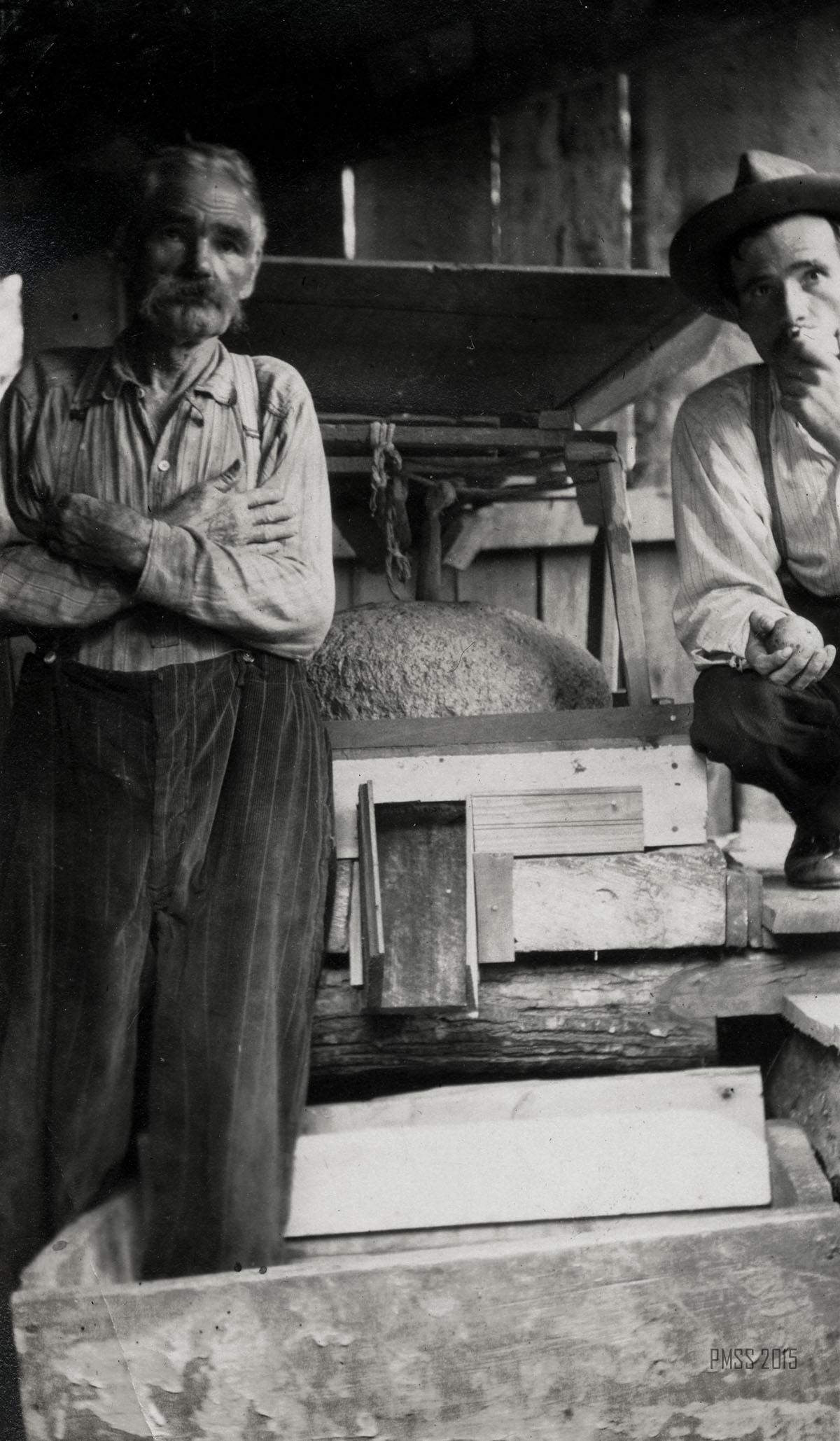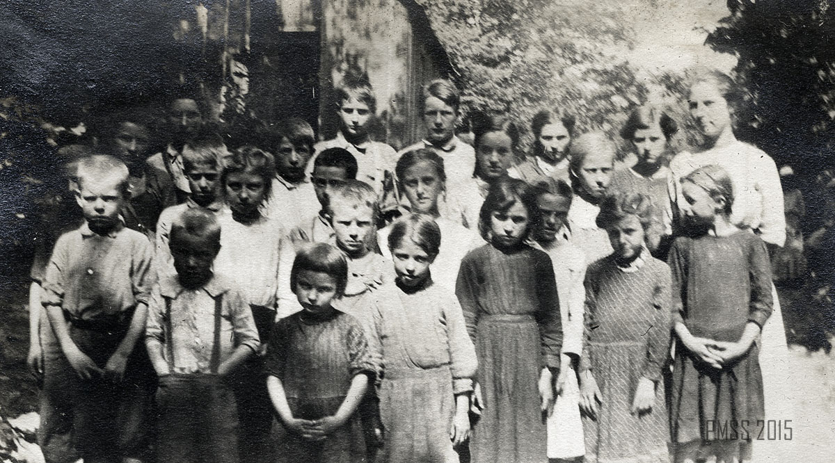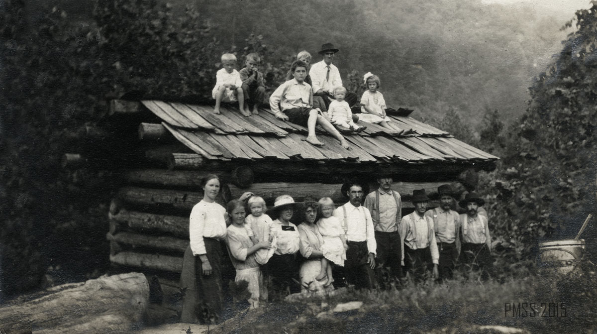 035a A school house way down Greasy. [Two mules? and several logs in foreground, school back right.] ; 035b A mansion. [Side of a wooden building at right, wooden chair at front right, back of a woman in background on left.] ;  036a [14 men and women outside: Nine standing in back, five men squatting in front, Fourth of July 1914.] ; 036b Fourth of July 1914. [14 men and women outside: Nine standing in back, four men and one woman squatting in front, person in middle front holding american flag?] ; 036c Alifair and Mallie. [Two women outside, one has arm around other’s shoulder, young boy to the right, various people in background on right.] ;037a Some of our neighbors. [Two men and five women standing in a line outside, buildings behind in the center and at left.] ; 037b The Loyd Turners. [Fourteen men, women, and children, wooden fence at far left, hills in background.]  ;038 JosiahCreech. [Man with rifle standing on porch of Old Log House.] ; 039a The Devide School, 1913 [23 children, one woman outside, building in background on left.] ; 039b Hauling locust posts. [Man standing to right of mule.] ; 040a Sol Day’s daughters. [Six young girls standing in a line in front of a building, girl on right is holding youngest girl.] ; 040b The valley of Little Laurel. ; 041a Miss Davis and the Joe Days. [Three adults, woman on left, and seven kids standing outside.] ; 041b Little Laurel Schoolhouse. [18 people: six children and one man on top of roof, eleven standing in front of building.] ; 042a Emily [Rockwell Love ?]. [Woman holding basket, two dogs at right.] ; 042b The road above Uncle William’s. [Road covered partially by snow, fence at right.] ; 042c Emily and Peggie. [Two women standing: one at left holding a basket. Snow covered ground.] ; 043a Life is hard in the Wlderness. [Young man holding axe? in one hand and log in the other, logs at feet, fence in background, building at right in background.] ; 043b Sport! [Young man in overalls holding an animal in one hand.] ; 044a Alifair, Oscar, and Mallie. [Woman, man and woman standing in a line in front of a mule.]