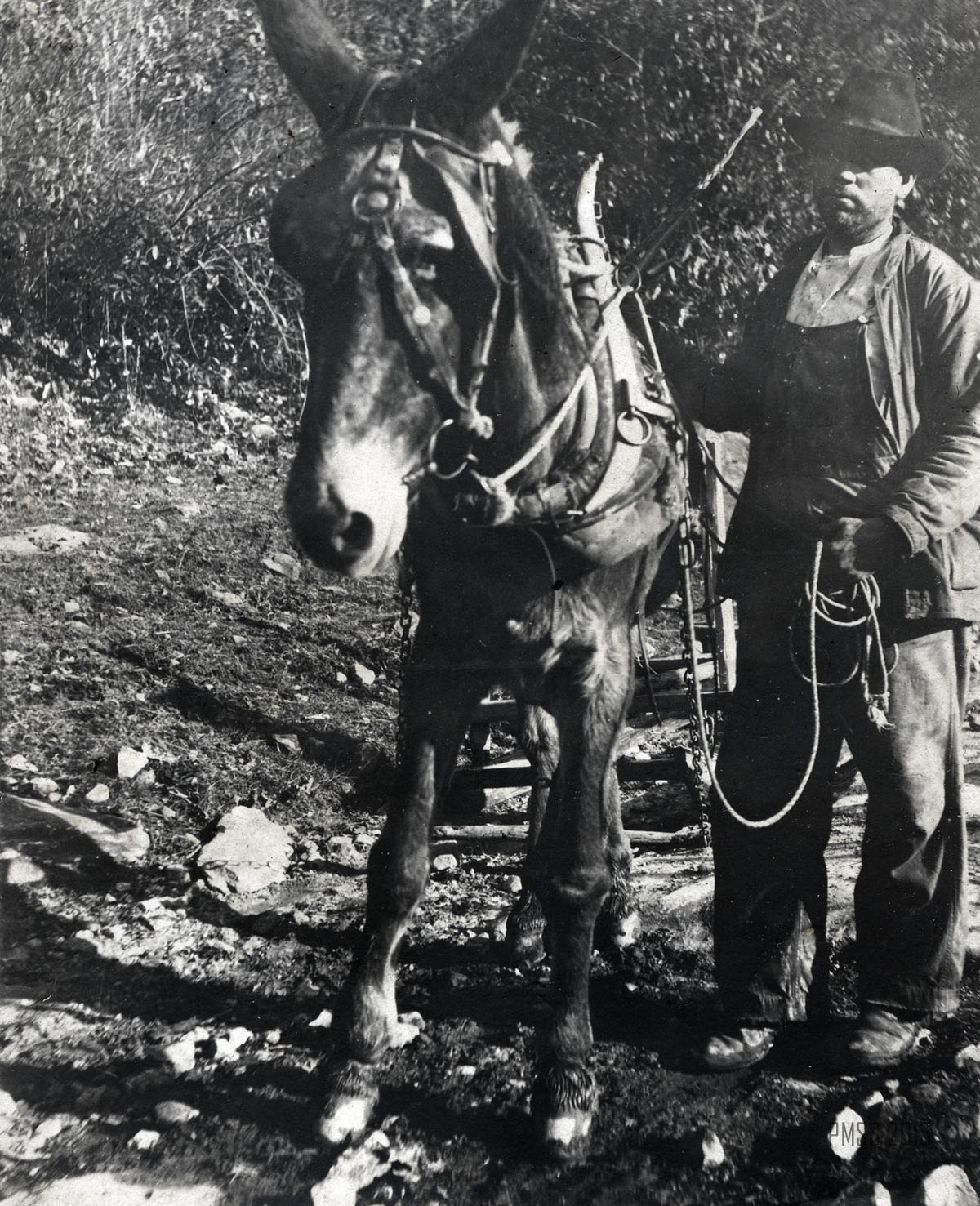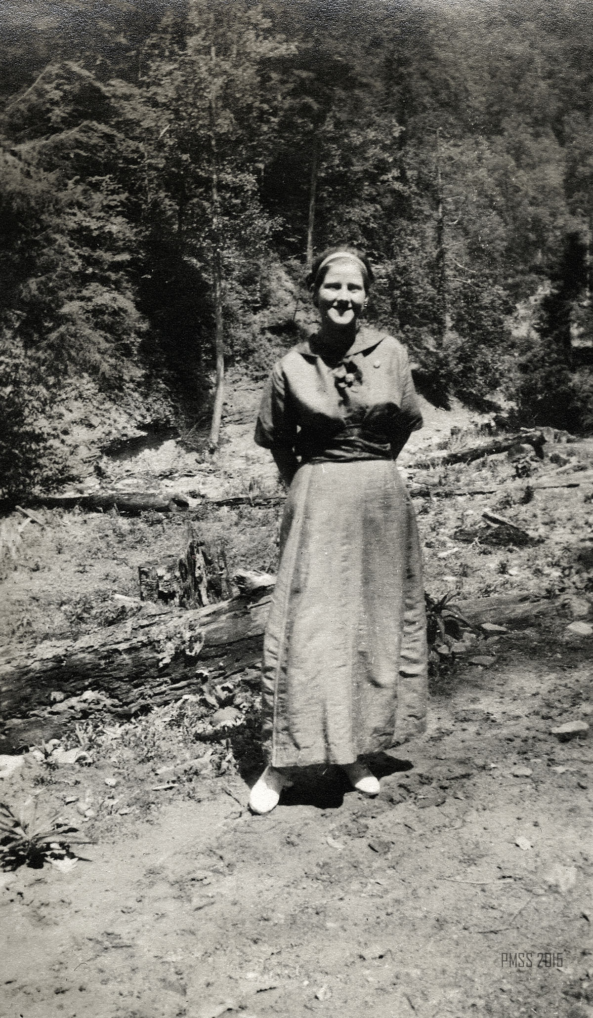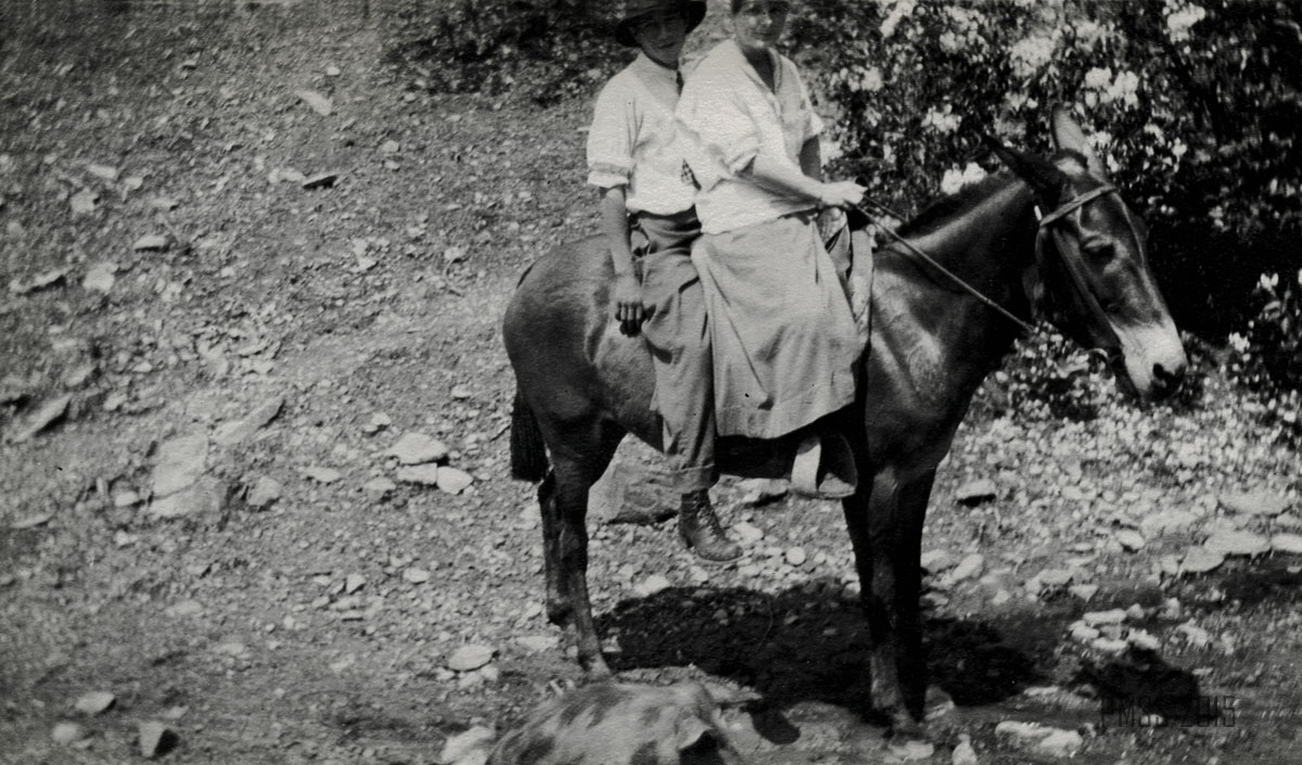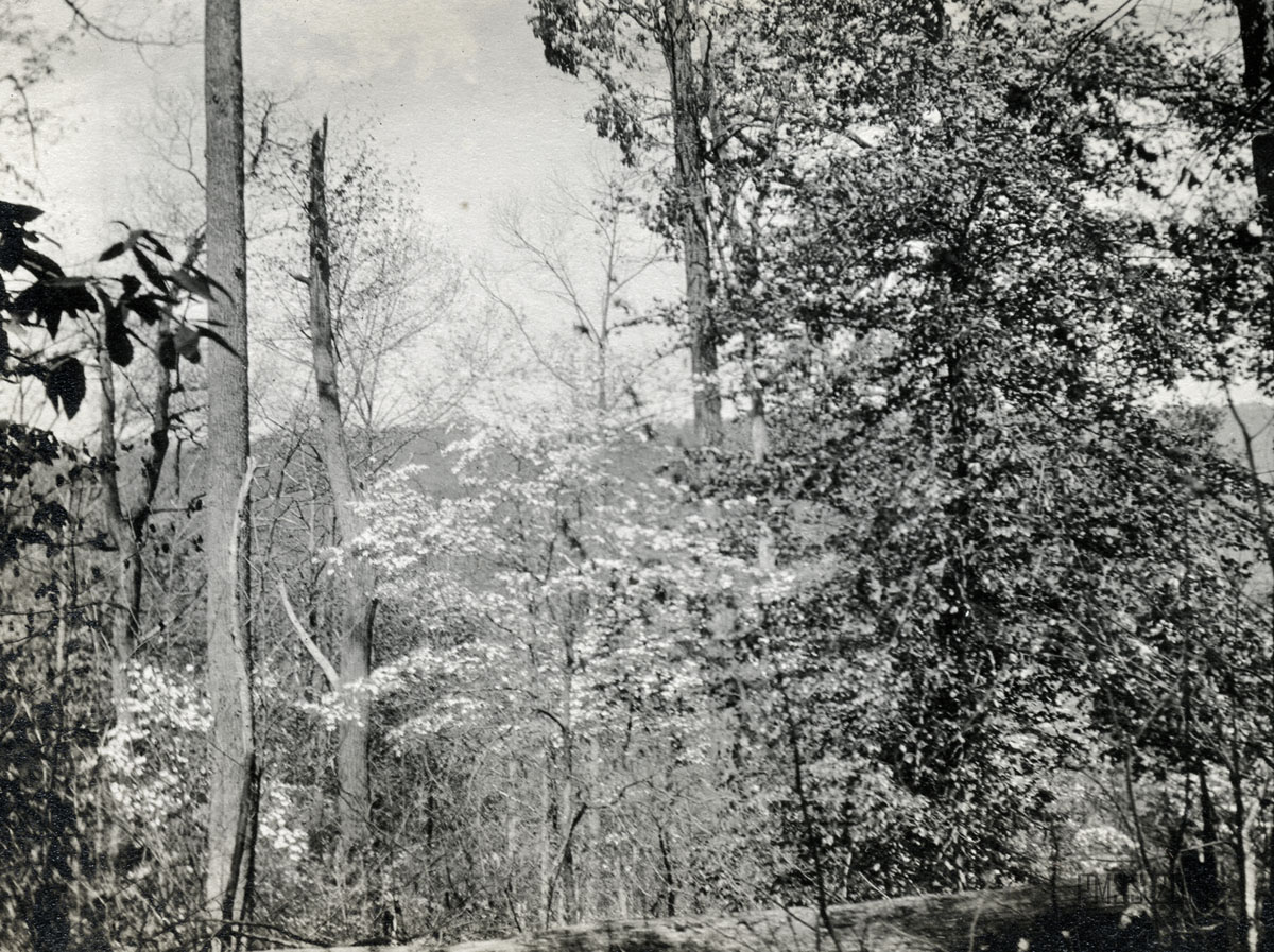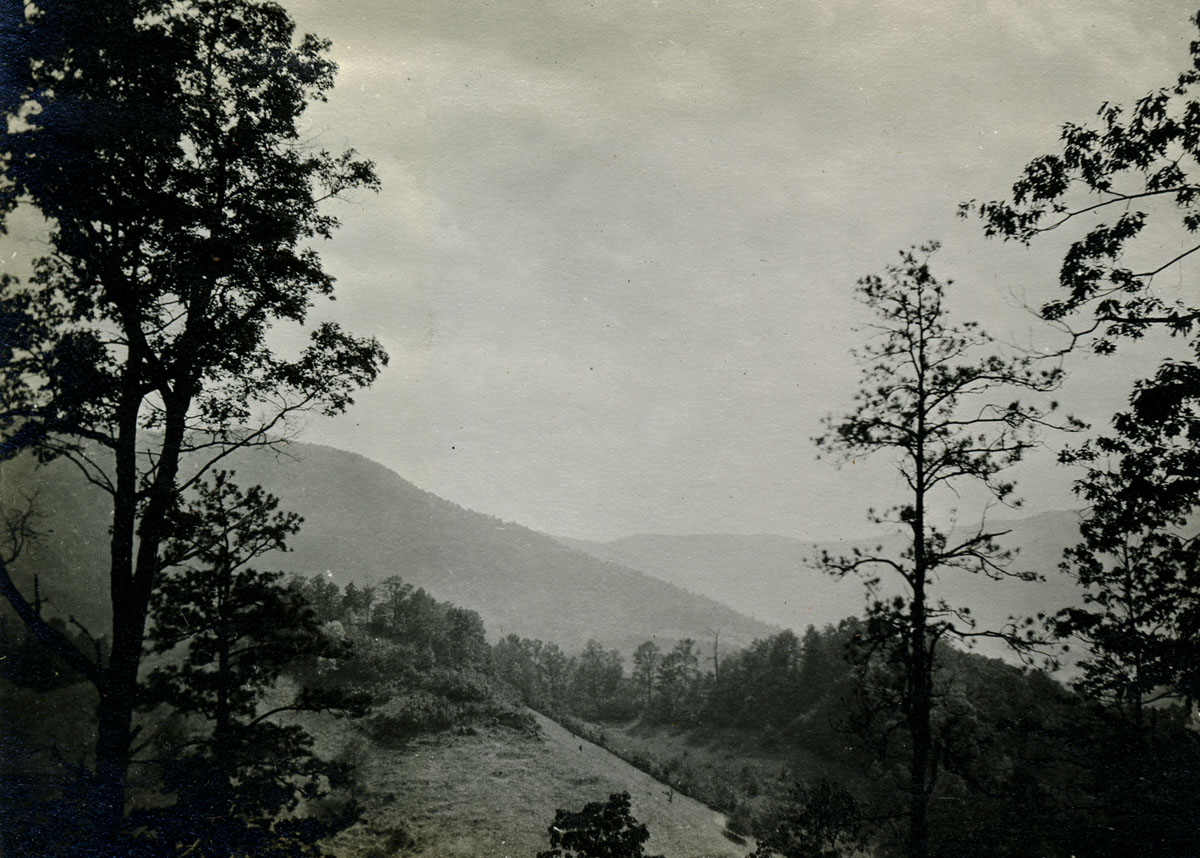 054b A lonesome pine. ; 055a View from Jack’s Gap. ; 055b The rock, Jack’s Gap. [Tree at left, large rock behind trees at right.]  ; 055c Dogwood on trail to Jack’s Gap.  ; 056a On the mountain top. Uncle Wm. Creech and “Old Mr. Man” – P.R. [Two older men: William Creech and Philip Roettinger sitting, Creech on left holding a cane, hat on the rock at left, Roettinger at right holding a walking stick.] ; 056b Old Mr. Man, Uncle William and Lizzie. [Philip Roettinger at left holding walking stick and plants, Elisabeth Roettinger in center holding plants, William Creech at right holding hat in hand.]  ; 057a Getting dinner at a “workin.” [Three women at left by a “teepee” of three logs, three women at a table of food at right, two boys in background.] ; 057b A water mill. [Two men: older man standing at left with arms crossed, younger man squatting at right with food to his mouth.] ; 058a Mary Ann Begley. [Young woman standing in a clearing with forest in the background.]  ; 058b Dot and Chester. [Man and woman on a mule.] ; 059a Dot and Chester, Carman, Miss Gaines, Olga, and Oscar. [Six men and women lined up on five horses and mules?; fence in background.] ; 059b Down Gabe’s Branch. [Four people: three riding on mules, one standing going down a forest trail.] ; 060a Uncle Lewis and Aunt Katie Creech, Poorfork. [Three women at left, an older man and woman, and two young girls; large building in back at right.] ; 060b Annie and the “lil” dog. [Young woman at left, dog jumping straight up at right, building in back.]