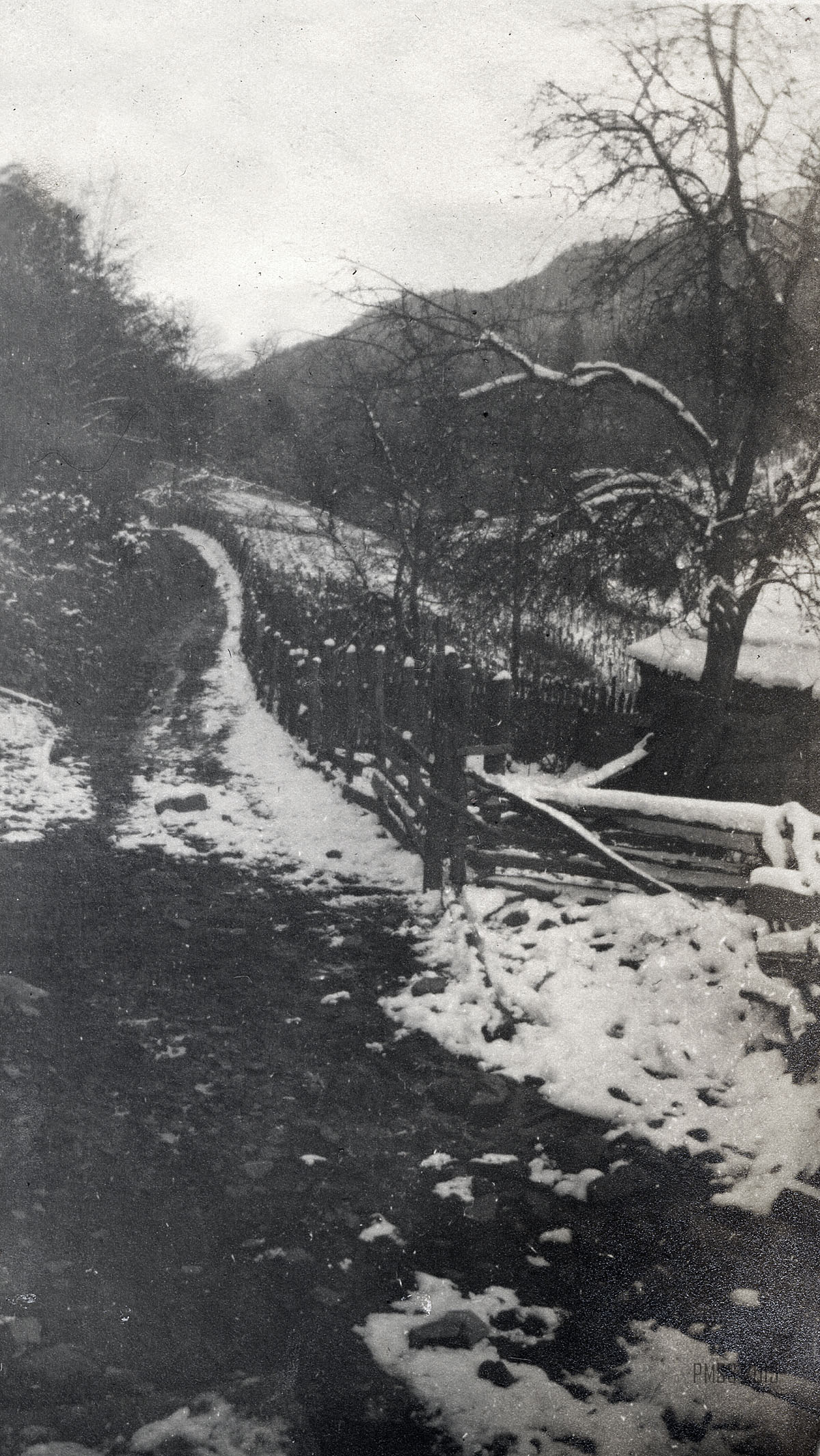 067a Columbus and Lizzie on the road to Hurricane Gap. Elisabeth Roettinger, Columbus Creech. [Woman at left holding walking stick, man at right holding small parcel, walking down a trail.]  ; 067b Ethel and Columbus, Poorfork and Black. Miss McCullough and Columbus. [Man and woman leaning against a wooden fence, dirt path in front, mountains in background.] ; 068a [Mountain view.] ;
